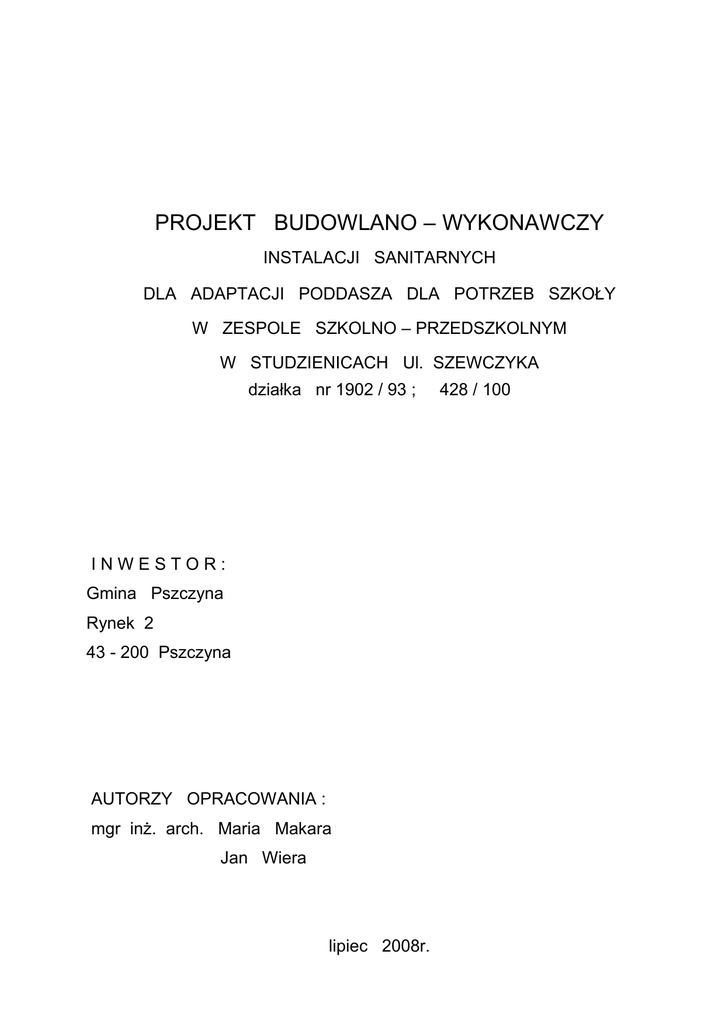 PROJEKT BUDOWLANO – WYKONAWCZY INSTALACJI SANITARNYCH DLA ADAPTACJI PODDASZA DLA POTRZEB SZKOŁY W ZESPOLE SZKOLNO – PRZEDSZKOLNYM W STUDZIENICACH Ul. SZEWCZYKA działka nr 1902 / 93 ; INWESTOR: Gmina Pszczyna Rynek 2 43 - 200 Pszczyna AUTORZY OPRACOWANIA : mgr inŜ. arch. Maria Makara Jan Wiera lipiec 2008r. 428 / 100 OPIS TECHNICZNY 1. Zakres opracowania Dla projektowanej adaptacji istniejącego poddasza dla potrzeb szkoły projektuje się rozbudowę istniejących w budynku szkoły instalacji wodociągowej, kanalizacyjnej i centralnego ogrzewania, oraz projektuje się rozbudowę instalacji hydrantowej. Wentylację poddasza projektuje się jako wyciągową mechaniczną. 2. Instalacja wodociągowo – kanalizacyjna Woda zimna na projektowane poddasze jest obecnie doprowadzona rurociągiem stalowym ocynkowanym 25mm – końcówka wyprowadzona przez strop przy kominie zakończona ślepo bez zaworu którą oznaczono na rysunku jako W1. Kanalizacja sanitarna na poddasze jest obecnie doprowadzona w postaci wyprowadzonego pionu Ŝeliwnego 110/75 do kominka wywiewnego odpowietrzającego sytuowanego ponad dachem budynku oznaczono na rysunku jako K1. 2.1. Zapotrzebowanie wody i ilość ścieków Średnie dobowe zapotrzebowanie wody 1,3m³ Średni dobowy zrzut ścieków 1,3m³/d Wypływ z punktów czerpalnych 2,15dm³/s Wymagane ciśnienie dla zapotrzebowania w wodę wynosi ok. 0,22 MPa 2.2. Instalacja wodociągowa Woda zimna : wykonać włączenie do istniejącego na poddaszu pionu W1 z uŜyciem zaworu odcinającego. Przewody rozprowadzające wodę zimą naleŜy wykonać z rur warstwowych systemowych PE o średnicach 1x20mm. Średnice przewodów wg części rysunkowej podejście do przyborów naleŜy wykonać za pomocą kształtek. Przewody naleŜy prowadzić pod posadzką oraz w bruzdach ścian budynku w rurze ochronnej, w warstwie podposadzkowej ocieplenia w otulinie z pianki poliuretanowej. Przejścia przewodów przez przegrody budowlane powinny być wykonane poprzez tuleje ochronne. Przestrzeń między rurą a tuleją winna być wypełniona materiałem elastycznym. Zasady montaŜu rur zgodnie z instrukcją montaŜu producenta systemu ; Woda ciepła : doprowadzenie do umywalek z zasobnika o pojemności 50dm³ podgrzewanego elektrycznie umieszczonego w sanitariacie chłopców. Podłączenie wody do zasobnika powinny być wykonane w sposób umoŜliwiający łatwe odłączenie urządzenia bez konieczności opróŜniania instalacji z wody. Na zasilaniu zimną wodą (przed zasobnikiem) musi być zainstalowana „grupa bezpieczeństwa z zaworem bezpieczeństwa o ciśnieniu otwarcia 10 bar”. NaleŜy wykonać odprowadzenie z zaworu bezpieczeństwa do kanalizacji. JeŜeli ciśnienie zasilania przekracza 4,8 bar naleŜy zastosować reduktor ciśnienia wody. Przewody rozprowadzające wodę ciepłą naleŜy wykonać z rur warstwowych systemowych PE o średnicach 1x16mm, podejście do przyborów naleŜy wykonać za pomocą kształtek. Średnice przewodów wg części rysunkowej. Przewody naleŜy prowadzić pod posadzką oraz w bruzdach ścian budynku w rurze ochronnej, w warstwie podposadzkowej ocieplenia w otulinie z pianki poliuretanowej. Przejścia przewodów przez przegrody budowlane powinny być wykonane poprzez tuleje ochronne. Przestrzeń między rurą a tuleją winna być wypełniona materiałem elastycznym. Zasady montaŜu rur zgodnie z instrukcją montaŜu producenta systemu . Wewnętrzna instalacja hydrantowa : na parterze, 1-szym i 2-gim piętrze budynku istniejąca instalacja z rur stalowych ocynkowanych DN50 i istniejące hydranty 50. Istniejące hydranty naleŜy wymienić na hydranty 25 z węŜem półsztywnym 20m. Na poddaszu naleŜy wykonać nową instalację hydrantową DN 25mm z hydrantami 25 wyposaŜonymi w wąŜ półsztywny długości 20,0m. Instalację naleŜy wykonać poprzez włączenie bezpośrednio przy istniejącym hydrancie na korytarzu 2-giego piętra i wyprowadzić jako pion W2 na poddasze. Przewody naleŜy wykonać z rur stalowych ocynkowanych, podejście do przyborów naleŜy wykonać za pomocą kształtek. Instalację wodociągową przeciwpoŜarową wykonać zgodnie z rozporządzeniem MSWiA z dnia 21.04.2006 w sprawie ochrony p-poŜ. budynków (Dz.U. nr 80, poz. 563) oraz EN671-1. Po montaŜu instalacji wody zimnej i ciepłej wykonać próbę szczelności i ciśnienia w tym zgodnie z wytycznymi dla systemów z rur PE. 2.3. Instalacja kanalizacyjna Odpływy z przyborów projektuje się z rur i kształtek PCW łączonych na kielichy z uszczelkami typu wargowego. Podejścia do przyborów sanitarnych montować pod podłogą i w grubości szkieletowych ścianek działowych. Średnica podejść i spadki – wg rysunków i obowiązujących norm. Odpływy włączyć do istniejącego pionu kanalizacyjnego – przebudowa pionu na całej wysokości poddasza i wyprowadzić ponad dach budynku oraz zakończyć rurą wywiewną w systemie rur Ŝeliwnych. 3. Instalacja centralnego ogrzewania Budynek szkoły jest obecnie ogrzewany za pomocą instalacji centralnego ogrzewania wodnego z pompą wymuszająca obieg z rozdziałem dolnym, gdzie czynnikiem grzewczym jest woda o parametrach 90/70 OC przygotowywana we własnej kotłowni w piwnicy budynku szkoły. Kocioł stalowy firmy Viessmann typu Vitogas Q=108kW z palnikiem gazowym. Zabezpieczenia kotła i instalacji naczyniem wzbiorczym systemu zamkniętego ( 200dm3 ). Całość procesu przygotowania ciepła jest sterowana automatycznie z czujnikami temperatury zewnętrznej (praca i przełączanie pomp obiegowych). Instalacja c.o. jest obecnie na poddasze doprowadzona w postaci wyprowadzonych pionów z rur stalowych ½” (pion powrotny wyprowadzony ponad strop zakończony na ślepo, pion zasilający poniŜej stropu zakończony zaworem odpowietrzającym) oznaczonych na rysunkach C1 – C7. Poddasze ogrzewane będzie w oparciu. Instalację zaprojektowano jako pompową dwururową, wodną instalację centralnego ogrzewania z grzejnikami płyto