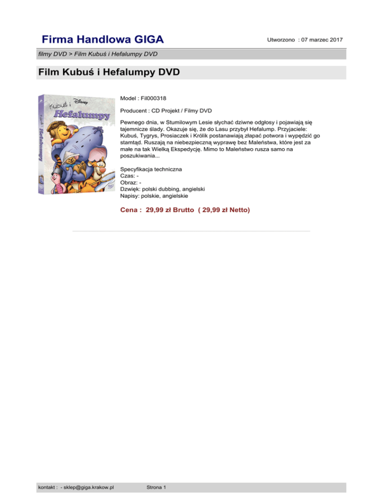 Firma Handlowa GIGA Utworzono : 07 marzec 2017 filmy DVD > Film Kubuś i Hefalumpy DVD Film Kubuś i Hefalumpy DVD Model : Fil000318 Producent : CD Projekt / Filmy DVD Pewnego dnia, w Stumilowym Lesie słychać dziwne odgłosy i pojawiają się tajemnicze ślady. Okazuje się, że do Lasu przybył Hefalump. Przyjaciele: Kubuś, Tygrys, Prosiaczek i Królik postanawiają złapać potwora i wypędzić go stamtąd. Ruszają na niebezpieczną wyprawę bez Maleństwa, które jest za małe na tak Wielką Ekspedycję. Mimo to Maleństwo rusza samo na poszukiwania... Specyfikacja techniczna Czas: Obraz: Dzwięk: polski dubbing, angielski Napisy: polskie, angielskie Cena : 29,99 zł Brutto ( 29,99 zł Netto) kontakt : - [email protected] Strona 1