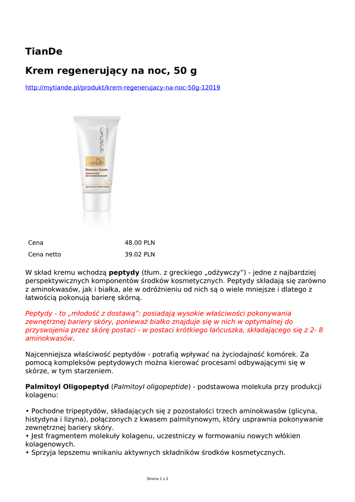 TianDe Krem regenerujący na noc, 50 g http://mytiande.pl/produkt/krem-regenerujacy-na-noc-50g-12019 Cena 48.00 PLN Cena netto 39.02 PLN W skład kremu wchodzą peptydy (tłum. z greckiego „odżywczy”) - jedne z najbardziej perspektywicznych komponentów środków kosmetycznych. Peptydy składają się zarówno z aminokwasów, jak i białka, ale w odróżnieniu od nich są o wiele mniejsze i dlatego z łatwością pokonują barierę skórną. Peptydy - to „młodość z dostawą”: posiadają wysokie właściwości pokonywania zewnętrznej bariery skóry, ponieważ białko znajduje się w nich w optymalnej do przyswojenia przez skórę postaci - w postaci krótkiego łańcuszka, składającego się z 2- 8 aminokwasów. Najcenniejsza właściwość peptydów - potrafią wpływać na życiodajność komórek. Za pomocą kompleksów peptydowych można kierować procesami odbywającymi się w skórze, w tym starzeniem. Palmitoyl Oligopeptyd (Palmitoyl oligopeptide) - podstawowa molekuła przy produkcji kolagenu: • Pochodne tripeptydów, składających się z pozostałości trzech aminokwasów (glicyna, histydyna i lizyna), połączonych z kwasem palmitynowym, który usprawnia pokonywanie zewnętrznej bariery skóry. • Jest fragmentem molekuły kolagenu, uczestniczy w formowaniu nowych włókien kolagenowych. • Sprzyja lepszemu wnikaniu aktywnych składników środków kosmetycznych. Strona 1 z 2 Caprooyl tetrapeptide-3 (Caprooyl tetrapeptide-3): • Składa się z krótkich łańcuszków czterech aminokwasów (histydyna, lizyna, glutamina, izolejcyna), połączonych z kwasem kapronowym. • Pomaga wzmocnić włókna kolagenowe i elastynowe. • Działa zmiękczająco i kojąco na skórę, sprzyja zmniejszaniu przebarwień. W skład kremu wchodzą: hydrolizowany jedwab, kwas hialuronowy i alantoina. Działanie: • Zmniejsza napięcie i stres skóry, nasycając ją cennymi substancjami odżywczymi. • Sprzyja regeneracji jednolitości struktury skóry, stymuluje odnowę komórkową, poprawiając skórę twarzy. • Podnosi poziom nawilżenia, sprzyjając wygładzeniu zmarszczek. Zastosowanie: Niewielką ilość kremu okrężnymi ruchami nałożyć na oczyszczoną skórę twarzy i szyi, wyłączając okolice oczu. Jest odpowiedni do każdego typu skóry po 30 roku życia. Rezultat: Zachowanie „kapitału zakładowego młodości” komórek skóry! Opakowanie: 50 g. Strona 2 z 2 Powered by TCPDF (www.tcpdf.org)