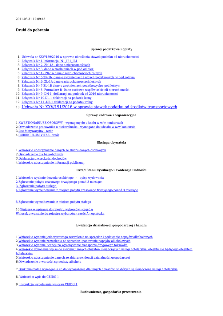 2011-05-31 12:09:43 Druki do pobrania Sprawy podatkowe i opłaty 1. 2. 3. 4. 5. 6. 7. 8. 9. 10. 11. 12. Uchwała nr XXV/189/2016 w sprawie określenia stawek podatku od nieruchomości Załącznik Nr 1-Informacja IN1_IR1_IL1 Załącznik Nr 2- ZN-1A - dane o nierucomościach Załącznik Nr 3- dane o zwolnieniach w pod.od nier. Załacznik Nr 4 - ZR-1A dane o nieruchomościach rolnych Załacznik Nr 5-ZR-1b dane o zwolnieniach i ulgach podatkowych_w pod.rolnym Załącznik Nr 6- ZL-1A dane o nieruchomosciach leśnych Załącznik Nr 7-ZL-1B dane o zwolnieniach podatkowychw pod.leśnym Załacznik Nr 8 -Formularz B- Dane osobowe współwłaścicieli nieruchomości Załącznik Nr 9 -DN-1 deklaracji na podatek od 2016 nieruchomosci Załącznik Nr 10-DL-1 deklaracji na podatek lesny Załącznik Nr 11 -DR-1 deklaracji na podatek rolny 13. Uchwała Nr XXV/191/2016 w sprawie stawek podatku od środków transportowych Sprawy kadrowe i organizacyjne 1.KWESTIONARIUSZ OSOBOWY - wymagany do udziału w w/w konkursach 2.Oświadczenie pracownika o niekaralności - wymagane do udziału w w/w konkursie 3.List Motywacyjny - wzór 4.CURRICULUM VITAE - wzór Obsługa obywatela 1.Wniosek o udostępnienie danych ze zbioru danych osobowych 2.Oświadczenie dla bezrobotnych 3.Deklaracja o wysokości dochodów 4.Wniosek o udostępnienie informacji publicznej Urząd Stanu Cywilnego i Ewidencja Ludności 1.Wniosek o wydanie dowodu osobistego - opisy wydawania 2.Zgłoszenie pobytu czasowego trwającego ponad 3 miesiące 3. Zgłoszenie pobytu stałego 4.Zgłoszenie wymeldowania z miejsca pobytu czasowego trwającego ponad 3 miesiące 5.Zgłoszenie wymeldowania z miejsca pobytu stałego 10.Wniosek o wpisanie do rejestru wyborców - część A Wniosek o wpisanie do rejestru wyborców - część A - opisówka Ewidencja działalności gospodarczej i handlu 1.Wniosek o wydanie jednorazowego zezwolenia na sprzedaż i podawanie napojów alkoholowych 2.Wniosek o wydanie zezwolenia na sprzedaż i podawanie napojów alkoholowych 3.Wniosek o wydanie licencji na wykonywanie transportu drogowego taksówką 4.Wniosek o dokonanie wpisu do ewidencji innych obiektów świadczących usługi hotelarskie, obiektu nie będącego obiektem hotelarskim 5.Wniosek o udostępnienie danych ze zbioru ewidencji działalności gospodarczej 6.Oświadczenie o wartości sprzedaży alkoholu 7.Druk minimalne wymagania co do wyposażenia dla innych obiektów, w których są świadczone usługi hotelarskie 8. Wniosek o wpis do CEIDG 1 9. Instrukcja wypełniania wniosku CEIDG 1 Budownictwo, gospodarka przestrzenia 1.Podanie o wydanie zaświadczenia o przeznaczeniu terenu w miejscowym Planie Zagospodarowania Przestrzennego gminy Stegna 2.Wniosek o ustalenie warunków zabudowy (Decyzja o warunkach zabudowy) 3. Wniosek o wydanie wypisu i wyrysu z miejscowego planu zagospodarowania przestrzennego 4.Wniosek o rozłożenie opłaty adiacenckiej na raty 5. Wniosek o wydanie decyzji o środowiskowych uwarunkowaniach Budowa dróg i mostów - wnioski realizowane indywidualnie w urzędzie Rolnictwo, leśnictwo, ochrona środowska, gospodarka odpadami 1.Wniosek o wydanie zezwolenia na wycięcie drzew i krzewów 2.Wniosek o zwrot podatku akcyzowego 3. Deklaracja o wysokości opłaty za gospodarowanie odpadami komunalnymi http://www.minrol.gov.pl/pol/Aktowka/Ogloszenia/Zwrot-podatku-akcyzowego Gospodarka ziemią - geodezja 1.Wniosek o nadanie numeru porządkowego nieruchomości (budynku) PDF 2.Wniosek o wydanie zaświadczenia o pracy w gospodarstwie rolnym WORD Unia Europejska Najważniejsze linki: 1.Informacje o Funduszach Strukturalnych w Polsce: www.funduszestrukturalne.gov.pl Informacje dla przedsiębiorców (prowadzących działalność gospodarczą przez okres dłuższy niż 3 lata) - Sektorowy Program Operacyjny Wzrost Konkurencyjności Przedsiębiorstw (SPO - WKP): Agencja Rozwoju Pomorza S.A. będąca Regionalną Instytucją Finansującą ul. Piwna 36/39 80-831 Gdańsk tel. (058) 3233100, (058) 3233101 fax. (058) 3011341 adres internetowy:www.arpg.gda.pl/arp_nowe/strona.php?id=32 2.Informacje dla przedsiębiorców (prowadzących działalność gospodarczą przez okres krótszy niż 3 lata) - Zintegrowany Program Operacyjny Rozwoju Regionalnego (ZPORR), Działanie 3.4 Zespół Informacji i Promocji ZPORR Departament Programów Regionalnych Urząd Marszałkowski Województwa Pomorskiego tel. (058) 320 70 46 fax. (058) 320 70 42 adres internetowy:www.dpr.woj-pomorskie.pl 3.Informacje dla rolników: Ministerstwo Rolnictwa i Rozwoju Wsi adres internetowy:www.minrol.gov.pl Agencja Restrukturyzacji i Modernizacji Rolnictwa adres internetowy:www.arimr.gov.pl Programy, które musisz posiadać by móc otworzyć powyższe dokumenty Excel Viewer 2003 PL Word Viewer 97/2000 PowerPoint Viewer 2003 PL Adobe Reader 7.0.5 XP Informacje o artykule Autor: Zredagował(a): admin admin Data powstania: 31.05.2011 12:09 Data ostatniej modyfikacji: 29.12.2016 15:22 Liczba wyświetleń: Wydrukowano z serwisu: Wydrukowano dnia: 18034 stegna.pl 2017-03-07 08:30:52