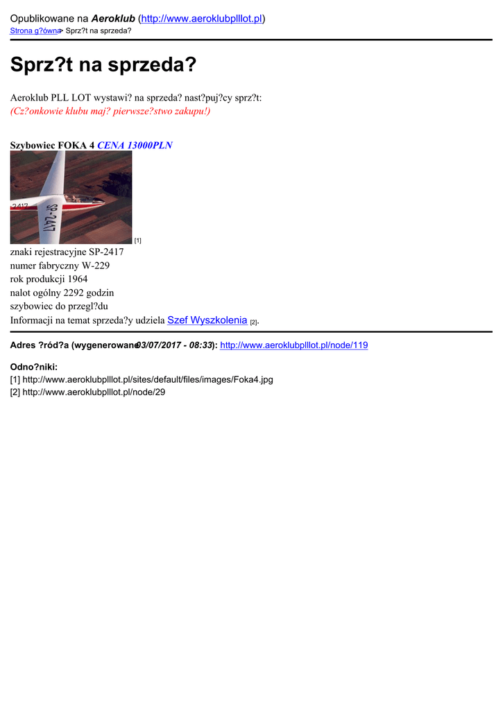 Opublikowane na Aeroklub (http://www.aeroklubplllot.pl) Strona g?ówna> Sprz?t na sprzeda? Sprz?t na sprzeda? Aeroklub PLL LOT wystawi? na sprzeda? nast?puj?cy sprz?t: (Cz?onkowie klubu maj? pierwsze?stwo zakupu!) Szybowiec FOKA 4 CENA 13000PLN [1] znaki rejestracyjne SP-2417 numer fabryczny W-229 rok produkcji 1964 nalot ogólny 2292 godzin szybowiec do przegl?du Informacji na temat sprzeda?y udziela Szef Wyszkolenia [2]. Adres ?ród?a (wygenerowane03/07/2017 - 08:33): http://www.aeroklubplllot.pl/node/119 Odno?niki: [1] http://www.aeroklubplllot.pl/sites/default/files/images/Foka4.jpg [2] http://www.aeroklubplllot.pl/node/29