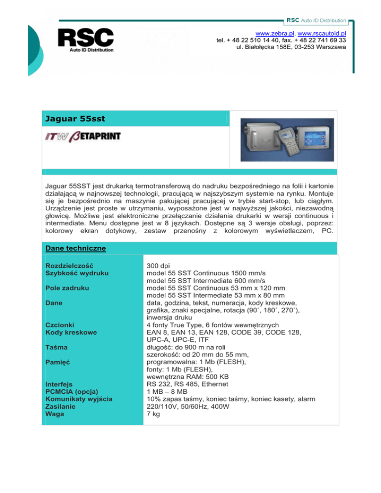 www.zebra.pl, www.rscautoid.pl tel. + 48 22 510 14 40, fax. + 48 22 741 69 33 ul. Białołęcka 158E, 03-253 Warszawa Jaguar 55sst Jaguar 55SST jest drukarką termotransferową do nadruku bezpośredniego na folii i kartonie działającą w najnowszej technologii, pracującą w najszybszym systemie na rynku. Montuje się je bezpośrednio na maszynie pakującej pracującej w trybie start-stop, lub ciągłym. Urządzenie jest proste w utrzymaniu, wyposażone jest w najwyższej jakości, niezawodną głowicę. Możliwe jest elektroniczne przełączanie działania drukarki w wersji continuous i intermediate. Menu dostępne jest w 8 językach. Dostępne są 3 wersje obsługi, poprzez: kolorowy ekran dotykowy, zestaw przenośny z kolorowym wyświetlaczem, PC. Dane techniczne Rozdzielczość Szybkość wydruku Pole zadruku Dane Czcionki Kody kreskowe Taśma Pamięć Interfejs PCMCIA (opcja) Komunikaty wyjścia Zasilanie Waga 300 dpi model 55 SST Continuous 1500 mm/s model 55 SST Intermediate 600 mm/s model 55 SST Continuous 53 mm x 120 mm model 55 SST Intermediate 53 mm x 80 mm data, godzina, tekst, numeracja, kody kreskowe, grafika, znaki specjalne, rotacja (90˚, 180˚, 270˚), inwersja druku 4 fonty True Type, 6 fontów wewnętrznych EAN 8, EAN 13, EAN 128, CODE 39, CODE 128, UPC-A, UPC-E, ITF długość: do 900 m na roli szerokość: od 20 mm do 55 mm, programowalna: 1 Mb (FLESH), fonty: 1 Mb (FLESH), wewnętrzna RAM: 500 KB RS 232, RS 485, Ethernet 1 MB – 8 MB 10% zapas taśmy, koniec taśmy, koniec kasety, alarm 220/110V, 50/60Hz, 400W 7 kg