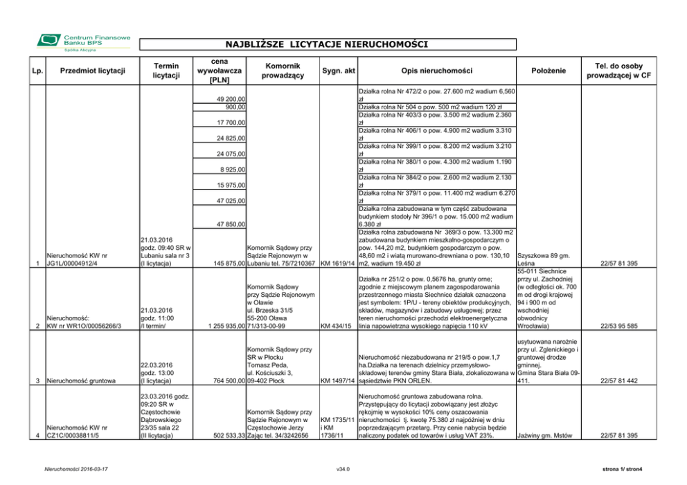 NAJBLIŻSZE LICYTACJE NIERUCHOMOŚCI Lp. Przedmiot licytacji Termin licytacji cena wywoławcza [PLN] 49 200,00 900,00 17 700,00 24 825,00 24 075,00 8 925,00 15 975,00 47 025,00 47 850,00 1 Nieruchomość KW nr JG1L/00004912/4 21.03.2016 godz. 09:40 SR w Lubaniu sala nr 3 (I licytacja) 2 Nieruchomość: KW nr WR1O/00056266/3 21.03.2016 godz. 11:00 /I termin/ 3 4 Nieruchomość gruntowa 22.03.2016 godz. 13:00 (I licytacja) Nieruchomość KW nr CZ1C/00038811/5 23.03.2016 godz. 09:20 SR w Częstochowie Dąbrowskiego 23/35 sala 22 (II licytacja) Nieruchomości 2016-03-17 145 875,00 1 255 935,00 Komornik prowadzący Sygn. akt Opis nieruchomości Położenie Działka rolna Nr 472/2 o pow. 27.600 m2 wadium 6,560 zł Działka rolna Nr 504 o pow. 500 m2 wadium 120 zł Działka rolna Nr 403/3 o pow. 3.500 m2 wadium 2.360 zł Działka rolna Nr 406/1 o pow. 4.900 m2 wadium 3.310 zł Działka rolna Nr 399/1 o pow. 8.200 m2 wadium 3.210 zł Działka rolna Nr 380/1 o pow. 4.300 m2 wadium 1.190 zł Działka rolna Nr 384/2 o pow. 2.600 m2 wadium 2.130 zł Działka rolna Nr 379/1 o pow. 11.400 m2 wadium 6.270 zł Działka rolna zabudowana w tym część zabudowana budynkiem stodoły Nr 396/1 o pow. 15.000 m2 wadium 6.380 zł Działka rolna zabudowana Nr 369/3 o pow. 13.300 m2 zabudowana budynkiem mieszkalno-gospodarczym o Komornik Sądowy przy pow. 144,20 m2, budynkiem gospodarczym o pow. Sądzie Rejonowym w 48,60 m2 i wiatą murowano-drewniana o pow. 130,10 Szyszkowa 89 gm. Lubaniu tel. 75/7210367 KM 1619/14 m2, wadium 19.450 zł Leśna 55-011 Siechnice Działka nr 251/2 o pow. 0,5676 ha, grunty orne; prrzy ul. Zachodniej Komornik Sądowy (w odległości ok. 700 zgodnie z miejscowym planem zagospodarowania przy Sądzie Rejonowym przestrzennego miasta Siechnice działak oznaczona m od drogi krajowej w Oławie jest symbolem: 1P/U - tereny obiektów produkcyjnych, 94 i 900 m od ul. Brzeska 31/5 składów, magazynów i zabudowy usługowej; przez wschodniej 55-200 Oława teren nieruchomości przechodzi elektroenergetyczna obwodnicy 71/313-00-99 KM 434/15 linia napowietrzna wysokiego napięcia 110 kV Wrocławia) Tel. do osoby prowadzącej w CF 22/57 81 395 22/53 95 585 Komornik Sądowy przy SR w Płocku Tomasz Peda, ul. Kościuszki 3, 764 500,00 09-402 Płock usytuowana narożnie przy ul. Zglenickiego i gruntowej drodze Nieruchomość niezabudowana nr 219/5 o pow.1,7 gminnej. ha.Działka na terenach dzielnicy przemysłowoskładowej terenów gminy Stara Biała, zlokaliozowana w Gmina Stara Biała 09KM 1497/14 sąsiedztwie PKN ORLEN. 411. 22/57 81 442 Komornik Sądowy przy Sądzie Rejonowym w Częstochowie Jerzy 502 533,33 Zając tel. 34/3242656 Nieruchomość gruntowa zabudowana rolna. Przystępujący do licytacji zobowiązany jest złożyc rękojmię w wysokości 10% ceny oszacowania KM 1735/11 nieruchomości tj. kwotę 75.380 zł najpóźniej w dniu i KM poprzedzającym przetarg. Przy cenie nabycia będzie 1736/11 naliczony podatek od towarów i usług VAT 23%. 22/57 81 395 v34.0 Jaźwiny gm. Mstów strona 1/ stron4 NAJBLIŻSZE LICYTACJE NIERUCHOMOŚCI Lp. 5 6 7 8 9 Przedmiot licytacji Termin licytacji Nieruchomość KW nr CZ1C/00038811/5 23.03.2016 godz. 10:20 SR w Częstochowie Dąbrowskiego 23/35 sala 22 (II licytacja) Nieruchomość KW nr KA1P/00056719/7 30.03.2016 godz. 12:30 SR w Pszczynie sala 118 (II licytacja) cena wywoławcza [PLN] Komornik prowadzący Komornik Sądowy przy Sądzie Rejonowym w Częstochowie Jerzy 2 381 600,00 Zając tel. 34/3242656 Sygn. akt Nieruchomość gruntowa zabudowana. Przystępujący do licytacji zobowiązany jest złożyc rękojmię w wysokości 10% ceny oszacowania nieruchomości tj. KM 1735/11 kwotę 357.240 zł najpóźniej w dniu poprzedzającym i KM przetarg. Przy cenie nabycia będzie naliczony podatek 1736/11 od towarów i usług VAT 23%. Komornik Sądowy przy Sądzie Rejonowym w Ostrowcu Świętokrzyskim Małgoprzata Pakaszewska tel. 1 594 080,00 41/3341226 Nieruchomość zabudowana obręb 19 arkusz 1 działka nr 114/7 o pow. 273 m2. Przedmiotowa nieruchomość zabudowana jest budynkiem handlowo-usługowym, parterowym z poddaszem użytkowym, całkowicie podpiwniczonym o pow. użytkowej 498,87 m2. Budynek o konstrukcji tradycyjnej murowanej z cegły i bloczków gazobetonowych z dachem o konstrukcji drewnianej pokrytwm blachą trapezową. Przystępujący do licytacji zobowiązany jest złożyć rękojmię w wysokości 1/10 części sumy oszacowania tj. 212.544 zł KM 897/15 w dniu poprzedzającym przetarg. Działka nr 159 o pow. 0,1022 ha zabudowana budynkiem mieszkalnym jednorodzinnym. Przystępujący do licytacji zobowiązany jest złożyc rękojmię w wysokości 10% ceny oszacowania nieruchomości tj. kwoty 61.530 zł najpóźniej w dniu KM 2003/13 poprzedzającym przetarg. Nieruchomość KW nr KI1O/00032210/8 Nieruchomość KW nr SW1Z/00041543/8 04.04.2016 godz. 12:00 SR w Ząbkowicach Śląskich sala nr 23 (I licytacja) Komornik Sądowy przy Sądzie Rejonowym w Ząbkowicach Śląskich 461 475,00 Marek Kupść 06.04.2016 godz. 09:00 (II licytacja) Komornik Sądowy przy Sądzie Rejonowym w Tomaszowie Mazowieckim Aleksandra Błasiak Żereń pl. Kościuszki 13 97-200 Tomaszów Mazowiecki 238 041,33 tel. 44/724-59-79 KM 2001/13 Nieruchomości 2016-03-17 Położenie Jaźwiny gm. Mstów Prawo użytkowania wieczystego gruntu, działka gruntu nr 2653/31 o pow. 13794 m2. Przystępujący do licytacji zobowiązany jest złożyc rękojmię w wysokości 10% Komornik Sądowy przy Sądzie Rejonowym w ceny oszacowania nieruchomości tj. kwoty 164.968,60 Studzienice ul. 433 124,00 Pszczynie Tomasz Gleń KM 1149/13 zł najpóźniej w dniu poprzedzającym przetarg. Jaskółek 31.03.2016 godz. 12:00 SR w Ostrowcu Świętokrzyskim (I licytacja) Nieruchomość KW nr PT1T/00054420/2 Opis nieruchomości v34.0 Spółdzielcze własnościowe prawo do lokalu użytkowego nr 7, składającego się z jednego pomieszczenia o pow. 94,32 m2, wpisany do rejestru lokali własnościowych SM "PRZODOWN