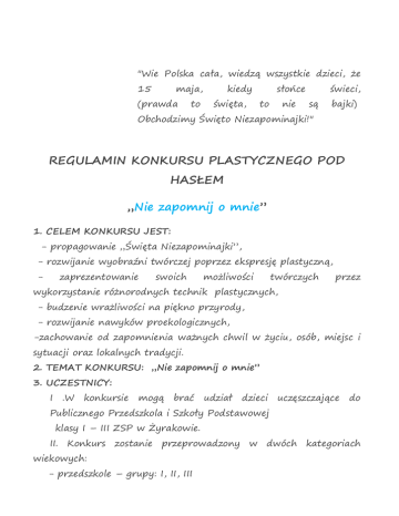 "Wie Polska cała, wiedzą wszystkie dzieci, że 15 maja, (prawda to kiedy święta, słońce to nie świeci, są bajki) Obchodzimy Święto Niezapominajki!" REGULAMIN KONKURSU PLASTYCZNEGO POD HASŁEM „Nie zapomnij o mnie” 1. CELEM KONKURSU JEST: - propagowanie „Święta Niezapominajki”, - rozwijanie wyobraźni twórczej poprzez ekspresję plastyczną, - zaprezentowanie swoich możliwości twórczych przez wykorzystanie różnorodnych technik plastycznych, - budzenie wrażliwości na piękno przyrody, - rozwijanie nawyków proekologicznych, -zachowanie od zapomnienia ważnych chwil w życiu, osób, miejsc i sytuacji oraz lokalnych tradycji. 2. TEMAT KONKURSU: „Nie zapomnij o mnie” 3. UCZESTNICY: I .W konkursie mogą brać udział dzieci uczęszczające do Publicznego Przedszkola i Szkoły Podstawowej klasy I – III ZSP w Żyrakowie. II. Konkurs zostanie przeprowadzony w dwóch kategoriach wiekowych: - przedszkole – grupy: I, II, III - szkoła podstawowa – klasy: I - III. 4. WARUNKI UCZESTNICTWA: I. Warunkiem udziału w konkursie jest wykonanie pracy plastycznej związanej tematycznie z hasłem konkursu. II. Prace muszą być wykonane indywidualnie (zbiorowe nie będą oceniane). III. Format pracy dowolny. IV. Technika dowolna. V. W pracy musi być zawarty motyw niezapominajki. VI. Każda zgłoszona do konkursu praca plastyczna powinna zawierać wypisane na odwrocie informacje: imię i nazwisko oraz wiek autora pracy, imię i nazwisko opiekuna, pełną nazwę przedszkola lub szkoły podstawowej. 5. TERMIN I WARUNKI DOSTARCZANIA PRAC: - prace należy dostarczyć do organizatora w terminie do 16.05.2015r. - prace dostarczone w późniejszym terminie nie będą oceniane, - prace konkursowe nie podlegają zwrotowi i przechodzą na własność organizatora. 6. ZASADY PRZYZNAWANIA NAGRÓD I OCENY PRAC: I. Zwycięzców konkursu wyłoni powołana w tym celu Komisja Konkursowa. II. Komisję powołuje Organizator. III. Komisja Konkursowa oceniając prace dzieci, weźmie pod uwagę następujące kryteria: - zgodność tematyki wykonanej pracy z hasłem przewodnim konkursu, - oryginalność ujęcia tematu, - estetykę wykonania pracy, - pomysłowość . IV. Ogłoszenie wyników, wręczenie nagród oraz otwarcie wystawy pokonkursowej nastąpi 17.05.2015r. w sali teatralnej ZSP w Żyrakowie. 7. KOMUNIKACJA: Dodatkowych informacji udzielają organizatorzy konkursu, panie: Irena Pisarz, Jolanta Artwik i Kinga Czeluśniak oraz pan Krzysztof Tuszyński. SERDECZNIE ZAPRASZAMY DO UDZIAŁU W KONKURSIE!