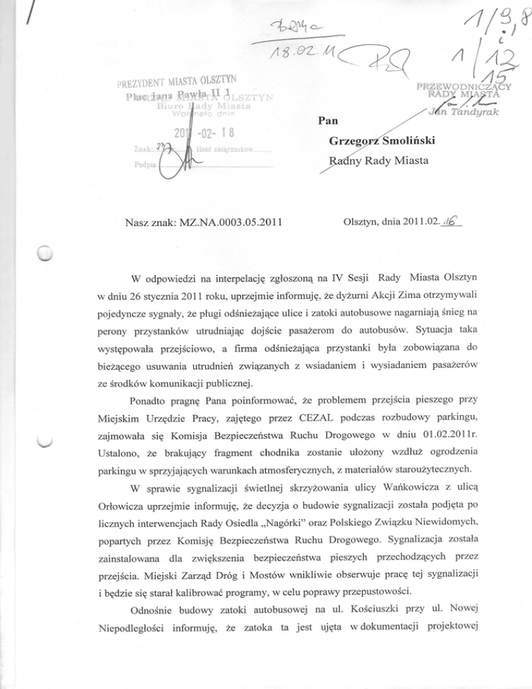 / PREZYDENT MIASTA OLSZTYN Plia'R:łMa. !ląw~a,lI 6LSZTYN BiurO Vlpł' I ady M;asta nęło dni,; Pan 201 -02- 1 8 . ilość zalączmkow .. ""'. Olsztyn, dnia 2011.02._,1_.6'_' Nasz znak: MZ.NA.0003.05.2011 W odpowiedzi na interpelację zgłoszoną na IV Sesji Rady Miasta Olsztyn w dniu 26 stycznia 2011 roku, uprzejmie informuję, że dyżurni Akcji Zima otrzymywali pojedyncze sygnały, że pługi odśnieżające ulice i zatoki autobusowe nagarniają śnieg na perony przystanków występowała utrudniając przejściowo, dojście pasażerom a firma odśnieżająca do autobusów. przystanki bieżącego usuwania utrudnień związanych z wsiadaniem Sytuacja taka była zobowiązana i wysiadaniem do pasażerów ze środków komunikacji publicznej. Ponadto pragnę Pana poinformować, Miejskim Urzędzie że problemem przejścia pIeszego przy Pracy, zajętego przez CEZAL podczas zajmowała się Komisja Ustalono, że brakujący Bezpieczeństwa fragment rozbudowy Ruchu Drogowego chodnika zostanie parkingu, w dniu 01.02.20l1r. ułożony wzdłuż ogrodzenia parkingu w sprzyjających warunkach atmosferycznych, z materiałów staroużytecznych. W sprawie sygnalizacji świetlnej skrzyżowania ulicy Wańkowicza z ulicą Orłowicza uprzejmie informuję, że decyzja o budowie sygnalizacji została podjęta po licznych interwencjach Rady Osiedla "Nagórki" oraz Polskiego Związku Niewidomych, popartych przez Komisję Bezpieczeństwa zainstalowana dla zwiększenia Ruchu Drogowego. bezpieczeństwa pieszych Sygnalizacja została przechodzących przez przejścia. Miejski Zarząd Dróg i Mostów wnikliwie obserwuje pracę tej sygnalizacji i będzie się starał kalibrować programy, w celu poprawy przepustowości. Odnośnie Niepodległości budowy zatoki autobusowej informuję, że zatoka ta jest na ul. Kościuszki ujęta przy ul. Nowej w dokumentacji projektowej przebudowy ul. Kościuszki. W budżecie l1)iasta na rok 2011 nie zaplanowano środków finansowych na przebudowę tej ulicy. I . 'X.poważamem Do wiadomości: J. Biuro Rady Miasta 2. ala T MIASTA