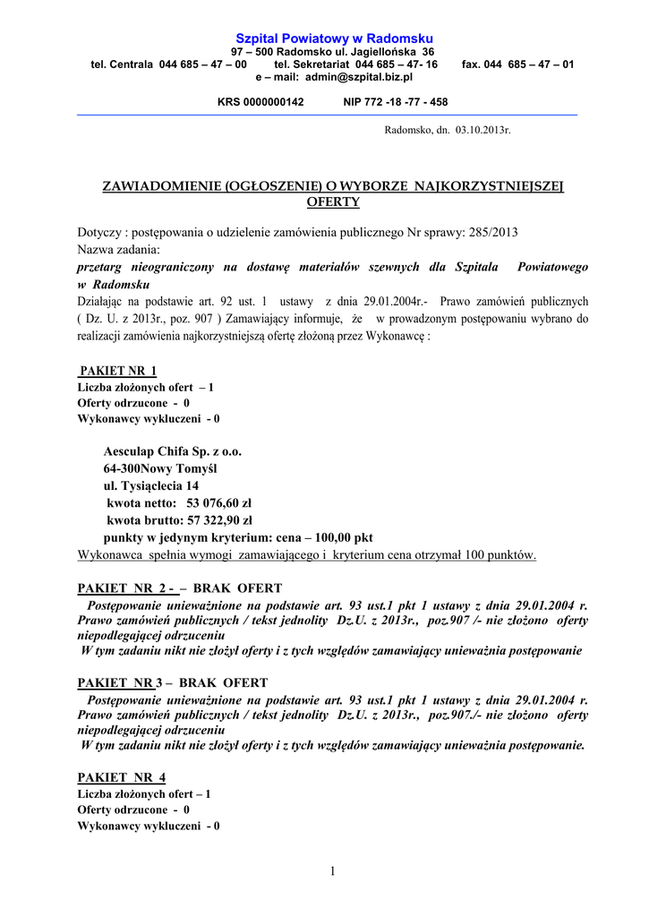 Szpital Powiatowy w Radomsku 97 – 500 Radomsko ul. Jagiellońska 36 tel. Centrala 044 685 – 47 – 00 tel. Sekretariat 044 685 – 47- 16 e – mail: [email protected] KRS 0000000142 fax. 044 685 – 47 – 01 NIP 772 -18 -77 - 458 Radomsko, dn. 03.10.2013r. ZAWIADOMIENIE (OGŁOSZENIE) O WYBORZE NAJKORZYSTNIEJSZEJ OFERTY Dotyczy : postępowania o udzielenie zamówienia publicznego Nr sprawy: 285/2013 Nazwa zadania: przetarg nieograniczony na dostawę materiałów szewnych dla Szpitala Powiatowego w Radomsku Działając na podstawie art. 92 ust. 1 ustawy z dnia 29.01.2004r.- Prawo zamówień publicznych ( Dz. U. z 2013r., poz. 907 ) Zamawiający informuje, że w prowadzonym postępowaniu wybrano do realizacji zamówienia najkorzystniejszą ofertę złożoną przez Wykonawcę : PAKIET NR 1 Liczba złożonych ofert – 1 Oferty odrzucone - 0 Wykonawcy wykluczeni - 0 Aesculap Chifa Sp. z o.o. 64-300Nowy Tomyśl ul. Tysiąclecia 14 kwota netto: 53 076,60 zł kwota brutto: 57 322,90 zł punkty w jedynym kryterium: cena – 100,00 pkt Wykonawca spełnia wymogi zamawiającego i kryterium cena otrzymał 100 punktów. PAKIET NR 2 - – BRAK OFERT Postępowanie unieważnione na podstawie art. 93 ust.1 pkt 1 ustawy z dnia 29.01.2004 r. Prawo zamówień publicznych / tekst jednolity Dz.U. z 2013r., poz.907 /- nie złożono oferty niepodlegającej odrzuceniu W tym zadaniu nikt nie złożył oferty i z tych względów zamawiający unieważnia postępowanie PAKIET NR 3 – BRAK OFERT Postępowanie unieważnione na podstawie art. 93 ust.1 pkt 1 ustawy z dnia 29.01.2004 r. Prawo zamówień publicznych / tekst jednolity Dz.U. z 2013r., poz.907./- nie złożono oferty niepodlegającej odrzuceniu W tym zadaniu nikt nie złożył oferty i z tych względów zamawiający unieważnia postępowanie. PAKIET NR 4 Liczba złożonych ofert – 1 Oferty odrzucone - 0 Wykonawcy wykluczeni - 0 1 Aesculap Chifa Sp. z o.o. 64-300Nowy Tomyśl ul. Tysiąclecia 14 kwota netto: 9 072,00 zł kwota brutto: 9 797,75 zł punkty w jedynym kryterium: cena – 100,00 pkt Wykonawca spełnia wymogi zamawiającego i w kryterium cena otrzymał punków 100,00 PAKIET NR 5 Liczba złożonych ofert – 1 Oferty odrzucone - 0 Wykonawcy wykluczeni - 0 Aesculap Chifa Sp. z o.o. 64-300Nowy Tomyśl ul. Tysiąclecia 14 kwota netto: 8 600,40 zł kwota brutto: 9 288,43 zł punkty w jedynym kryterium: cena – 100,00 pkt Wykonawca spełnia wymogi zamawiającego i w kryterium cena otrzymał punków 100,00 PAKIET NR 6 Liczba złożonych ofert – 1 Oferty odrzucone - 0 Wykonawcy wykluczeni - 0 Aesculap Chifa Sp. z o.o. 64-300Nowy Tomyśl ul. Tysiąclecia 14 kwota netto: 25 287,00 zł kwota brutto: 27 309,96 zł punkty w jedynym kryterium: cena – 100,00 pkt Wykonawca spełnia wymogi zamawiającego i w kryterium cena otrzymał punków 100,00 PAKIET NR 7 – BRAK OFERT Postępowanie unieważnione na podstawie art. 93 ust.1 pkt 1 ustawy z dnia 29.01.2004 r. Prawo zamówień publicznych / tekst jednolity Dz.U. 2013r., , poz.907 /- nie złożono oferty niepodlegającej odrzuceniu W tym zadaniu nikt nie złożył oferty i z tych względów zamawiający unieważnia postępowanie. PAKIET NR 8 – BRAK OFERT Postępowanie unieważnione na podstawie art. 93 ust.1 pkt 1 ustawy z dnia 29.01.2004 r. Prawo zamówień publicznych / tekst jednolity Dz..U. z 2013. poz.907 /- nie złożono oferty niepodlegającej odrzuceniu W tym zadaniu nikt nie złożył oferty i z tych względów zamawiający unieważnia postępowanie. PAKIET NR 9 – BRAK OFERT 2 Postępowanie unieważnione na podstawie art. 93 ust.1 pkt 1 ustawy z dnia 29.01.2004 r. Prawo zamówień publicznych / tekst jednolity Dz.U. z 2013r., poz.907 /- nie złożono oferty niepodlegającej odrzuceniu W tym zadaniu nikt nie złożył oferty i z tych względów zamawiający unieważnia postępowanie. PAKIET NR 10 Liczba złożonych ofert – 1 Oferty odrzucone - 0 Wykonawcy wykluczeni - 0 Aesculap Chifa Sp. z o.o. 64-300Nowy Tomyśl ul. Tysiąclecia 14 kwota netto: 20 026,00 zł kwota brutto: 21 628,08 zł punkty w jedynym kryterium: cena – 100,00 pkt Wykonawca spełnia wymogi zamawiającego i w kryterium cena otrzymał punków 100,00 PAKIET NR 11 Liczba złożonych ofert – 1 Oferty odrzucone - 0 Wykonawcy wykluczeni - 0 Inter Consult Sp. z o.o. 91-347 Łódź ul. Księdza Brzóski 94-18 kwota netto: 3 425,93 zł kwota brutto: 3 700,00 zł punkty w jedynym kryterium: cena – 100,00 pkt Wykonawca spełnia wymogi zamawiającego i w kryterium cena otrzymał punktów 100,00 PAKIET NR 12 Liczba złożonych ofert – 1 Oferty odrzucone - 0 Wykonawcy wykluczeni - 0 Aesculap Chifa Sp. z o.o. 64-300Nowy Tomyśl ul. Tysiąclecia 14 kwota netto: 4 411,00 zł kwota brutto: 4 763,88 zł punkty w jedynym kryterium: cena – 100,00 pkt Wykonawca spełnia wymogi zamawiającego i w kryterium cena otrzymał punków 100,00 PAKIET NR 13 Liczba złożonych ofert – 2 Oferty odrzucone - 0 Wykonawcy wykluczeni - 0 BERYL MED Ltd.1 St Floor, 26Fouberts Place, London,England, W1F 7PP, 3 Zjednoczone Królestwo Adres do korespondencji: 05-410 Józefów, ul. Sadowa 14 kwota netto: 6 480,00 zł kwota brutto: 6 998,40 zł punkty w jedynym kryterium: cena – 100,00 pkt Wykonawca spełnia wymogi zamawiającego i w kryterium cena otrzymał punków 100,00 Pozostałe oferty: Aesculap Chifa Sp. z o.o. 64-300Nowy Tomyśl, ul. Tysiąclecia 14 kwota netto: 6 661,50 zł kwota brutto: 7 194,42 zł punkty : cena – 97,30 pkt PAKIET NR 14 – BRAK OFERT Postępowanie unieważnione na podstawie art. 93 ust.1 pkt 1 ustawy z dnia 29.01.2004 r. Prawo zamówień publicznych / tekst jednolity Dz.U. z 2013r., poz.907/- nie złożono oferty niepodlegającej odrzuceniu W tym zadaniu nikt nie złożył oferty i z tych względów zamawiający unieważnia postępowanie. PAKIET NR 15 Liczba złożonych ofert – 1 Oferty odrzucone - 0 Wykonawcy wykluczeni - 0 SKAMEX Sp. z o.o. S.K.A 93-121 Łódź ul. Częstochowska 35/52 kwota netto: 14 752,00 zł kwota b