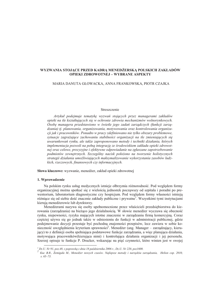 WYZWANIA STOJĄCE PRZED KADRĄ MENEDĩERSKĄ POLSKICH ZAKŁADÓW OPIEKI ZDROWOTNEJ – WYBRANE ASPEKTY MARIA DANUTA GŁOWACKA, ANNA FRANKOWSKA, PIOTR CZAJKA Streszczenie Artykuł podejmuje tematykĊ wyzwaĔ stojących przez managerami zakładów opieki na tle kształtujących siĊ w ochronie zdrowia mechanizmów wolnorynkowych. OsobĊ managera przedstawiono w Ğwietle jego zadaĔ zarządczych (funkcji zarządzania) tj. planowania, organizowania, motywowania oraz kontrolowania organizacji jak i pracowników. Ponadto w pracy zdefiniowano nie tylko obszary problemowe, sytuacje zagraĪające zachowaniu stabilnoĞci organizacji na tle zmieniających siĊ uwarunkowaĔ rynku, ale takĪe zaproponowano metody i techniki działania, których implementacja pozwoli na pełną integracjĊ ze Ğrodowiskiem zakładu opieki zdrowotnej oraz celowe, precyzyjne i efektywne odpowiadanie na zgłaszane zapotrzebowanie podmiotów zewnĊtrznych. Szczególny nacisk połoĪono na tworzenie holistycznych strategii działania umoĪliwiających maksymalizowanie wykorzystania zasobów ludzkich, rzeczowych, finansowych czy informacyjnych. Słowa kluczowe: wyzwanie, meneder, zakład opieki zdrowotnej 1. Wprowadzenie Na polskim rynku usług medycznych istnieje olbrzymia rónorodno. Pod wzgldem formy organizacyjnej mona spotka si z wieloci jednostek poczwszy od szpitala i poradni po prewentorium, laboratorium diagnostyczne czy hospicjum. Pod wzgldem formy własnoci istniej rónice si od siebie do znacznie zakłady publiczne i prywatne1. Wszystkimi tymi instytucjami kieruj menederowie lub dyrektorzy. Menederami nazywa si osoby upełnomocnione przez włacicieli przedsibiorstwa do kierowania (zarzdzania) na bieco jego działalnoci. W słowie meneder wyczuwa si obecno rynku, niepewnoci, ryzyka majcych istotne znaczenie w zarzdzaniu firm komercyjn. Coraz czciej uywa si go jednak take w odniesieniu do funkcji w administracji publicznej, gdzie podejmowanie decyzji przestaje by pochodn znajomoci przepisów, lecz zawiera w sobie konieczno uwzgldnienia kryterium sprawnoci2. Meneder (ang. Manager – zarzdzajcy, kierujcy) to z definicji osoba spełniajca podstawowe funkcje zarzdzania, a wic planujca działania, motywujca pracowników(kierujca nimi) i kontrolujca działania organizacji i jej personelu. Szerzej opisuje te funkcje P. Drucker, wskazujc na pi czynnoci, które winien jest w swojej 1 2 Dz.U. Nr 91, poz.48, z poprawką z dnia 18 paĨdziernika 2006 r., Dz.U. Nr 220, poz1600. Kuc B.R., ĩemigała M., MenedĪer nowych czasów. Najlepsze metody i narzĊdzia zarządzania, Helion cop. 2010, s. 65–73. 33 Studies & Proceedings of Polish Association for Knowledge Management Nr 38, 2011 codziennej pracy wykonywa meneder: 1. Ustala cele. Planuje, co powinno je stanowi. Okrela cele wynikowe dla kadej dziedziny celów całoci. Decyduje o tym, co zrobi, eby je osign. Nadaje im efektywno, przekazuje informacje o nich ludziom, od których wydajnoci zaley ich zrealizowanie. Krótko mówic planuje. 2. Organizuje. Analizuje niezbdne działania, decyzje i relacje, klasyfikuje prac i dzieli j na zarzdzane działania. Nastpnie dzieli je na zarzdzane zadania zwizane z danymi stanowiskami. Grupuje te jednostki organizacyjne i zadania w struktur organizacyjn. Dobiera ludzi do zarzdzania tymi jednostkami i do zada, które trzeba wykona. 3. Motywuje i informuje. Z ludzi odpowiedzialnych za zadania tworzy zespół. Robi to poprzez praktyki właciwe zarzdzaniu: poprzez własne stosunki z ludmi, którymi kieruje, bodce i nagrody za udan prace, polityk awansowania, a take poprzez system stałego porozumiewania si ze swoimi podwładnymi (porozumienia obustronnego). 4. Meneder dokonuje pomiaru. Ustala on mierniki ocen i dopilnowuje, aby kady członek organizacji miał dostp do mierników skupionych na wydajnoci całej organizacji i jednoczenie na jego własnej pracy, a pomocnych w jej wykonywaniu. Informuje podwładnych, jak i zwierzchników o treci mierników i wyników swych analiz. 5. Rozwija ludzi. Od sposobu, w jaki sobie z tym radzi, zaley, czy ludziom bdzie łatwiej czy trudniej si rozwija. Nadaje im kierunek albo sprowadza ich na manowce. Co z nich wydobywa albo ich tłamsi. Umacnia w nich prawo albo ich korumpuje. Uczy ich trzyma si prosto i twardo albo ich deformuje3. Menederów mona podzieli na typy według szczebla i dziedziny. Uywajc pierwszego kryterium, wyróniamy menederów najwyszego i redniego szczebla oraz menederów pierwszej linii4. W podziale według obszarów działania mówimy o menederach ogólnych i funkcjonalnych5, marketingu, finansów, eksploatacji, zasobów ludzkich, administracji oraz menederach wyspecjalizowanych6. Menederowie odgrywaj dziesi podstawowych ról: trzy role interpersonalne (reprezentanta, przywódcy i łcznika), trzy role informacyjne (obserwatora, propagatora i rzecznika) oraz cztery role decyzyjne (przedsibiorcy, przeciwdziałajcego zakłóceniom, dysponenta zasobów i negocjatora). Jeeli s skuteczni, na ogół wyposaeni s w umiejtnoci techniczne, interpersonalne (społeczne), koncepcyjne, diagnostyczne i analityczne7, a take, midzy innymi takie atuty, jak umiejtno obsługi komputera, prowadzenia dyskusji, przemawiania, prowadzenia negocjacji, udzielania wywiadów, rozumienia i samodzielnego tworzenia dokumentów organizacyjnych, posługiwania si statystycznymi technikami analizy danych czy znajomoci jzyków obcych, zwłaszcza angielskiego w stopniu umoliwiajcym swobodne prowadzenia korespondencji i nego- 3 Drucker P.F, Praktyka zarządzania, Czytelnik. NowoczesnoĞü. Akademia Ekonomiczna Kraków 1994, str. 368. Griffin R.W., Podstawy Zarządzania Organizacjami, Wydawnictwo Naukowe PWN, Warszawa 1998, s. 61. 5 Stankiewicz J., KałuĪny A.D. Współczesne problemy i koncepcje zarządzania – nowoczesne zarządzanie przedsiĊbiorstwem, Uniwersytet Zielonogórski, Zielona Góra 2003, s. 144. 6 Griffin R.W., Podstawy Zarządzania Organizacjami, Wydawnictwo Naukowe PWN, Warszawa 1998, s. 61. 7 Griffin R.W., P
