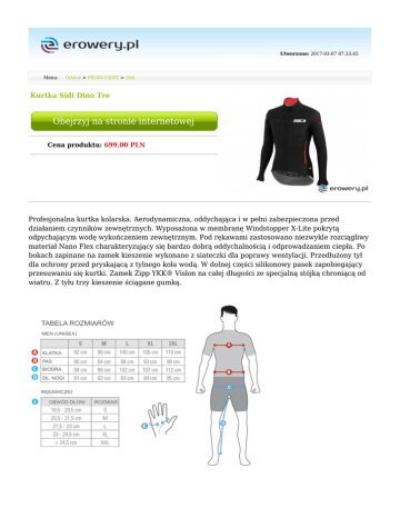Utworzono: 2017-03-07 07:33:45 Menu: Odzież > PRODUCENT > Sidi Kurtka Sidi Dino Tre Obejrzyj na stronie internetowej Cena produktu: 699,00 PLN Profesjonalna kurtka kolarska. Aerodynamiczna, oddychająca i w pełni zabezpieczona przed działaniem czynników zewnętrznych. Wyposażona w membranę Windstopper X-Lite pokrytą odpychającym wodę wykończeniem zewnętrznym. Pod rękawami zastosowano niezwykle rozciągliwy materiał Nano Flex charakteryzujący się bardzo dobrą oddychalnością i odprowadzaniem ciepła. Po bokach zapinane na zamek kieszenie wykonane z siateczki dla poprawy wentylacji. Przedłużony tył dla ochrony przed pryskającą z tylnego koła wodą. W dolnej części silikonowy pasek zapobiegający przesuwaniu się kurtki. Zamek Zipp YKK® Vislon na całej długości ze specjalną stójką chroniącą od wiatru. Z tyłu trzy kieszenie ściągane gumką. W 1960 firma Sidi rozpoczęła działalność jako warsztat produkcji obuwia sportowo-górskiego. Od 1970 roku Sidi specjalizuje się w obuwiu kolarskim, motocyklowym i butach do jazdy terenowej. Dino Signori, założyciel Sidi, łączy w sobie pasję do jazdy z ponad 50-cio letnim doświadczeniem w produkcji innowacyjnego obuwia sportowego. Dzięki tej pasji i głębokiej,intuicyjnej wiedzy, Sidi stała się liderem na rynku rowerowych i motocyklowych butów. Tradycyjne wartości i zaangażowanie w połączeniu z wydajną, międzynarodową siecią dystrybucji sprawiają że Sidi to firma, która jest obecna na całym świecie. Ze względu na wysoką jakość, obuwie Sidi zostało wybrane przez miliony sportowców. Przez lata Sidi wypracowała sobie własną, niezawodną technikę, która pozwala na osiągnięcie maksymalnej niezawodności i komfortu. Łącząc innowacje z półwieczem doświadczeń, Sidi to czysta pasja, która sprawia że nie jest tylko zwyczajną firmą. Producent Kolor Sidi Czarny_#000000 Mimo dołożenia wszelkich starań nie gwarantujemy, że publikowane opisy i specyfikacje techniczne niezawierają uchybień lub błędów, które nie mogą jednak być podstawą do roszczeń. W przypadku jakichkolwiek wątpliwości, przed podjęciem decyzji prosimy o kontakt. Adres: www.erowery.pl Telefon: 605 515 185, 34 361 16 71 Email: [email protected]