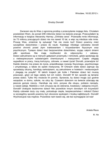 Wrocław, 16.02.2012 r. Drodzy Dorośli! Zwracam się do Was z ogromną prośbą o przeczytanie mojego listu. Chciałam powiedzieć Wam, że ponad 246 milionów dzieci na świecie pracuje. Przeczytałam tę informację w książce Alexandry Harney „Chińska cena”. Przeraziła mnie informacja, że 73 miliony pracujących dzieci nie ma nawet 10 lat, a więc są młodsze ode mnie. Proszę Was, zmieńcie tę sytuację! Tak nie może być! Dzieci powinny mieć szczęśliwe dzieciństwo i prawo do nauki. Każdego młodego człowieka dorośli powinni chronić przed złym traktowaniem i krzywdzeniem fizycznym oraz psychicznym. Tysiące dzieci traci bezpowrotnie dzieciństwo, szyjąc całymi dniami piłki sportowe. Nie mają możliwości do odpoczynku i zabawy. Dzieci zatrudniane są w różnych gałęziach przemysłu i rolnictwie, gdzie spotykają się z niebezpiecznymi substancjami chemicznymi i maszynami. Często ulegają wypadkom w pracy, tracą kończyny, zdrowie, a nawet życie! Dorośli, przerwijcie to! Każde dziecko ma prawo do życia, prawidłowego rozwoju fizycznego, psychicznego i umysłowego, a także do opieki medycznej. W Chinach wiele dzieci zajmuje się sprzedażą uliczną, handlują narkotykami, są zatrudniane w hotelach i restauracjach i „biegają na posyłki”. W takich krajach jak Indie i Pakistan dzieci też muszą pracować, gdyż od tego zależy byt ich rodzin. Dorośli! W ten sposób są łamane prawa dzieci. Tylko Wy możecie im pomóc. Sprawcie, by dzieci mogły żyć godnie wszędzie: w domu, szkole, na ulicy itp. Czasami dzieciom na świecie zdarzają się jeszcze gorsze rzeczy. Handluje się nimi, porywa dla okupu, pobiera narządy, a nawet zabija. Niektóre z nich zmusza się do żebrania, kradzieży i zabijania innych. Dorośli! Uratujcie bezbronne dzieci! Nie pozwólcie innym dorosłym ich krzywdzić! Każdy człowiek duży czy mały, potrzebuje ciepła, bezpieczeństwa i miłości! Dzieci w szczególny sposób powinny być otoczone spokojem i troską najbliższych. Dorośli! Wychowujcie nas mądrze. Pozwólcie nam bawić się, ale też wymagajcie od nas! Aniela Reus kl. 4a