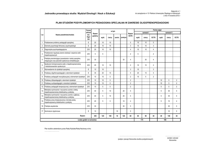PLAN STUDIÓW PODYPLOMOWYCH PEDAGOGIKA SPECJALNA