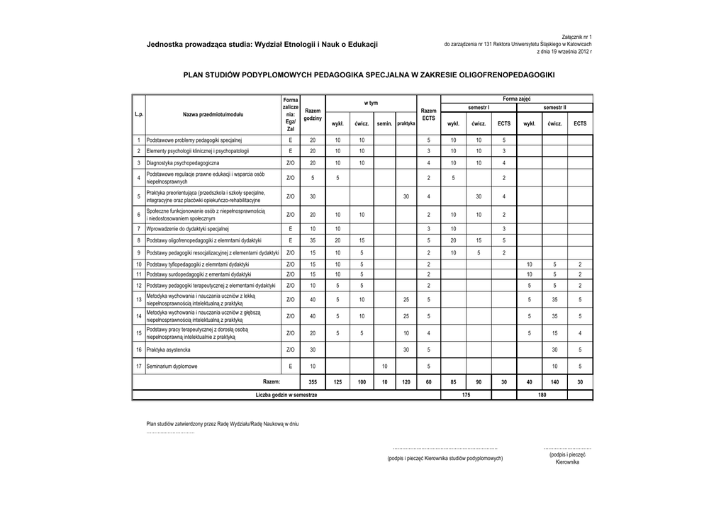 Załącznik nr 1 do zarządzenia nr 131 Rektora Uniwersytetu Śląskiego w Katowicach z dnia 19 września 2012 r Jednostka prowadząca studia: Wydział Etnologii i Nauk o Edukacji PLAN STUDIÓW PODYPLOMOWYCH PEDAGOGIKA SPECJALNA W ZAKRESIE OLIGOFRENOPEDAGOGIKI L.p. Forma zalicze Razem nia: godziny Egz/ Zal Nazwa przedmiotu/modułu Forma zajęć w tym wykł. ćwicz. semin. praktyka Razem ECTS semestr I semestr II wykł. ćwicz. ECTS 1 Podstawowe problemy pedagogiki specjalnej E 20 10 10 5 10 10 5 2 Elementy psychologii klinicznej i psychopatologii E 20 10 10 3 10 10 3 3 Diagnostyka psychopedagogiczna Z/O 20 10 10 4 10 10 4 4 Podstawowe regulacje prawne edukacji i wsparcia osób niepełnosprawnych Z/O 5 5 2 5 5 Praktyka preorientująca (przedszkola i szkoły specjalne, integracyjne oraz placówki opiekuńczo-rehabilitacyjne Z/O 30 6 Społeczne funkcjonowanie osób z niepełnosprawnością i niedostosowaniem społecznym Z/O 20 10 7 Wprowadzenie do dydaktyki specjalnej E 10 10 8 Podstawy oligofrenopedagogiki z elemntami dydaktyki 9 Podstawy pedagogiki resocjalizacyjnej z elementami dydaktyki 30 10 10 3 10 ćwicz. ECTS 2 4 2 wykł. 30 4 10 2 3 E 35 20 15 5 20 15 5 Z/O 15 10 5 2 10 5 2 10 Podstawy tyflopedagogiki z elemntami dydaktyki Z/O 15 10 5 2 10 5 2 11 Podstawy surdopedagogiki z ementami dydaktyki Z/O 15 10 5 2 10 5 2 12 Podstawy pedagogiki terapeutycznej z elementami dydaktyki Z/O 10 5 5 2 5 5 2 Metodyka wychowania i nauczania uczniów z lekką 13 niepełnosprawnością intelektualną z praktyką Z/O 40 5 10 25 5 5 35 5 14 Metodyka wychowania i nauczania uczniów z głębszą niepełnosprawnością intelektualną z praktyką Z/O 40 5 10 25 5 5 35 5 15 Podstawy pracy terapeutycznej z dorosłą osobą niepełnosprawną intelektualnie z praktyką Z/O 20 5 5 10 4 5 15 4 Z/O 30 30 5 30 5 E 10 5 10 5 140 30 16 Praktyka asystencka 17 Seminarium dyplomowe Razem: 355 Liczba godzin w semestrze 10 125 100 10 120 60 85 90 30 175 40 180 Plan studiów zatwierdzony przez Radę Wydziału/Radę Naukową w dniu ………....……………… ………………………………………………………… (podpis i pieczęć Kierownika studiów podyplomowych) ………………………… (podpis i pieczęć Kierownika