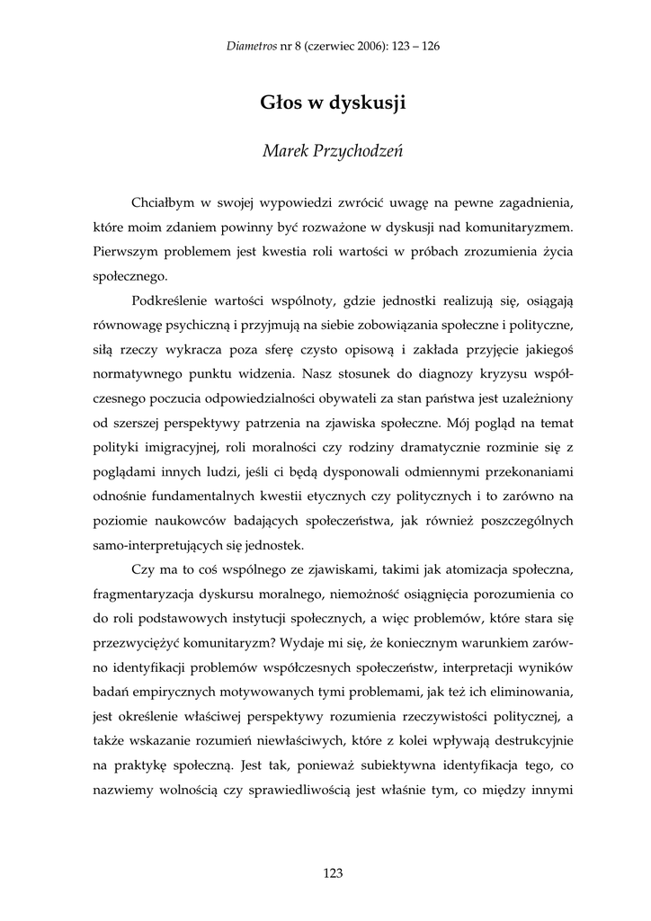Diametros nr 8 (czerwiec 2006): 123 – 126 Głos w dyskusji Marek Przychodze Chciałbym w swojej wypowiedzi zwróci uwag na pewne zagadnienia, które moim zdaniem powinny by rozwa one w dyskusji nad komunitaryzmem. Pierwszym problemem jest kwestia roli warto ci w próbach zrozumienia ycia społecznego. Podkre lenie warto ci wspólnoty, gdzie jednostki realizuj si , osi gaj równowag psychiczn i przyjmuj na siebie zobowi zania społeczne i polityczne, sił rzeczy wykracza poza sfer czysto opisow i zakłada przyj cie jakiego normatywnego punktu widzenia. Nasz stosunek do diagnozy kryzysu współczesnego poczucia odpowiedzialno ci obywateli za stan pa stwa jest uzale niony od szerszej perspektywy patrzenia na zjawiska społeczne. Mój pogl d na temat polityki imigracyjnej, roli moralno ci czy rodziny dramatycznie rozminie si z pogl dami innych ludzi, je li ci b d dysponowali odmiennymi przekonaniami odno nie fundamentalnych kwestii etycznych czy politycznych i to zarówno na poziomie naukowców badaj cych społecze stwa, jak równie poszczególnych samo-interpretuj cych si jednostek. Czy ma to co wspólnego ze zjawiskami, takimi jak atomizacja społeczna, fragmentaryzacja dyskursu moralnego, niemo no osi gni cia porozumienia co do roli podstawowych instytucji społecznych, a wi c problemów, które stara si przezwyci y komunitaryzm? Wydaje mi si , e koniecznym warunkiem zarówno identyfikacji problemów współczesnych społecze stw, interpretacji wyników bada empirycznych motywowanych tymi problemami, jak te ich eliminowania, jest okre lenie wła ciwej perspektywy rozumienia rzeczywisto ci politycznej, a tak e wskazanie rozumie niewła ciwych, które z kolei wpływaj destrukcyjnie na praktyk społeczn . Jest tak, poniewa subiektywna identyfikacja tego, co nazwiemy wolno ci czy sprawiedliwo ci jest wła nie tym, co mi dzy innymi 123 Marek Przychodze tworzy wolno i sprawiedliwo 1. Głos w dyskusji Z tego powodu nie da si oddzieli kwestii teoretycznych od kwestii praktyki społecznej. Je li za społeczne s konstruowanie poprzez samo-interpretacj instytucje i praktyki jednostek w społe- cze stwie, to czy owe instytucje s arbitralne, czy ich zmiana zale y wył cznie od konwencji, przyj tej przez jednostki definicji? Gdyby tak było, relatywizm byłby nieuchronn konkluzj płyn c z przyj cia takiego stanowiska, gdy zmiana np. definicji rodziny, oznaczałaby równie zmian tej e instytucji. Czy komunitaryzm potrafi obroni si przed tym zarzutem? Jest to fundamentalne zagadnienie i po wi c mu dalsz cz mojej wypowiedzi. Zgadzam si z zasadniczym twierdzeniem zawartym w ksi ce Alasdaira MacIntyre’a Dziedzictwo cnoty (1996), i podstawowym problemem współczesnego samo-rozumienia si człowieka Zachodu, jest zerwanie zwi zku pomi dzy faktem a warto ci , pomi dzy zrozumieniem tego, czym człowiek jest, a tym, czym powinien si sta dzi ki cnotom, zrozumieniu nadaj cemu wypowiedziom moralnym charakter prawdy lub fałszu. Zgodnie z tym pogl dem, nie da si okre li , czym jest człowiek, nie okre laj c równocze nie tego, czym jest dobry człowiek, tak jak nie sposób zrozumie poj cia gry na fortepianie bez wzi cia pod uwag celu gry na fortepianie, jakim jest pi kna muzyka. Nie miejsce tu, by wdawa si w dokładn analiz skali oraz efektów owego zerwania ł czno ci pomi dzy „obecnym stanem człowieka, a jego prawdziwym celem”, by u y sformułowania MacIntyre’a, w ka dym b d razie mo na powiedzie , e uwolnienie ludzkiego rozumu od jakichkolwiek zewn trznych autorytetów, czy to obiektywnego i daj cego si racjonalnie pozna porz dku rzeczy, czy to zgodnego z nim boskiego nakazu, współgrało z pojawieniem si koncepcji wolno ci niepowi zanej z adnymi substancjalnie rozumianymi celami moralnymi. Wszelka moralna krytyka zacz ła stanowi zagro enie, bowiem wobec braku racjonalnych rodków skutecznego przekonywania, w ka dej chwili metod zapewnienia sobie zwyci stwa w debacie mogła okaza si przemoc czy manipulacja. Mo na powiedzie , e koncepcja prawa natury szczególnie w jej wydaniu religijnym zapewniała spójno 1 dyskursowi moralnemu w daleko wi kszym A. MacIntyre, The Essential Contestability of Some Social Concepts, „Ethics” (84) 1990. 124 Marek Przychodze Głos w dyskusji stopniu, ni dzieje si obecnie, zarówno w sferze filozofii, jak te debaty publicznej a ostatecznie równie praktyki społecznej (jak wspominałem, sfery samo- rozumienia oraz działania nie da si w moim przekonaniu oddzieli ). Z powodu braku nadrz dnych, uniwersalnie wi cych nakazów moralnych trudno we współczesnym społecze stwie oczekiwa , i jednostki same z siebie podejm trud wypełniania obowi zków społecznych, e b d chciały „da co z siebie”. Posta egoisty, wyalienowanego z praktyk zbiorowych, wizja ustroju pa stwowego jako wypadkowej zmiennych „preferencji” indywidualnych, daj si zrozumie jako efekt okre lonych zmian kulturowych. Adekwatne zrozumienie prawdy o człowieku warunkuje poprawn interpretacj zjawisk kulturowych. Mo na argumentowa , i pochodz cy od Arystotelesa teleologiczny sposób ujmowania zagadnie moralnych jest jedynym wła ciwym zarówno pod wzgl dem adekwatnego rozumienia, jak dobrego działania. Je li tak jest, by mo e całe trwanie naszej cywilizacji zale y od tradycyjnego stosowania przez nas kategorii „cnoty” i „dobrego ycia” niezale nie od teorii, w której poj cia te zostały ju dawno wyrugowane2. Na szcz cie, roztropno , poj cia etyczne, intuicje moralne wci nie poddaj si dyktatowi emotywi- stycznej kultury, jak j diagnozuje MacIntyre. Dla socjologa problemem mo e by to, i nie da si przedstawi zupełnej listy cech natury ludzkiej, tak by mo na j było potem zastosowa do rozwi zania konkretnych problemów społecznych, na podobie stwo post powania teoretyka w naukach cisłych. Zrozumienie np. wymogów pracy lekarza, w odró nieniu od subiektywnych potrzeb konkretnego lekarza, jest dziełem indywidualnego rozumu praktycznego, który mo e by ograniczony np. przez młody wiek, wady cha