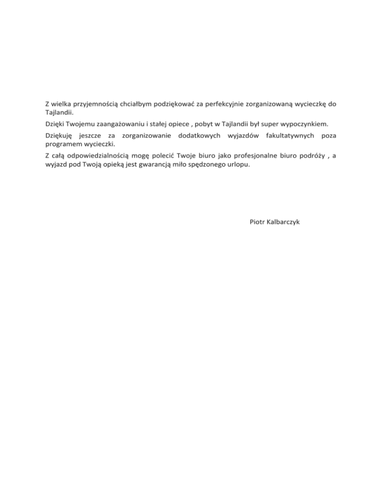 Z wielka przyjemnością chciałbym podziękować za perfekcyjnie zorganizowaną wycieczkę do Tajlandii. Dzięki Twojemu zaangażowaniu i stałej opiece , pobyt w Tajlandii był super wypoczynkiem. Dziękuję jeszcze za zorganizowanie dodatkowych wyjazdów fakultatywnych poza programem wycieczki. Z całą odpowiedzialnością mogę polecić Twoje biuro jako profesjonalne biuro podróży , a wyjazd pod Twoją opieką jest gwarancją miło spędzonego urlopu. Piotr Kalbarczyk