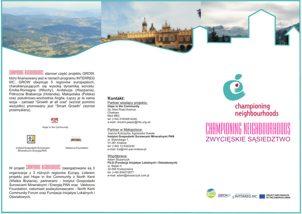Championing Neighbourhoods stanowi czêœæ projektu GROW, który finansowany jest w ramach programu INTERREG IIIC. GROW obejmuje 5 regionów europejskich, charakteryzuj¹cych siê wysok¹ dynamik¹ wzrostu: Emilia-Romagna (W³ochy), Andaluzja (Hiszpania), Pó³nocna Brabancja (Holandia), Ma³opolska (Polska) oraz po³udniowo-wschodnia Anglia. £¹czy je ta sama wizja - zamiast “Growth at all cost” (wzrost pomimo wszystko) promowany jest “Smart Growth” (wzrost przemyœlany). Hope in the Community Instytut Gospodarki Surowcami Mineralnymi i Energi¹ PAN Valdocco Foundation Kontakt: Partner wiod¹cy projektu: Hope in the Community 5a, New Road Avenue, Chatham Me4 6BG tel: (+44) 01634814240 e-mail: [email protected] Partner w Ma³opolsce: Joanna Kulczycka, Agnieszka Duka³a Instytut Gospodarki Surowcami Mineralnymi PAN ul. Wybickiego 7, 31-261 Kraków tel: (+48) 12 6322245 e-mail: [email protected] Wspó³praca: Championing Neighbourhoods W projekt zaanga¿owane s¹ 3 organizacje z 3 ró¿nych regionów Europy. Liderem projektu jest Hope in the Community z North Kent (Wielka Brytania), partnerami - Instytut Gospodarki Surowcami Mineralnymi i Energi¹ PAN oraz Valdocco Foundation, natomiast podwykonawcami - North Kent Community Forum oraz Fundacja Inicjatyw Lokalnych i Oœwiatowych. Adam Œlusarczyk FILO (Fundacja Inicjatyw Lokalnych i Oœwiatowych) ul. Stopki 4 32-065 Krzeszowice tel: (+48) 604272677 e-mail: [email protected] Championing neighbourhoods ZWYCIÊSKIE S¥SIEDZTWO Championing Neighbourhoods Celem projektu jest wspieranie organizacji pozarz¹dowych w ka¿dym z regionów partnerskich w realizacji ich zadañ statutowych, jak równie¿ zg³êbienie wiedzy o ró¿nych metodach pracy organizacji w regionach. Championing Neighbourhoods Projekt jest szans¹ dla organizacji pozarz¹dowych na wymianê wiedzy i doœwiadczeñ pomiêdzy ró¿nymi regionami Europy; umo¿liwi im to w przysz³oœci uczestniczenie w europejskich programach i przezwyciê¿enie bariery nierównoœci ekonomicznych, nie tylko w obrêbie w³asnych regionów, ale równie¿ w skali ca³ej Unii Europejskiej. Championing Neighbourhoods Na zakoñczenie projektu zostanie zorganizowana konferencja. Odbêdzie siê ona w Krakowie na Wawelu w Centrum WystawowoKonferencyjnym w dniach 08.10.2007-09.10.2007. Uczestnicy projektu bêd¹ mieli mo¿liwoœæ zaprezentowania swojej dzia³alnoœci. Championing Neighbourhoods W Ma³opolsce celem projektu jest wsparcie powstaj¹cych organizacji pozarz¹dowych oraz stworzenie mapy ich aktywnoœci. Projekt ma równie¿ umo¿liwiæ rozpowszechnianie informacji oraz wiedzy zdobytej z ka¿dego z regionów wœród szerszej grupy odbiorców, mieszkañców, samorz¹dów oraz zdefiniowanie czynników sukcesu w kontekœcie funkcjonowania organizacji pozarz¹dowych. Championing Neighbourhoods Projekt jest adresowany do organizacji pozarz¹dowych oraz samorz¹dów terytorialnych. Wzrastaj¹ca rola organizacji pozarz¹dowych w spo³eczeñstwie jest wynikiem procesów zachodz¹cych w œwiecie, dlatego odgrywaj¹ one coraz wiêksz¹ rolê jako partnerzy w realizacji zadañ Wspó³praca Hiszpanii, Wielkiej Brytanii i Polski przyniesie wzajemne korzyœci w trzech g³ównych aspektach: 1. Rozwiniêcie sieci szkoleñ oraz udzielenie wsparcia lokalnego w ka¿dym regionie poprzez dostêp do odpowiedniej wiedzy. 2. Wymianê informacji i doœwiadczeñ poprzez pobyty zagraniczne, które maj¹ na celu zg³êbianie wiedzy o ró¿norodnych metodach pracy w regionach. Ponadto, analiza ró¿nic regionalnych bêdzie przedmiotem trójstronnych warsztatów szkoleniowych. 3. Rozpowszechnienie informacji oraz wiedzy zdobytej z ka¿dego indywidualnego regionu dla szerszej publicznoœci, jak równie¿ lepsze zrozumienie czynników sukcesu. W ramach projektu zostanie równie¿ opublikowana ksi¹¿ka z przyk³adami najlepszych praktyk, która stanowiæ bêdzie narzêdzie do poprawy dzia³alnoœci organizacji samorz¹dowych, jak równie¿ przyczyni siê w znaczny sposób do zwiêkszenia udzia³u tych organizacji na polskim rynku. Zdjêcia autorstwa B. i R. £uczak