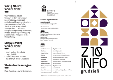 Wizja naszej Wspólnoty: Wywyższający Jezusa, trwający w Nim, wzrastający i pomnażający się dojrzali naśladowcy Chrystusa, sięgający swoim wpływem krańców ziemi, w życiu których Duch Święty działa z całą swoją mocą i chwałą tworząc atmosferę miłości iakceptacji dostrzegalną przez świat, a wszystko to dla Bożej chwały. Misja naszej wspólnoty: ul. Zagórna 10, 00-441 Warszawa www.zagorna10.pl [email protected] www.facebook.com/zagorna10 ING Bank Śląski 72 1050 1038 1000 0022 3955 5424 STARSI ZBORU Sławomir Foks /pastor/ T: 507 766 396 Jerzy Muranty Henryk Dedo Waldemar Kasperczak /sekretarz Jacek Teterycz /skarbnik SŁUŻBY Szkółka niedzielna Magda Balcerak Modlitwa Paweł Sopkowski Grupa Młodych Paulina i Staszek Marek Muzyka Roman Czarnecki, Kasia Kiklewicz Kawiarenka Iwona Milewska, Agata Janiec Biblioteka Edyta Mazur, Kaja Dubiel Nagłośnienie Szymon Zabrocki, Daniel Ewertowski Stwierdzenie misyjne: Wieczerza Pańska Michał Milewski Służba porządkowa Magda Balcerak Facebook Łukasz Małojło Znać Chrystusa i czynić Go znanym. Strona internetowa Anna i Łukasz Małojło, Sławomir Foks Informator (skład i druk) Kaja Dubiel - znać i kochać Chrystusa i Jego Kościół, - czynić Chrystusa znanym, - być znanym przez Chrystusa. Ogłoszenia do informatora można wysyłać na adres mailowy zboru. grudzień SŁOWO OD PASTORA Dziwne urodziny (brak solenizanta i prezenty od gości urodzinowych dla gości) 24 grudnia wieczorem w wielu domach rozpoczyna się wigilijna kolacja. Najbliższa rodzina siada razem przy stole i wspólnie spędza czas rozmawiając, jedząc i obdarowując się prezentami. Jednak widzę w tym wszystkim coś bardzo dziwnego. Zauważam, że to jedyny dzień w którym niejednokrotnie świętuje się bez solenizanta – Jezusa Chrystusa. Przecież powinniśmy wspominać czas JEGO narodzin, a tak często święta Bożego Narodzenia przebiegają bez właściwego skupienia na osobie Zbawiciela. To są Jego urodziny, a my nie Jemu dajemy prezenty, tylko sobie. Może podczas tegorocznych świąt powinniśmy mniej czasu i uwagi poświęcić jedzeniu, zakupom, prezentom, a więcej Synowi Bożemu, Jego słowom i służbie. Pomyśl jaki prezent możesz Mu ofiarować? W jaki sposób Jego możesz uczcić? Daj mu swoje serce, swoje myśli, swoją codzienność. Podziel swój chleb z głodnymi, pociesz strapionych, pomóż potrzebującym, dawaj z miłości do człowieka i Boga. W ten sposób prawdziwie obchodzić będziesz święta Bożego Narodzenia. Nie zapominaj o istocie tego czasu. Nie zapominaj o solenizancie Jezusie Chrystusie! NADCHODZĄCE WYDARZENIA 2 grudnia (środa), godz. 18.30 – spotkanie Grupy Służby Z10 19 grudnia (sobota), godz. 18.00 – świąteczny koncert chóru Under Grace 25 grudnia (piątek), godz. 10.00 – nabożeństwo świąteczne Inne 6 grudnia (niedziela), godz. 16.00 – odwiedziny w Zakładzie Poprawczym z Pogotowiem Opiekuńczym dla Dziewcząt w Falenicy 12 grudnia (sobota), godz. 11.00 – Konferencja z udziałem Josha Mcdowella pt. „Czy można zaufać Biblii?” – zapisy: sekretariat@wst. edu.pl; tel 022 679-72-41; miejsce: Wyższa Szkoła Teologiczno Społeczna, ul. Wyborna 20 Warszawa 18 grudnia (piątek), godz. 18.00 – Wigilijne Spotkanie Seniorów – Kościół Zielonoświątkowy Sienna 68/70 Warszawa (w programie śpiewanie kolęd, modlitwa o uzdrowienie, Słowo Boże głoszone przez pastora Dawida Kulinicza, słodki poczęstunek) Kazania 6 grudnia – gość Samuel Skrzypkowski 13 grudnia – Sławomir Foks 20 grudnia – Henryk Dedo 25 grudnia – Sławomir Foks 27 grudnia – Piotr Suchorolski STAŁE WYDARZENIA Nabożeństwa – niedziela, godz. 10.00 Szkoła Niedzielna (dla dzieci i młodzieży w punkcie katechetycznym) – podczas trwania nabożeństwa, zaraz po śpiewie Spotkania modlitewne – piątek, godz. 17.00. Spotkania Grupy Młodych – piątek, godz. 18.30 GRUPY DOMOWE Mokotów info: Dominika i Daniel Ewertowscy T: 734 173 966 kiedy: czwartek, godz. 18.00 Śródmieście info: Natasha i Igor Sakolscy /T: 664 052 448 kiedy: raz w tygodniu, dzień i godzina ustalane na bieżąco Wesoła info: Kamila i Jacek Teterycz /T: 603 403 424 kiedy: środa, godz. 19.00