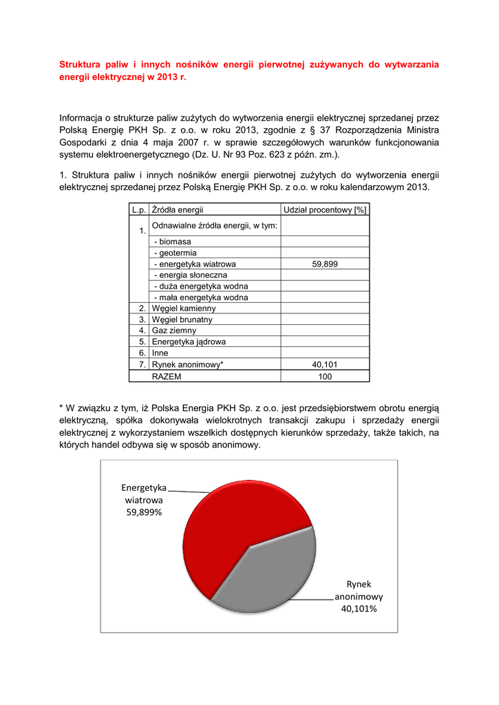Struktura paliw i innych nośników energii pierwotnej zużywanych do wytwarzania energii elektrycznej w 2013 r. Informacja o strukturze paliw zużytych do wytworzenia energii elektrycznej sprzedanej przez Polską Energię PKH Sp. z o.o. w roku 2013, zgodnie z § 37 Rozporządzenia Ministra Gospodarki z dnia 4 maja 2007 r. w sprawie szczegółowych warunków funkcjonowania systemu elektroenergetycznego (Dz. U. Nr 93 Poz. 623 z późn. zm.). 1. Struktura paliw i innych nośników energii pierwotnej zużytych do wytworzenia energii elektrycznej sprzedanej przez Polską Energię PKH Sp. z o.o. w roku kalendarzowym 2013. L.p. Źródła energii 1. 2. 3. 4. 5. 6. 7. Udział procentowy [%] Odnawialne źródła energii, w tym: - biomasa - geotermia - energetyka wiatrowa - energia słoneczna - duża energetyka wodna - mała energetyka wodna Węgiel kamienny Węgiel brunatny Gaz ziemny Energetyka jądrowa Inne Rynek anonimowy* RAZEM 0,000 0,000 59,899 0,000 0,000 0,000 0,000 0,000 0,000 0,000 0,000 40,101 100 * W związku z tym, iż Polska Energia PKH Sp. z o.o. jest przedsiębiorstwem obrotu energią elektryczną, spółka dokonywała wielokrotnych transakcji zakupu i sprzedaży energii elektrycznej z wykorzystaniem wszelkich dostępnych kierunków sprzedaży, także takich, na których handel odbywa się w sposób anonimowy. Energetyka wiatrowa 59,899% Rynek anonimowy 40,101% 2. Informacje o wpływie wytworzenia energii elektrycznej na środowisko w zakresie wielkości emisji dla poszczególnych paliw i innych nośników energii pierwotnej zużytych do wytworzenia energii elektrycznej sprzedanej przez Polską Energię PKH Sp. z o.o. w roku kalendarzowym 2013. L.p. 1. 2. Rodzaje paliwa CO2 SO2 Nox Pyły Odpady radioaktywne [Mg/MWh] Odnawialne źródła energii 0 0 0 0 - energetyka wiatrowa Inne b.d. b.d. b.d. b.d. Razem - 0 b.d. -