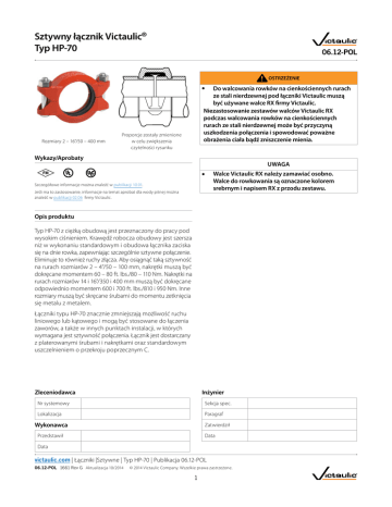 Sztywny łącznik Victaulic® Typ HP-70 06.12-POL Rev G OSTRZEŻENIE o walcowania rowków na cienkościennych rurach D ze stali nierdzewnej pod łączniki Victaulic muszą być używane walce RX firmy Victaulic. Niezastosowanie zestawów walców Victaulic RX podczas walcowania rowków na cienkościennych rurach ze stali nierdzewnej może być przyczyną uszkodzenia połączenia i spowodować poważne obrażenia ciała bądź zniszczenie mienia. • Rozmiary 2 – 16”/50 – 400 mm Proporcje zostały zmienione w celu zwiększenia czytelności rysunku Wykazy/Aprobaty UWAGA • Szczegółowe informacje można znaleźć w publikacji 10.01. Jeśli ma to zastosowanie, informacje na temat aprobat dla wody pitnej można znaleźć w publikacji 02.06 firmy Victaulic. W alce Victaulic RX należy zamawiać osobno. Walce do rowkowania są oznaczone kolorem srebrnym i napisem RX z przodu zestawu. Opis produktu Typ HP-70 z ciężką obudową jest przeznaczony do pracy pod wysokim ciśnieniem. Krawędź robocza obudowy jest szersza niż w wykonaniu standardowym i obudowa łącznika zaciska się na dnie rowka, zapewniając szczególnie sztywne połączenie. Eliminuje to również ruchy złącza. Aby osiągnąć taką sztywność na rurach rozmiarów 2 – 4”/50 – 100 mm, nakrętki muszą być dokręcane momentem 60 – 80 ft. lbs./80 – 110 Nm. Nakrętki na rurach rozmiarów 14 i 16”/350 i 400 mm muszą być dokręcane odpowiednio momentem 600 i 700 ft. lbs./810 i 950 Nm. Inne rozmiary muszą być skręcane śrubami do momentu zetknięcia się metalu z metalem. Łączniki typu HP-70 znacznie zmniejszają możliwość ruchu liniowego lub kątowego i mogą być stosowane do łączenia zaworów, a także w innych punktach instalacji, w których wymagana jest sztywność połączenia. Łącznik jest dostarczany z platerowanymi śrubami i nakrętkami oraz standardowym uszczelnieniem o przekroju poprzecznym C. Zleceniodawca Inżynier Nr systemowy Sekcja spec. Lokalizacja Paragraf Wykonawca Zatwierdził Przedstawił Data Data victaulic.com | Łączniki |Sztywne | Typ HP-70 | Publikacja 06.12-POL 06.12-POL 1661 Rev G Aktualizacja 10/2014 © 2014 Victaulic Company. Wszelkie prawa zastrzeżone. 1 victaulic.com | Łączniki | Sztywne | Typ HP-70 | Publikacja 06.12-POL Specyfikacje materiałowe Obudowa: Żeliwo sferoidalne zgodne z ASTM A-536, gatunek 65-45-12. Żeliwo sferoidalne zgodne z ASTM A-395, gatunek 65-45-15, dostępne jest na specjalne życzenie. Powłoka obudowy: (określić rodzaj) Standardowo: emalia pomarańczowa Opcjonalnie: cynkowane ogniowo Uszczelka: (określić rodzaj1) EPDM, gatunek „E” EPDM (kod koloru – pasek zielony). Zakres temperatur od -30°F do +230°F/od -34°C do +110°C. Zalecany do zimnej i gorącej wody w określonym zakresie temperatur oraz różnych rozcieńczonych kwasów, powietrza pozbawionego oleju i wielu czynników chemicznych. Sklasyfikowane na liście UL zgodnie z normą ANSI/NSF 61 dla zimnej wody pitnej o temperaturze +73°F/+23°C oraz zgodnie z ANSI/NSF 372 do gorącej wody pitnej o temperaturze +180°F/+82°C. NIEKOMPATYBILNY Z CZYNNIKAMI NAFTOWYMI. Kauczuk nitrylowy, gatunek „T” Kauczuk nitrylowy (kod koloru – pomarańczowy pasek). Zakres temperatur od -20°F do +180°F/od -29°C do +82°C. Zalecany do produktów naftowych, powietrza z oparami oleju, olejów roślinnych i mineralnych w określonym zakresie temperatur. Niekompatybilny z gorącą wodą o temperaturze ponad +150°F/+66°C i gorącym suchym powietrzem o temperaturze ponad +140°F/+60°C. 1Wymienione czynniki stanowią tylko ogólne zalecenia. Należy pamiętać, że istnieją czynniki, z którymi te uszczelki nie są kompatybilne. W przypadku konkretnych czynników i uszczelnień zawsze należy odwołać się do najnowszego przewodnika doboru uszczelnień firmy Victaulic, aby uzyskać wykaz niekompatybilnych czynników. Śruby/Nakrętki: Obrobiona cieplnie platerowana stal węglowa, głowica prowadząca spełnia wymagania fizyczne i chemiczne normy ASTM A-449 oraz wymagania fizyczne normy ASTM A-183 06.12-POL 1661 Rev G Aktualizacja 10/2014 victaulic.com © 2014 Victaulic Company. Wszelkie prawa zastrzeżone. 2 victaulic.com | Łączniki | Sztywne | Typ HP-70 | Publikacja 06.12-POL Wymiary Typ HP-70 Y Y Z Z X X 2 − 12” sizes 14 & 16” sizes Rozmiary 2–12” Rozmiary 14 i 16” Rzeczywista Średnica średnica nominalna zewnętrzna cale cale mm mm 2 2.375 50 60,3 2 1/2 2.875 65 73,0 3 3.500 80 88,9 4 4.500 100 114,3 6 6.625 150 168,3 8 8.625 200 219,1 10 10.750 250 273,0 12 12.750 300 323,9 14.000 14 4 350 323,9 16.000 16 4 400 406,4 Maks. ciśnienie robocze 2 psi kPa 1000 6900 1000 6900 1000 6900 1000 6900 1000 6900 800 5500 800 5500 800 5500 600 4100 600 4100 Maks. obciążenie na końcu 2 funty N 4430 19715 6490 28881 9620 42810 15900 70755 34470 153390 46740 207995 72640 323250 102000 453900 92360 410800 120600 536400 Dop. odstęp między końcami rur 2 cale mm 0.14 3,6 0.14 3,6 0.14 3,6 0.25 6,4 0.25 6,4 0.25 6,4 0.25 6,4 0.25 6,4 0.25 6,4 0.25 6,4 Wymiary Śruba/Nakrętka 2 3 (śr.) nomin. cale 2 – 5/8 x 2 3/4 2 – 5/8 x 3 1/2 2 – 5/8 x 3 1/2 2 – 3/4 x 4 1/4 2 – 7/8 x 5 1/2 2 – 1 x 5 1/2 2 – 1 x 6 1/2 2 – 1 x 6 1/2 2 – 1 1/4 x 4 1/2 2 – 1 1/4 x 4 1/2 X cale mm 3.50 89 4.13 105 4.75 121 6.00 152 8.63 219 11.00 279 13.50 343 15.63 397 16.75 425 18.75 476 Y cale mm 6.68 168 7.13 181 7.75 197 9.63 245 12.68 321 15.00 381 17.25 438 19.13 486 22.00 559 24.13 613 Z cale mm 2.00 51 2.00 51 2.00 51 2.13 54 2.50 64 2.75 70 3.00 76 3.13 80 3.88 99 3.88 99 Przybliż. masa funty kg 3.2 1,5 4.0 1,8 4.4 2,0 7.5 3,4 16.0 7,3 26.1 11,8 32.8 14,9 46.0 20,9 64.0 29,0 72.0 32,7 2Podano łączne wartości ciśnienia roboczego i obciążenia końców z uwzględnieniem wszystkich zewnętrznych i wewnętrznych obciążeń dla rur o standardowej wytrzymałości (wg ANSI) ze standardowymi walcowanymi lub skrawanymi rowkami zgodnie ze specyfikacją firmy Victaulic. W przypadku char