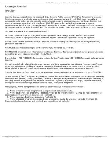 JOKRIS.INFO - Rozszerzenia, dodatki do Joomla! i Mambo Licencja Joomla! Autor: Jokris 20.06.2006. Joomla! jest upowszechniany na zasadach GNU General Public License(GNU GPL). Powszechna Licencja Publiczna zapewnia swobodę upowszechniania kopii oprogramowania i - jeśli ktoś chce - umożliwia pobieranie za to opłat, ale nie pozwala pobierać opłat za samo oprogramowanie, ponieważ Joomla! jest wolnym oprogramowaniem, jest bezpłatne! GNU GPL zapewnia swobodę dokonywania zmian w oprogramowaniu lub wykorzystywania jego fragmentów w nowych wolnych programach. Czy to oznacza, że możesz również zmienić licencję? Nie! Nie pozwala na to ani Prawo autorskie, ani inne przepisy prawa! Tak więc w sprawie autorskich praw własności: MOŻESZ upowszechniać to oprogramowanie i pobierać za tę usługę opłatę. MOŻESZ dokonywać dowolnych zmian w oprogramowaniu, zmieniać wygląd i zawartość i pobierać opłaty za tę pracę. NIE MOŻESZ jednak zmieniać licencji i MUSISZ udzielić nabywcy wszelkich praw do oprogramowania, jakie sam posiadałeś. NIE MUSISZ zamieszczać stopki czy banera w stylu 'Powered by Joomla!'. NIE MOŻESZ zmieniać praw własności autorskiej do Joomla!. Zachowujesz jednak swoje prawa własności autorskiej do wprowadzonych zmian i modyfikacji. Innymi słowy, NIE MOŻESZ informować, że Joomla! jest Twoje, oraz NIE MOŻESZ pobierać opłat za samo Joomla!. Używaj Joomla!, aby ułatwić życie sobie i swoim klientom, odrzucając całą otoczkę "czarnej magii" która wciąż jest związana z publikacją treści w Internecie. Pobieraj opłaty za swoją pracę, a nie za wysiłek, który włożyli w Joomla! zespół developerów Joomla! oraz cała społeczność związana z Joomla!. Joomla! jest wolnym (ang. free) oprogramowaniem. upowszechnianym na warunkach licencji GNU/GPL Słowo "wolne" ["free"] w języku angielskim używane jest w dwojakim znaczeniu: może dotyczyć swobody wykorzystania (wolne) i ceny (darmowe). Mówiąc o wolnym oprogramowaniu mamy na myśli swobodę, a nie cenę. Wolne oprogramowanie zapewnia swobodę używania, wykonywania kopii, rozpowszechniania, dostępu do kodu źródłowego, modyfikowania kodu, rozwijania programu. Precyzyjniej, wolne oprogramowanie oznacza cztery rodzaje wolności użytkowników: 1. Wolno wykorzystywać program dla jakiegokolwiek celu (wolność 0). 2. Wolno studiować kod programu i dostosowywać go do swoich potrzeb. Dostęp do kodu źródłowego jest niezbędnym warunkiem tej wolności (wolność 1). 3. Wolno rozprowadzać kopie programu (wolność 2). 4. Wolno ulepszać program i upowszechniać ulepszenia, także dla wspólnej korzyści (wolność 3). Dostęp do kodu źródłowego jest niezbędnym warunkiem tej wolności. http://www.jokris.info Kreator PDF Utworzono 7 March, 2017, 07:34