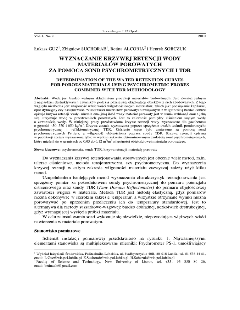 Proceedings of ECOpole Vol. 4, No. 2 2010 Łukasz GUZ1, Zbigniew SUCHORAB1, Betina ALCOBIA2 i Henryk SOBCZUK1 WYZNACZANIE KRZYWEJ RETENCJI WODY MATERIAŁÓW POROWATYCH ZA POMOCĄ SOND PSYCHROMETRYCZNYCH I TDR DETERMINATION OF THE WATER RETENTION CURVES FOR POROUS MATERIALS USING PSYCHROMETRIC PROBES COMBINED WITH TDR METHODOLOGY Abstrakt: Woda jest bardzo ważnym składnikiem produkcji materiałów budowlanych. Jest również jednym z najbardziej destruktywnych czynników podczas późniejszej eksploatacji obiektów z nich zbudowanych. Z tego względu niezbędna jest znajomość właściwości wilgotnościowych materiałów, takich jak: podsiąkanie kapilarne, opór dyfuzyjny czy nasiąkliwość. Właściwości materiałów porowatych związanych z wilgotnością bardzo dobrze opisuje krzywa retencji wody. Określa ona, jaką ilość wody materiał porowaty jest w stanie wchłonąć oraz z jaką siłą utrzymuje wodę w przestrzeniach porowatych. Jest to zależność pomiędzy ciśnieniem ssącym wodę a zawartością wody. W niniejszej pracy przedstawiono krzywe retencji wody wyznaczone dla gazobetonu o gęstości 450; 550 i 650 kg/m3. Krzywa została wyznaczona poprzez sprzężenie dwóch technik pomiarowych: psychrometrycznej i reflektometrycznej TDR. Ciśnienie ssące było zmierzone za pomocą sond psychrometrycznych Peltiera, a wilgotność objętościowa poprzez sondy TDR. Krzywa retencji opisana w publikacji została wyznaczona tylko w wąskim zakresie, determinowanym czułością sond psychrometrycznych, który mieścił się w granicach od 0,03 do 0,12 m3/m3 wilgotności objętościowej materiału porowatego. Słowa kluczowe: psychrometria, sonda TDR, krzywa retencji, materiały porowate Do wyznaczania krzywej retencjonowania stosowanych jest obecnie wiele metod, m.in. talerze ciśnieniowe, metoda tensjometryczna czy psychrometryczna. Do wyznaczenia krzywej retencji w całym zakresie wilgotności materiału zazwyczaj należy użyć kilku metod. Uzupełnieniem istniejących metod wyznaczania charakterystyk retencjonowania jest sprzężony pomiar za pośrednictwem sondy psychrometrycznej do pomiaru potencjału ciśnieniowego oraz sondy TDR (Time Domain Reflectometer) do pomiaru objętościowej zawartości wilgoci w materiale. Metoda TDR jest metodą elastyczną, gdyż pomiarów można dokonywać w szerokim zakresie temperatur, a wszystkie otrzymane wyniki można porównywać po uprzednim przeliczeniu ich do temperatury standardowej. Jest to alternatywa dla metody suszarkowo-wagowej: bardzo dokładnej, aczkolwiek destrukcyjnej, gdyż wymagającej wycięcia próbki materiału. W celu zainstalowania sond wykonuje się niewielkie, niepowodujące większych szkód nawiercenia w materiale porowatym. Stanowisko pomiarowe Schemat instalacji pomiarowej przedstawiono na rysunku 1. Najważniejszymi elementami stanowiska są multipleksowane mierniki: Psychrometer PS-1, umożliwiający 1 Wydział Inżynierii Środowiska, Politechnika Lubelska, ul. Nadbystrzycka 40B, 20-618 Lublin, tel. 81 538 44 81, email: [email protected], [email protected], [email protected] 2 Faculty of Science and Technology, New University of Lisbon, tel. +351 93 850 80 26, email: [email protected] 372 Łukasz Guz, Zbigniew Suchorab, Betina Alcobia i Henryk Sobczuk pomiar 8 sondami psychrometrycznymi, oraz miernik TDR MTS-1 dla 8 sond reflektometrycznych. Urządzenia pomiarowe sterowane są z poziomu komputera z odpowiednim oprogramowaniem. Wilgotność materiału oraz potencjał ciśnieniowy rejestrowane i zapisywane są periodycznie co 20 minut. Sondy reflektometryczne służą do wyznaczania zawartości wilgoci w materiale porowatym. Są to klasyczne inwazyjne sondy TDR z prętami o długości 108 mm i rozstawie 2 cm. Miernik TDR jest źródłem krótkiego impulsu elektromagnetycznego o częstotliwości 1 GHz, który emitowany jest przez sondę do materiału porowatego [1]. Odbity sygnał od materiału odbierany jest z powrotem przez sondę. Sygnał powrotny wyraża się w postaci zmiany napięcia w czasie, w formie tzw. reflektogramu. Znając prędkość propagacji impulsu elektromagnetycznego, można wyznaczyć stałą dielektryczną ε badanego ośrodka porowatego, która służy jako punkt wyjścia do obliczeń zawartości wilgoci Θ. Sondy psychrometryczne służą do pomiaru potencjału ciśnieniowego panującego w materiale porowatym. Umożliwiają one pomiar dzięki zastosowaniu zjawiska fizycznego Peltiera oraz Seebecka. Wartość wygenerowanego napięcia przez sondę zależy od prędkości parowania wykroplonej na termoparze pary wodnej, przez co możliwe jest wyznaczenie potencjału ciśnieniowego Ψ. W badaniach zastosowano sondy psychrometryczne Wescor PST-55 z termoparą mierniczą powstałą z połączenia bardzo cienkich drutów z chromelu i konstantanu. Szczegółowy sposób pomiaru za pomocą wyżej wspomnianych technik oraz odpowiednie wzory opisano w [2-5]. Próbki z zainstalowanymi sondami umieszczono w zaizolowanej termicznie komorze, co minimalizowało krótkoterminowe wahania temperatury. Rys. 1. Schemat stanowiska pomiarowego Fig. 1. Scheme of the experiment setup Przygotowanie próbek i metodyka pomiaru Próbki o wymiarach zewnętrznych 150x50x50 mm zostały wycięte z bloczków gazobetonu o gęstościach 450, 550 oraz 650 kg/m3. Wykonano po 8 próbek dla Wyznaczanie krzywej retencji wody materiałów porowatych za pomocą sond … 373 poszczególnych gęstości. W ściankach o najmniejszej powierzchni każdej próbki został wykonany otwór o średnicy 5 mm i głębokości 40 mm, w którym zainstalowano sondę psychrometryczną. Na przeciwległej ściance umieszczono pręty pomiarowe inwazyjnej, klasycznej sondy TDR. Próbki suszono w suszarce laboratoryjnej w temperaturze 105ºC przez okres 1 doby. Próbki schłodzono w eksykatorze z żelem krzemionkowym, a następnie ważono. Kolejną czynnością było nasycenie próbek wodą poprzez zanurzenie ich w szczelnym szklanym pojemniku wypełni