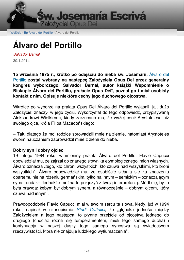 Wejście - Bp Álvaro del Portillo - Álvaro del Portillo Álvaro del Portillo Salvador Bernal 30.1.2014 15 września 1975 r., krótko po odejściu do nieba św. Josemaríi, Álvaro del Portillo został wybrany na następcę Założyciela Opus Dei przez generalny kongres wyborczego. Salvador Bernal, autor książki Wspomnienie o Biskupie Álvaro del Portillo, prałacie Opus Dei, poznał go i miał osobisty kontakt z nim. Opisuje niektóre cechy jego duchowego ojcostwa. Wkrótce po wyborze na prałata Opus Dei Álvaro del Portillo wyjaśnił, jak dużo Założyciel znaczył w jego życiu. Wykorzystał do tego odpowiedź, przypisywaną Aleksandrowi Wielkiemu, kiedy zarzucano mu, że wyżej cenił Arystotelesa niż swojego ojca, króla Filipa Macedońskiego: – Tak, dlatego że moi rodzice sprowadzili mnie na ziemię, natomiast Arystoteles swoim nauczaniem zaprowadził mnie z ziemi do nieba. Dobry syn i dobry ojciec 19 lutego 1984 roku, w imieniny prałata Álvaro del Portillo, Flavio Capucci opowiedział mu, że zajrzał do znanego słownika etymologicznego imion własnych. Álvaro oznacza „tego, kto chroni wszystkich, kto czuwa nad wszystkimi, kto broni wszystkich”. Álvaro odpowiedział mu, że osobiście skłania się ku znaczeniu opartemu nie na rdzeniu germańskim, tylko na innym – semickim – oznaczającym syna i dodał:– Jednakże można to połączyć z twoją interpretacją. Módl się, by to była prawda: żebym był dobrym synem, a równocześnie – dobrym ojcem, który czuwa nad innymi. Prawdopodobnie Flavio Capucci miał w swoim sercu te słowa, kiedy, już w 1994 roku, napisał w czasopiśmie Studi Cattolici, że „głęboka jedność między Założycielem a jego następcą, to płynne przejście od ojcostwa jednego do drugiego (chociaż różnili się temperamentem, mieli tego samego ducha) i kontynuacja w naszej duszy tego samego synostwa są świadectwem rzeczywistości, która nie znajduje ludzkiego wytłumaczenia”. 1/6 Niewątpliwie Álvaro del Portillo należy zawdzięczać, że z Bożą pomocą w Opus Dei utrzymał się, z całą swoją mocą, duch synostwa i braterstwa, właściwy dla chrześcijańskiej rodziny (por. Droga, 955). Więzy te są oparte na zasadniczej oryginalności charyzmatu. Zainicjowane przez Założyciela, nie są związane z jego serdeczną ludzką osobowością. Rodzina o nadprzyrodzonych więzach W pierwszą rocznicę swego wyboru, Álvaro del Portillo wyjaśnił skrótowo "podwójne" ojcostwo św. Josemaríi Escrivy. Pierwsze dotyczyło wyłącznie jego jako założyciela, natomiast drugie – duchowe – „zawsze będzie istniało w Dziele, aż do końca czasów, dlatego że jesteśmy rodziną o nadprzyrodzonych więzach”. W dziesięć lat po wyborze przypomniał z wdzięcznością, jak łaska Boża weszła w życie jego i w życie Opus Dei:– "Ojcostwo duchowe, ucieleśniane w niezrównany sposób przez naszego ukochanego Założyciela, przeszło na tego ubogiego człowieka, który obecnie jest waszym Ojcem. Zaprawdę, cor nostrum dilatatum est (2 Kor 6, 11). Moje serce rozszerzyło się, żeby kochać was wszystkich, każdą z was i każdego z was, miłością ojca i matki, o jaką nasz Ojciec prosił dla swoich następców". Równocześnie członkowie Dzieła odpowiedzieli oczywistą miłością, która sprawiała, że Álvaro trwał w dziękczynieniu, „dlatego że Opus Dei nadal jest bella famigliola”. Esther Toranzo opisała wizytę Álvaro del Portillo w 1989 roku w Kibondeni, ośrodku Opus Dei dla kobiet w Nairobi. Przyjęto go masajską pieśnią, z towarzyszeniem szesnastu bębnów, która zawiera następujące wersy: „Wyszedłem z domu, żeby zobaczyć ojca. / Kiedy zaczął mówić, poprosiłem go o ciszę, / dlatego że najpierw sam chciałem wyrazić mu / moją radość z tego, że go widzę”. Mnóstwo anegdot odzwierciedla ojcowskie zachowanie Álvaro del Portillo, który, bez paternalizmu kochał członków Opus Dei z czułością ziemskich ojców. Jego wspaniałej pamięci nie umykały, obok wielkich problemów Kościoła czy Dzieła, tak liczne wielkie czy drobne sprawy, z jakimi przychodziły jego dzieci. Poprzez listy, które kierowały do niego bezpośrednio, z pełną spontanicznością, wkrótce dobrze poznał ich troski, smutki i radości. Zaskakiwała mnie jego zdolność zapamiętywania tak wielu danych, dlatego że często zadawał bardzo konkretne pytania, na które nie umieliśmy odpowiedzieć. 2/6 Wielokrotnie obserwowałem jego reakcje, typowe dla ojca albo dla matki, powodowane odruchami serca, których rozum nie może wytłumaczyć. Niemal zawsze chodziło o opiekę nad chorymi lub o ich stan. Jednakże zauważalne były one również w okolicznościach, które po dokładnym przeanalizowaniu wydają się nieistotne. Albo też przy okazywaniu podziwu dla czyichś cnót i zdolności. Mimo że nigdy nie był on niesprawiedliwy ani nikomu nie czynił szkody, obcym mógł wydawać się przesadzony. Profesor językoznawstwa Ana Echaide, członek Akademii Języka Baskijskiego, wspomina spotkanie w Torreciudad w 1980 roku, dotyczące jej zamiaru współpracy przy tłumaczeniach na baskijski pism Założyciela. Álvaro pochwalił ją z miną wspólnika: – To ta, co zna baskijski najlepiej na świecie. Ból jest pieszczotą Boga 19 kwietnia 1990 roku czekaliśmy na Álvaro w akademiku Aralar w Pampelunie. Przyjechał samochodem z Barcelony. Sądząc po godzinie wyjazdu, oceniliśmy, że dotrze na miejsce około pierwszej po południu. Kiedy przygotowywaliśmy się na powitanie, zadzwonił telefon z informacją, że sporo się spóźni. Wkrótce dowiedzieliśmy się dlaczego. Zatrzymał się w Saragossie, żeby odwiedzić na oddziale oparzeń szpitala im. Michała Serweta jedną ze swoich córek. Pod koniec stycznia miała ona wypadek, w wyniku którego została poparzona na całym ciele. Leżała w izolatce, będąc nadal w bardzo ciężkim stanie. Álvaro rozmawiał z nią za pośrednictwem te
