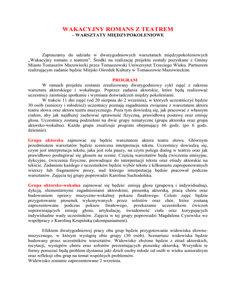 WAKACYJNY ROMANS Z TEATREM – WARSZTATY MIĘDZYPOKOLENIOWE Zapraszamy do udziału w dwutygodniowych warsztatach międzypokoleniowych „Wakacyjny romans z teatrem”. Środki na realizację projektu zostały pozyskane z Gminy Miasto Tomaszów Mazowiecki przez Tomaszowski Uniwersytet Trzeciego Wieku. Partnerem realizującym zadanie będzie Miejski Ośrodek Kultury w Tomaszowie Mazowieckim. PROGRAM W ramach projektu zostanie zrealizowany dwutygodniowy cykl zajęć z zakresu warsztatu aktorskiego i wokalnego. Poprzez zadania aktorskie, które będą realizować uczestnicy zaistnieje spotkanie i wymiana doświadczeń między pokoleniami. W trakcie 11 dni zajęć (od 20 sierpnia do 2 września), w których uczestniczyć będzie 30 osób (seniorzy i młodzież) uczestnicy poznają zagadnienia związane z warsztatem aktora teatru słowa oraz aktora teatru muzycznego. Poza tym dowiedzą się, jak pracować z własnym ciałem, aby jak najdłużej zachować sprawność fizyczną, prawidłową postawę oraz emisję głosu. Uczestnicy zostaną podzieleni na dwie grupy tematyczne (grupa aktorska oraz grupa aktorsko-wokalna). Każda grupa zrealizuje program obejmujący 66 godz. (po 6 godz. dziennie). Grupa aktorska zajmować się będzie warsztatem aktora teatru słowa. Głównym przedmiotem warsztatów będzie sceniczna interpretacja tekstu. Uczestnicy dowiedzą się, czym jest interpretacja tekstu, jaka jest rola pauzy, na czym polega dialog w teatrze oraz jak prawidłowo posługiwać się głosem na scenie. Częścią warsztatów będą ćwiczenia emisyjne, dykcyjne, ćwiczenia fizyczne, prowadzące do interpretacji tekstu oraz etiudy aktorskie na tekście. Zadaniem każdego z uczestników będzie wybór tekstu z kilkunastu zaproponowanych wierszy lub fragmentów prozy, nad którego interpretacją będzie pracował podczas warsztatów. Zajęcia tej grupy poprowadzi Karolina Suchodolska. Grupa aktorsko-wokalna zajmować się będzie: emisją głosu (grupową i indywidualną), dykcją, elementarnymi zagadnieniami aktorskimi, piosenką aktorską, pracą chóru oraz budowaniem oprawy muzyczno-wokalnej pokazu finałowego. Celem zajęć będzie przygotowanie piosenek wykonywanych przez solistów oraz chór, które zostaną zaprezentowane podczas pokazu finałowego, przekazanie uczestnikom ćwiczeń usprawniających emisję głosu, artykulację, świadomość ciała oraz korygujących indywidualne wady uczestników. Zajęcia w tej grupy poprowadzi Magdalena Cysewska we współpracy z Karoliną Krupińską (akompaniament). Efektem dwutygodniowej pracy obu grup będzie przygotowanie widowiska słownomuzycznego, w którym wystąpią obie grupy (30 osób). Scenariusz widowiska będzie budowany przez uczestników warsztatów. Widowisko złożone będzie z etiud aktorskich, recytacji, występów chóru oraz solistów prezentujących piosenkę aktorską. Wszystkie te formy poruszać będą problem dystansu jaki dzieli osoby młode od osób w wieku senioralnym oraz refleksji obu grup na temat wspólnych problemów. Widowisko zostanie zaprezentowane 2 września. INFORMACJE O OSOBACH PROWADZĄCYCH ZAJĘCIA Karolina Suchodolska (prowadzenie grupy aktorskiej) – aktorka. Absolwentka Wydziału Aktorskiego Państwowej Wyższej Szkoły Teatralnej w Białymstoku oraz Państwowej Szkoły Muzycznej I - go stopnia im. O. Kolberga w Radomiu (klasa wiolonczeli). Jako aktorka współpracuje z Bydgoskim Teatrem Lalek Buratino, Centrum Kultury Teatr w Grudziądzu oraz Bałtyckim Teatrem Dramatycznym w Koszalinie. Od 2008 r. pracuje z dziećmi, młodzieżą i dorosłymi, prowadząc warsztaty teatralne (m.in. - prowadziła grupę teatralną „Warto” w Areszcie Śledczym w Białymstoku, która otrzymała I nagrodę na Ogólnopolskim Przeglądzie Teatrów Więziennych). Laureatka ogólnopolskich konkursów recytatorskich, m. in. w Wałczu, Siedlcach, Skarżysku-Kamiennej oraz konkursów klasycznej animacji filmowej m.in. Grand Prix Letniej Akademii Filmowej w Legnicy, Międzynarodowy Festiwal Sztuki Autorów Zdjęć Filmowych PLUS CAMERIMAGE, Międzynarodowy Festiwal Sztuki Reportażu „Camera Obscura”. Magdalena Cysewska (prowadzenie grupy aktorsko-wokalnej) – wokalistka. Absolwentka Wydziału Wokalno-Aktorskiego Akademii Muzycznej w Bydgoszczy oraz Liceum Muzycznego w Zespole Szkół Muzycznych im. A. Rubinsteina w Bydgoszczy (klasa fortepianu). Pracuje jako nauczyciel śpiewu w Młodzieżowym Domu Kultury w Toruniu. Współpracuje z Teatrem Impresaryjnym Afisz, z zespołem folklorystycznym „Bałkany Śpiewają”, z chórem Opery Nova w Bydgoszczy, z zespołem „Russkaja Dusza” oraz z Biurem Turystyki Aktywnej „Kompas” (instruktor na „Obozach wokalnych”). Prowadziła warsztaty emisji głosu w ramach projektu „Teatralna Odnowa”, realizowanych przez Stowarzyszenie tARTak. Karolina Krupińska (akompaniament) – studentka IV roku Teorii Muzyki Akademii Muzycznej w Łodzi, absolwentka Państwowej Szkoły Muzycznej I i II st. im. T. Wrońskiego w Tomaszowie Mazowieckim (klasa fletu poprzecznego i fortepianu), prowadzi chór w parafii NSJ w Tomaszowie oraz sekcję wokalną Tomaszowskiego Uniwersytetu Trzeciego Wieku oraz pracuje w Państwowej Szkole Muzycznej I stopnia w Zgierzu, jako nauczyciel teorii (kształcenie słuchu, audycje muzyczne). WARUNKI UCZESTNICTWA: Koszt udziału jednej osoby wynosi 60 zł. Liczba miejsc jest ograniczona. O przyjęciu zadecyduje kolejność zgłoszeń. Osoby zainteresowane udziałem proszone są o przesłanie karty uczestnictwa do dnia 16 kwietnia, pocztą elektroniczną (adres: [email protected]) lub tradycyjną: Miejski Ośrodek Kultury Ul. Browarna 7 97-200 Tomaszów Maz. Dodatkowych informacji udziela koordynator projektu Anna Nowak: tel. (044) 724 42 93, [email protected].