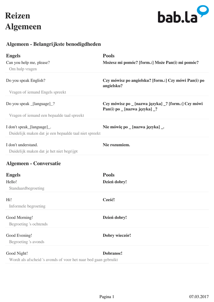 Reizen Algemeen Algemeen - Belangrijkste benodigdheden Engels Pools Can you help me, please? Om hulp vragen Możesz mi pomóc? [form.:] Może Pan(i) mi pomóc? Do you speak English? Czy mówisz po angielsku? [form.:] Czy mówi Pan(i) po angielsku? Vragen of iemand Engels spreekt Do you speak _[language]_? Czy mówisz po _ [nazwa języka] _? [form.:] Czy mówi Pan(i) po _ [nazwa języka] _? Vragen of iemand een bepaalde taal spreekt I don't speak_[language]_. Nie mówię po _ [nazwa języka] _. Duidelijk maken dat je een bepaalde taal niet spreekt I don't understand. Duidelijk maken dat je het niet begrijpt Nie rozumiem. Algemeen - Conversatie Engels Pools Hello! Standaardbegroeting Dzień dobry! Hi! Informele begroeting Cześć! Good Morning! Begroeting 's ochtends Dzień dobry! Good Evening! Begroeting 's avonds Dobry wieczór! Good Night! Dobranoc! Wordt als afscheid 's avonds of voor het naar bed gaan gebruikt Pagina 1 07.03.2017 Reizen Algemeen How are you? Beleefd naar iemands welzijn informeren Jak się masz? [form.:] Jak się Pan(i) ma? Good, thank you. Beleefd antwoord op 'Hoe gaat het?' Dobrze, dziękuję. What’s your name? Iemands naam vragen Jak się nazywasz? [form.:] Jak się Pan(i) nazywa? My name is ___. Iemand je eigen naam vertellen Nazywam się ___. Where are you from? Vragen waar iemand vandaan komt Skąd pochodzisz? [form.:] Skąd Pan(i) pochodzi? I am from___. Antwoorden waar je vandaan komt Pochodzę z ___. How old are you? Vragen hoe oud iemand is Ile masz lat? [form.:] Ile ma Pan(i) lat? I am___years old. Antwoorden hoe oud je bent Mam ___ lat(a). Yes Positief antwoord Tak No Negatief antwoord Nie Please Uitdrukking om beleefd te klinken Proszę Here you go! Gebruik je als je iemand iets geeft Proszę bardzo! Thank you. Iemand bedanken Dziękuję. Pagina 2 07.03.2017 Reizen Algemeen Thank you very much. Gebruik je als je iemand zeer bedankt Dziękuję bardzo. You're welcome. Beleefd antwoord op 'Bedankt/dankjewel' Proszę bardzo! / Nie ma za co! I am sorry. Zich ergens voor verontschuldigen Przepraszam. Excuse me. Iemands aandacht vragen Przepraszam. It's OK. Als je een verontschuldiging accepteert Nic się nie stało. No problem. Als je een verontschuldiging accepteert Nie ma sprawy. Watch out! Iemand op een gevaar attenderen Uwaga! I am hungry. Gebruik je als je hongerig bent Jestem głodny/-a. I am thirsty. Gebruik je als je dorstig bent Chce mi się pić. I am tired. Gebruik je als je moe bent Jestem zmęczony/-a. I am sick. Gebruik je als je ziek bent Źle się czuję. I don't know. Je weet het antwoord op de vraag niet Nie wiem. It was nice meeting you. Miło było cię poznać. [form.:] Miło było Panią/Pana poznać. Beleefd afscheid na een eerste ontmoeting Pagina 3 07.03.2017 Reizen Algemeen Goodbye! Beleefd vaarwel zeggen Do widzenia! Algemeen - Klachten Engels Pools I would like to make a complaint. Beleefde manier van beklag doen Chciał(a)bym złożyć skargę. Who is in charge here? Erachter komen wie verantwoordelijk is Kto tu rządzi? This is totally unacceptable! Nadrukkelijk je ontevredenheid uiten. To jest absolutnie niedopuszczalne! I want my money back! Om restitutie vragen Żądam zwrotu pieniędzy! We have been waiting for over an hour. Zich over lange wachttijden beklagen Czekamy ponad godzinę. Algemeen - Vloeken Engels Pools This food tastes like crap! Vloekend je ontevredenheid over het eten tonen To jedzenie smakuje jak gówno! This drink tastes like piss! Ten napój/drink smakuje jak szczyny! Onbeleefde manier van je ontevredenheid over het drinken tonen This place is a shithole! Vloekend je ongenoegen over een plek tonen To miejsce to obrzydliwa nora! This car is a wreck! Vloeken dat een auto niet in goede staat is Ten samochód to wrak! The service sucks! Obsługa jest do dupy! Onbeleefd je ontevredenheid over de bediening tonen Pagina 4 07.03.2017 Reizen Algemeen This is a total rip-off! Onbeleefd je beklag doen over de hoge prijs To jest totalne zdzierstwo! That is bullshit! Gówno prawda! Onbeleefd je ongelovigheid tonen over iets wat iemand zei You are a stupid moron! Kretyn/Kretynka! Iemand beledigen door zijn/haar intelligentie te bekritiseren You don't know shit! Gówno wiesz! Iemand beledigen door zijn/haar begrip te bekritiseren Piss off! Onbeleed iemand zeggen weg te gaan Odwal się! Let's settle this outside! Iemand zeggen de strijd buiten voort te zetten Załatwmy to na zewnątrz! Pagina 5 Powered by TCPDF (www.tcpdf.org) 07.03.2017