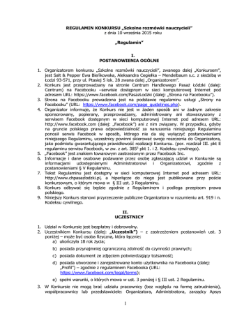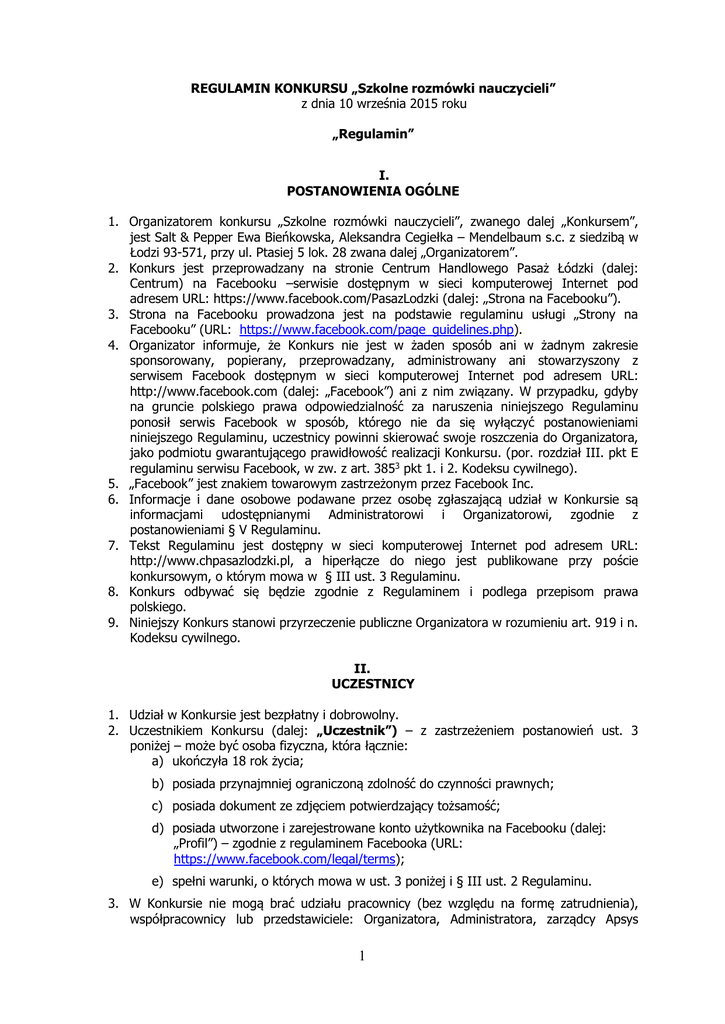 REGULAMIN KONKURSU „Szkolne rozmówki nauczycieli” z dnia 10 września 2015 roku „Regulamin” I. POSTANOWIENIA OGÓLNE 1. Organizatorem konkursu „Szkolne rozmówki nauczycieli”, zwanego dalej „Konkursem”, jest Salt & Pepper Ewa Bieńkowska, Aleksandra Cegiełka – Mendelbaum s.c. z siedzibą w Łodzi 93-571, przy ul. Ptasiej 5 lok. 28 zwana dalej „Organizatorem”. 2. Konkurs jest przeprowadzany na stronie Centrum Handlowego Pasaż Łódzki (dalej: Centrum) na Facebooku –serwisie dostępnym w sieci komputerowej Internet pod adresem URL: https://www.facebook.com/PasazLodzki (dalej: „Strona na Facebooku”). 3. Strona na Facebooku prowadzona jest na podstawie regulaminu usługi „Strony na Facebooku” (URL: https://www.facebook.com/page_guidelines.php). 4. Organizator informuje, że Konkurs nie jest w żaden sposób ani w żadnym zakresie sponsorowany, popierany, przeprowadzany, administrowany ani stowarzyszony z serwisem Facebook dostępnym w sieci komputerowej Internet pod adresem URL: http://www.facebook.com (dalej: „Facebook”) ani z nim związany. W przypadku, gdyby na gruncie polskiego prawa odpowiedzialność za naruszenia niniejszego Regulaminu ponosił serwis Facebook w sposób, którego nie da się wyłączyć postanowieniami niniejszego Regulaminu, uczestnicy powinni skierować swoje roszczenia do Organizatora, jako podmiotu gwarantującego prawidłowość realizacji Konkursu. (por. rozdział III. pkt E regulaminu serwisu Facebook, w zw. z art. 3853 pkt 1. i 2. Kodeksu cywilnego). 5. „Facebook” jest znakiem towarowym zastrzeżonym przez Facebook Inc. 6. Informacje i dane osobowe podawane przez osobę zgłaszającą udział w Konkursie są informacjami udostępnianymi Administratorowi i Organizatorowi, zgodnie z postanowieniami § V Regulaminu. 7. Tekst Regulaminu jest dostępny w sieci komputerowej Internet pod adresem URL: http://www.chpasazlodzki.pl, a hiperłącze do niego jest publikowane przy poście konkursowym, o którym mowa w § III ust. 3 Regulaminu. 8. Konkurs odbywać się będzie zgodnie z Regulaminem i podlega przepisom prawa polskiego. 9. Niniejszy Konkurs stanowi przyrzeczenie publiczne Organizatora w rozumieniu art. 919 i n. Kodeksu cywilnego. II. UCZESTNICY 1. Udział w Konkursie jest bezpłatny i dobrowolny. 2. Uczestnikiem Konkursu (dalej: „Uczestnik”) – z zastrzeżeniem postanowień ust. 3 poniżej – może być osoba fizyczna, która łącznie: a) ukończyła 18 rok życia; b) posiada przynajmniej ograniczoną zdolność do czynności prawnych; c) posiada dokument ze zdjęciem potwierdzający tożsamość; d) posiada utworzone i zarejestrowane konto użytkownika na Facebooku (dalej: „Profil”) – zgodnie z regulaminem Facebooka (URL: https://www.facebook.com/legal/terms); e) spełni warunki, o których mowa w ust. 3 poniżej i § III ust. 2 Regulaminu. 3. W Konkursie nie mogą brać udziału pracownicy (bez względu na formę zatrudnienia), współpracownicy lub przedstawiciele: Organizatora, Administratora, zarządcy Apsys 1 Polska S.A. z siedzibą w Warszawie, lokali handlowych lub usługowych na terenie Centrum oraz pozostałych podmiotów biorących bezpośredni udział w przygotowaniu i przeprowadzeniu Konkursu , ani członkowie ich rodzin. Przez członków rodziny rozumie się na potrzeby Konkursu: wstępnych, zstępnych, rodzeństwo, małżonków, rodziców współmałżonka oraz osoby pozostające w stosunku przysposobienia. III. CZAS I WARUNKI KONKURSU 1. Konkurs rozpoczyna się w dniu 14 września 2015 roku o godzinie 9.00 i trwa do dnia 20 września 2015 roku do godziny 22.00, przez co rozumie się moment, do którego Uczestnicy mają prawo zgłaszać Odpowiedź w Konkursową określoną w ust. 4 poniżej. 2. Warunkami uczestnictwa w Konkursie są łącznie: a) wykonanie zadania konkursowego, o którym mowa w ust. 4 poniżej; b) zapoznanie się z treścią Regulaminu przed przystąpieniem do Konkursu; c) udzielenie zgód i przesłanie Organizatorowi informacji, oświadczeń i danych – zgodnie z postanowieniami ust. 6, 7, 8 poniżej oraz § IV ust. 8. 3. Organizator publikuje na Fanpage’u zadanie konkursowe przy użyciu funkcjonalności „Status” udostępnianej przez Facebook tzw. post (dalej: „Pytanie Konkursowe”). Pytanie Konkursowe zostanie opublikowane w dniu 14 września 2015 roku o godz. 9.00. W treści Pytania Konkursowego Organizator publikuje również hiperłącze do adresu URL niniejszego Regulaminu (§ I ust. 7 Regulaminu). 4. Zadanie konkursowe polega na opublikowaniu komentarza (postu) do Pytania Konkursowego zawierającego odpowiedź na to Pytanie Konkursowe – przy pomocy funkcjonalności „Dodaj komentarz” („Napisz komentarz”) udostępnianej przez Facebook (dalej: „Odpowiedź Konkursowa”). Odpowiedź Konkursowa powinna być opublikowana przez Uczestnika do godz. 22.00 w dniu 20 września 2015 roku. Odpowiedź Konkursowa może mieć formę: słowną, graficzną lub słowno-graficzną – odpowiednio do Pytania Konkursowego oraz zgodnie z funkcjonalnościami udostępnianymi przez Facebook. 5. Uczestnik może opublikować tylko 1 (jedną) Odpowiedź Konkursową w czasie trwania Konkursu. W przypadku opublikowania kilku Odpowiedzi Konkursowych przez jednego Uczestnika Organizator będzie brać pod uwagę tylko pierwszą Odpowiedź Konkursową opublikowaną przez tego Uczestnika. 6. Opublikowanie Odpowiedzi Konkursowej jest równoznaczne z oświadczeniem, że Uczestnik jest wyłącznym twórcą tej Odpowiedzi Konkursowej i/lub że Uczestnikowi przysługują do niej (jako całości) nieograniczone osobiste i majątkowe prawa autorskie i prawa pokrewne, a także iż Odpowiedź Konkursowa nie narusza praw autorskich osób trzecich, uprawnień jakiejkolwiek osoby związanych z rozpowszechnianiem jej wizerunku, jest wolna od niedozwolonych zapożyczeń oraz nie mają miejsca żadne inne okoliczności, które mogłyby narazić Organizatora lub Administratora na odpowiedzialnoś