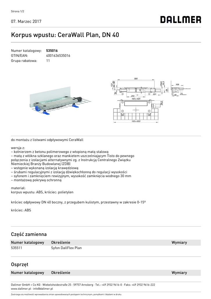 Strona 1/2 07. Marzec 2017 Korpus wpustu: CeraWall Plan, DN 40 Numer katalogowy: GTIN/EAN: Grupa rabatowa: 535016 4001636535016 11 do montażu z listwami odpływowymi CeraWall wersja z: – kołnierzem z betonu polimerowego z wtopioną matą stalową – matą z włókna szklanego oraz mankietem uszczelniającym Tisto do pewnego połączenia z izolacjami alternatywnymi zg. z Instrukcją Centralnego Związku Niemieckiej Branży Budowlanej (ZDB) – wstępnie wykonaną izolacją krawędziową – śrubami regulacyjnymi z izolacją dźwiękochłonną do regulacji wysokości – syfonem i zamknięciem rewizyjnym, wysokość zamknięcia wodnego 30 mm – montażową pokrywą ochronną materiał: korpus wpustu: ABS, króciec: polietylen króciec odpływowy DN 40 boczny, z przegubem kulistym, przestawny w zakresie 0-15º króciec: ABS Część zamienna Numer katalogowy Określenie 535511 Syfon DallFlex Plan Wymiary Osprzęt Numer katalogowy Określenie Dallmer GmbH + Co KG · Wiebelsheidestraße 25 · 59757 Arnsberg · Tel.: +49 2932 9616-0 · Faks: +49 2932 9616-222 www.dallmer.pl · [email protected] Zastrzega się możliwość wprowadzenia zmian spowodowanych postępem technicznym, pomyłkami i błędami w druku. Wymiary Strona 2/2 07. Marzec 2017 535214 535221 535238 536518 536525 536532 535269 535207 535153 535160 535177 535245 535146 535115 535122 535139 535252 535108 535030 535023 535535 Listwa odpływowa CeraWall Individual, 1000 mm Listwa odpływowa CeraWall Individual, 1100 mm Listwa odpływowa CeraWall Individual, 1200 mm Listwa odpływowa CeraWall Individual, 1300 mm Listwa odpływowa CeraWall Individual, 1400 mm Listwa odpływowa CeraWall Individual, 1500 mm Listwa odpływowa CeraWall Individual, 800 mm Listwa odpływowa CeraWall Individual, 900 mm Listwa odpływowa CeraWall Select, stal nierdzewna matowa, 1000 mm Listwa odpływowa CeraWall Select, stal nierdzewna matowa, 1100 mm Listwa odpływowa CeraWall Select, stal nierdzewna matowa, 1200 mm Listwa odpływowa CeraWall Select, stal nierdzewna matowa, 800 mm Listwa odpływowa CeraWall Select, stal nierdzewna matowa, 900 mm Listwa odpływowa CeraWall Select, stal nierdzewna polerowana, 1000 mm Listwa odpływowa CeraWall Select, stal nierdzewna polerowana, 1100 mm Listwa odpływowa CeraWall Select, stal nierdzewna polerowana, 1200 mm Listwa odpływowa CeraWall Select, stal nierdzewna polerowana, 800 mm Listwa odpływowa CeraWall Select, stal nierdzewna polerowana, 900 mm Pokrywa CeraWall Individual, kamień naturalny Pokrywa CeraWall P indywidualna Pokrywa CeraWall Select, stal nierdzewna matowa Dallmer GmbH + Co KG · Wiebelsheidestraße 25 · 59757 Arnsberg · Tel.: +49 2932 9616-0 · Faks: +49 2932 9616-222 www.dallmer.pl · [email protected] Zastrzega się możliwość wprowadzenia zmian spowodowanych postępem technicznym, pomyłkami i błędami w druku. 1000 mm 1100 mm 1200 mm 1300 mm 1400 mm 1500 mm 800 mm 900 mm 1000 mm 1100 mm 1200 mm 800 mm 900 mm 1000 mm 1100 mm 1200 mm 800 mm 900 mm