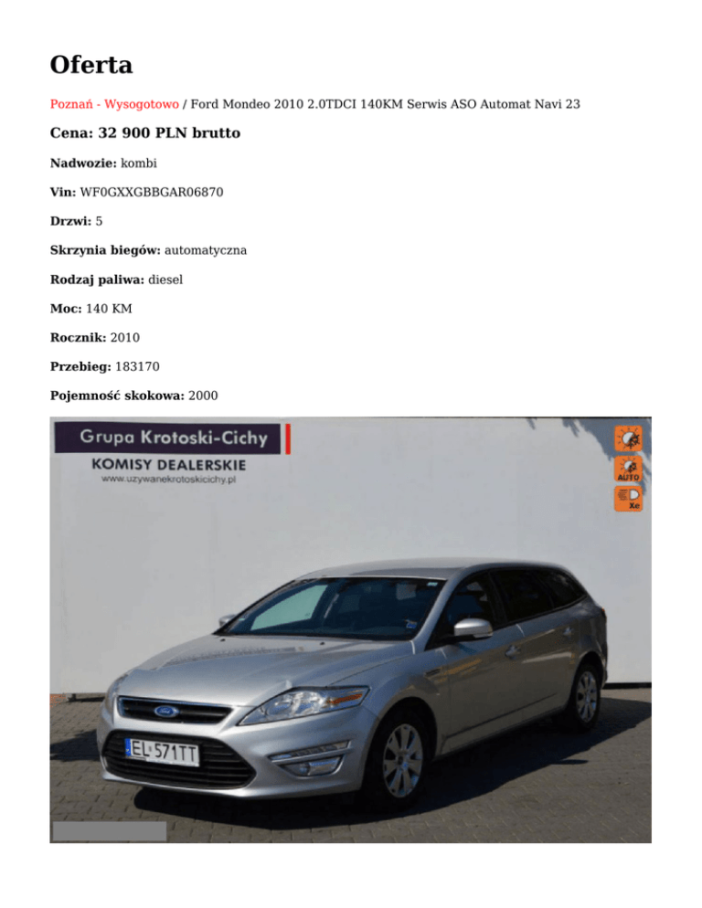Oferta Poznań - Wysogotowo / Ford Mondeo 2010 2.0TDCI 140KM Serwis ASO Automat Navi 23 Cena: 32 900 PLN brutto Nadwozie: kombi Vin: WF0GXXGBBGAR06870 Drzwi: 5 Skrzynia biegów: automatyczna Rodzaj paliwa: diesel Moc: 140 KM Rocznik: 2010 Przebieg: 183170 Pojemność skokowa: 2000 Wyposażenie: abs, kontroli trakcji (asr), kierownica wielofunkcyjna, immobiliser, centralny zamek, elektryczne szyby przednie, elektryczne lusterka, komputer pokładowy, nawigacja satelitarna, wspomaganie kierownicy, przyciemniane szyby, podgrzewana przednia szyba, stabilizacja toru jazdy (esp), poduszka pow. pasażera, poduszka pow. kierowcy, filtr czastek stałych Informacje dodatkowe: serwisowany w aso, hak holowniczy Opis: Auto-Handel-Centrum Krotoski-Cichy Autoryzowany Dealer VW Audi Seat Skoda GWARANCJA POCHODZENIA MOŻLIWOŚĆ SPRAWDZENIA POJAZDU W STACJI OBSŁUGI. MOŻLIWOŚĆ POZOSTAWIENIA SWOJEGO SAMOCHODU UŻYWANEGO W ROZLICZENIU Uwaga: Miejsce ekspozycji pojazdu - Grupa Krotoski-Cichy Salon Pojazdów Używanych Wysogotowo, ul. Skórzewska 8 Osoba kontaktowa tel: Maximilian Gera - 609 790 272 Przemysław Mantaj - 601 750 883 Mariusz Kowalewski - 609 795 053 Możliwa jazda próbna po wcześniejszym uzgodnieniu terminu Ford Mondeo 2.0TDCI 140 KM Automat Pojazd serwisowany w ASO - posiada książki serwisowe , instrukcje obsługi , etui Automatyczna skrzynia biegów Przebieg: 183 170 km Wyposażenie: Rolety przeciwsłoneczne szyb tylnych Światła do jazdy dziennej - diodowe LED System nawigacji satelitarnej CD/SD pakiet Lakier metalik Koło zapasowe dojazdowe Hak holowniczy - demontowalny Dodatkowo przyciemniane szyby tylne ABS Airbag 6 sztuk Airbag chroniący kolana kierowcy EBS - elektroniczny rozdział sił hamowania Felgi stalowe 16 cali z ogumieniem Fotel kierowcy z elektryczną regulacją wysokości Fotel kierowcy z regulacją lędźwiową Kierownica skórzana Klimatyzacja dwustrefowa z automatyczną regulacją temperatury DEATC Kolumna kierownicy regulowana w 2 płaszczyznach Komputer pokładowy Światła przeciwmgłowe przód Zamek centralny z pilotem Wspomaganie układu kierowniczego Wskaźnik temperatury zewnętrznej Szyby przednie i tylne elektryczne Sygnalizacja hamowania awaryjnego Schowek podręczny z funkcją chłodzenia Lusterka boczne w kolorze nadwozia Lusterka boczne elektryczne, ogrzewane i inne NA POWYŻSZY POJAZD WYSTAWIANA JEST FAKTURA VAT 23% - KUPUJĄCY ZWOLNIONY Z OPŁATY SKARBOWEJ ( 2% wartości pojazdu) Oferujemy kompleksową obsługę sprzedaży ratalnej na bardzo dogodnych warunkach - w celu bliższego zapoznania się z aktualną ofertą finansowania prosimy o kontakt : Katarzyna Świątkiewicz - 661 617 974 Oferujemy ubezpieczenia samochodowe z wiodących na rynku ubezpieczalni - możliwość zakupu pakietu ubezpieczeniowego na miejscu. Oferujemy możliwość jazdy próbnej przed zakupem oraz usługę inspekcji pojazdu. Przyjmujemy również w rozliczeniu każdy pojazd. Ogłoszenie ma charakter informacyjny i stanowi zaproszenie do zawarcia umowy (art. 71 Kodeksu cywilnego); nie stanowi natomiast oferty handlowej w rozumieniu art. 66 § 1 Kodeksu cywilnego. W celu sprawdzenia zgodności oferty oraz uzyskania wszelkich informacji prosimy kontaktować się z handlowcem d.s. samochodów używanych i540885215i Auto możesz zobaczyć: ul. Skórzewska 8 62-081 Wysogotowo tel: 61 816 38 06 Maximilian Gera GSM: 609 790 272 e-mail: [email protected] Przemysław Mantaj GSM: 601 750 883 e-mail: [email protected] Mariusz Kowalewski GSM: 609 795 053 e-mail: [email protected]