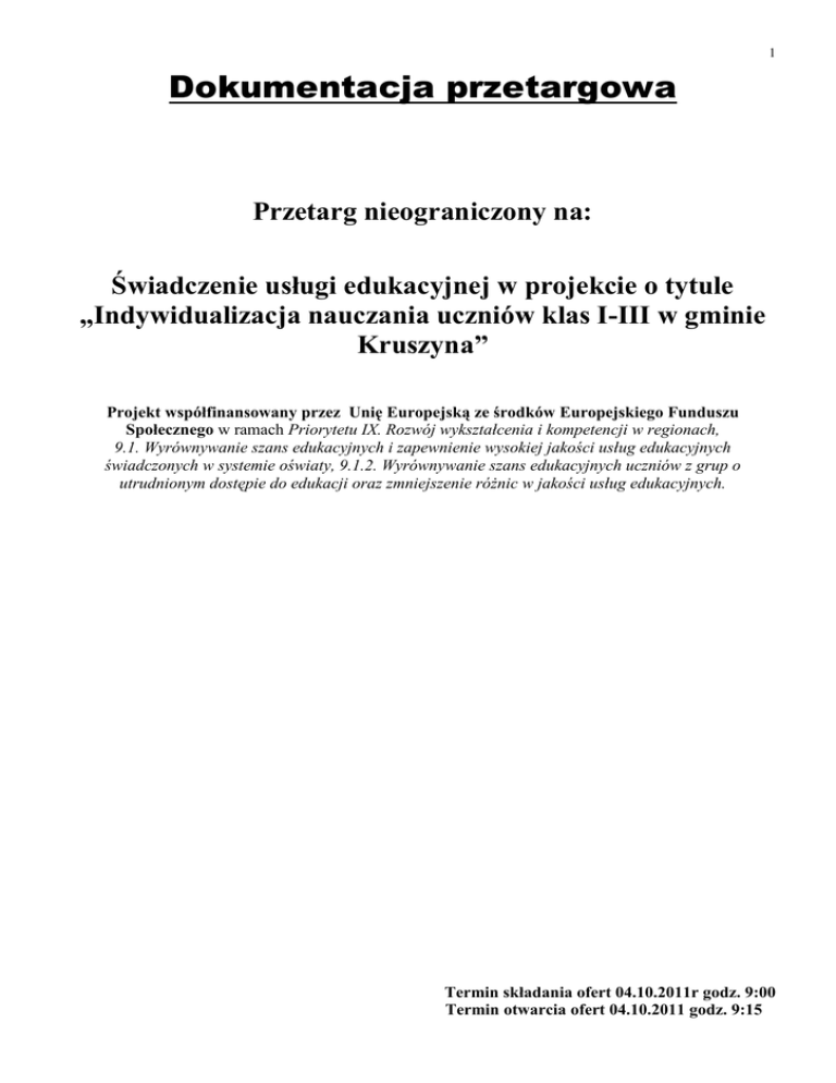 1 Dokumentacja przetargowa Przetarg nieograniczony na: Świadczenie usługi edukacyjnej w projekcie o tytule „Indywidualizacja nauczania uczniów klas I-III w gminie Kruszyna” Projekt współfinansowany przez Unię Europejską ze środków Europejskiego Funduszu Społecznego w ramach Priorytetu IX. Rozwój wykształcenia i kompetencji w regionach, 9.1. Wyrównywanie szans edukacyjnych i zapewnienie wysokiej jakości usług edukacyjnych świadczonych w systemie oświaty, 9.1.2. Wyrównywanie szans edukacyjnych uczniów z grup o utrudnionym dostępie do edukacji oraz zmniejszenie różnic w jakości usług edukacyjnych. Termin składania ofert 04.10.2011r godz. 9:00 Termin otwarcia ofert 04.10.2011 godz. 9:15 2 Numer sprawy 341/1/2011 Specyfikacja istotnych warunków zamówienia dotyczy postępowania pn: Świadczenie usługi edukacyjnej w projekcie o tytule „Indywidualizacja nauczania uczniów klas I-III w gminie Kruszyna” Ogłoszenie o przetargu ukazało się w Biuletynie Urzędu Zamówień Publicznych, na stronie internetowej Zamawiającego www.bip.kruszyna.pl oraz na tablicy ogłoszeń Zamawiającego w dniu: 28.10.2011r. I. ZAMAWIAJĄCY Gmina Kruszyna. ul. Kmicica 5 42-282 Kruszyna tel. 34 320-20-03, fax. 34 320-20-54, e-mail: [email protected] REALIZATOR Gminny Zespół Oświaty ul. Kmicica 10/2 42-282 Kruszyna tel. 34 3202409, fax. 34 3202409, e-mail: [email protected] II. 1. 2. 3. 4. 5. TRYB UDZIELANIA ZAMÓWIENIA Niniejsze postępowanie o udzielenie zamówienia publicznego prowadzone jest w trybie przetargu nieograniczonego zgodnie z art. 39 ustawy z dnia 29 stycznia 2004 r. Prawo zamówień publicznych (t. j. Dz. U. z 2010 r. Nr 113, poz. 759), zwanej dalej ustawą. Postępowanie prowadzone jest w procedurze właściwej dla zamówienia o szacunkowej wartości poniżej kwot określonych w przepisach wydanych na podstawie art. 11 ust. 8 Prawa zamówień publicznych. Usługa stanowiąca przedmiot zamówienia jest usługą niepriorytetową wg. Rozporządzenia Prezesa Rady Ministrów z dnia 28 stycznia 2010r. ws. wykazu usług o charakterze priorytetowym i niepriorytetowym (załącznik nr 2 Rozporządzenia, nr kategorii 24 – usługi edukacyjne i szkoleniowe), ustawa wyłącza stosowanie w postępowaniach o udzielenie zamówienia, gdzie przedmiotem zamówienia są usługi tego typu, przepisów ustawy dotyczących m. in. terminów składania ofert, obowiązku żądania dokumentów potwierdzających spełnianie warunków udziału w postępowaniu oraz zakazu ustalania kryteriów oceny ofert na podstawie właściwości Wykonawcy. Ponadto Zamawiający w jednym zamówieniu ujął podobne rodzajowo usługi nie chcąc dzielić zamówienia w sposób który mógłby godzić w literę ustawy z art. 32 ust 2. Zamawiający, stosuje dla postępowania przetargowego przepisy właściwe dla usług niepriorytetowych, a mogące się pojawić w przedmiocie zamówienia dostawy służą wykonaniu usługi, a ich udział wartościowy w zamówieniu będzie nieporównywalnie mniejszy od usług edukacyjnych; stąd powołując się na art. 5 ust. 2 ustawy Pzp, mając na względzie ust. 3 tegoż art., Zamawiający stosuje przepisy właściwe dla usług edukacyjnych (niepriorytetowych). Podstawa prawna opracowania specyfikacji istotnych warunków zamówienia: a. Ustawa z dnia 29 stycznia 2004 r. Prawo zamówień publicznych (t. j. Dz. U. z 2010 r. Nr 113, poz. 759); 3 b. Rozporządzenie Prezesa Rady Ministrów z dnia 30 grudnia 2009 r. w sprawie rodzajów dokumentów, jakich może żądać zamawiający od wykonawcy oraz form, w jakich te dokumenty mogą być składane (Dz. U. z 2009 r. Nr 226, poz. 1817.); c. Rozporządzenie Prezesa Rady Ministrów z 23 grudnia 2009 r. w sprawie średniego kursu złotego w stosunku do euro stanowiącego podstawę przeliczenia wartości zamówień publicznych (Dz. U. z 2009 r. Nr 224 poz. 1796); d. Rozporządzenie Prezesa Rady Ministrów z dnia 28 stycznia 2010r. ws. wykazu usług o charakterze priorytetowym i niepriorytetowym (załącznik nr 2 Rozporządzenia, nr kategorii 24 – usługi edukacyjne i szkoleniowe). III. OPIS PRZEDMIOTU ZAMÓWIENIA POZYCJA WE WSPÓLNYM SŁOWNIKU ZAMÓWIEŃ CPV: 80100000-5, 80310000-0, 80410000-1. 1. Realizacja zamówienia obejmuje świadczenie usług rozumianych jako przeprowadzanie specjalistycznych zajęć edukacyjnych wspierających indywidualizację procesu dydaktycznego, na poziomie właściwym dla nauczania w szkołach podstawowych w klasach I – III. Celem głównym usługi jest wyrównywanie szans edukacyjnych poprzez indywidualizację procesu kształcenia dzieci klas I – III w publicznych placówkach oświatowych z terenu gminy Kruszyna, tj.: Szkoła Podstawowa w Jackowie, Szkoła Podstawowa w Widzowie, Szkoła Podstawowa w Kruszynie, Szkoła Podstawowa w Lgocie Małej. Cele szczegółowe projektu to • Zmniejszenie dysproporcji edukacyjnych i rozwojowych uczniów i uczennic szkół z gminy Kruszyna poprzez udział w dodatkowych zajęciach wyrównawczych w roku szkolnym 2011/2012, • Zmniejszenie deficytów u dzieci z trudnościami w czytaniu i pisaniu, ze szkół podstawowych z gminy Kruszyna poprzez udział w dodatkowych zajęciach wyrównawczych w roku szkolnym 2011/2012, • Zmniejszenie wad wymowy u dzieci, ze szkół podstawowych z gminy Kruszyna poprzez udział w zajęciach logopedycznych w roku szkolnym 2011/2012, • Rozwinięcie zainteresowań uczniów w zakresie nauk matematyczno- przyrodniczych w roku szkolnym 2011/2012 w gminie Kruszyna, • Stworzenie warunków w szkołach objętych wsparciem umożliwiających i wspomagających indywidualną pracę nauczyciela z uczniem poprzez doposażenie bazy dydaktycznej szkół z gminy Kruszyna w niezbędne materiały dydaktyczne w roku szkolnym 2011/2012. W zajęciach z beneficjentami poruszona zostanie kwestia zasady równością szans kobiet i mężczyzn w życiu społecznym. Bezpośrednim realizatorem usługi (nauczycielem) z ramienia Wykonawcy (doświadczonej firmy szkole