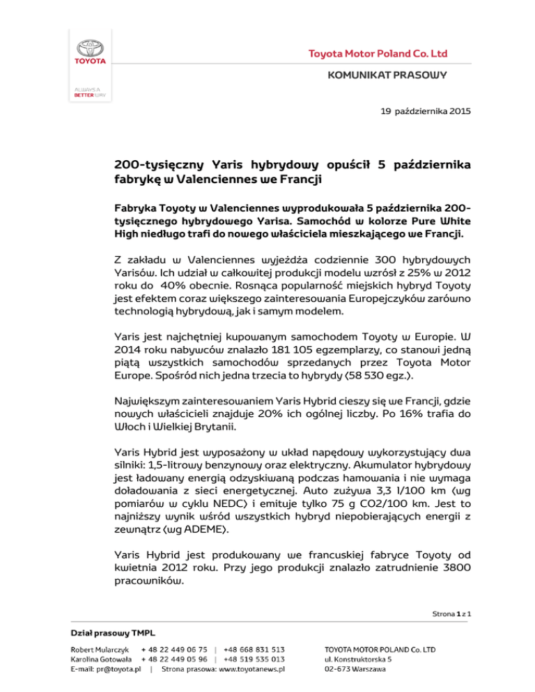 19 października 2015 200-tysięczny Yaris hybrydowy opuścił 5 października fabrykę w Valenciennes we Francji Fabryka Toyoty w Valenciennes wyprodukowała 5 października 200tysięcznego hybrydowego Yarisa. Samochód w kolorze Pure White High niedługo trafi do nowego właściciela mieszkającego we Francji. Z zakładu w Valenciennes wyjeżdża codziennie 300 hybrydowych Yarisów. Ich udział w całkowitej produkcji modelu wzrósł z 25% w 2012 roku do 40% obecnie. Rosnąca popularność miejskich hybryd Toyoty jest efektem coraz większego zainteresowania Europejczyków zarówno technologią hybrydową, jak i samym modelem. Yaris jest najchętniej kupowanym samochodem Toyoty w Europie. W 2014 roku nabywców znalazło 181 105 egzemplarzy, co stanowi jedną piątą wszystkich samochodów sprzedanych przez Toyota Motor Europe. Spośród nich jedna trzecia to hybrydy (58 530 egz.). Największym zainteresowaniem Yaris Hybrid cieszy się we Francji, gdzie nowych właścicieli znajduje 20% ich ogólnej liczby. Po 16% trafia do Włoch i Wielkiej Brytanii. Yaris Hybrid jest wyposażony w układ napędowy wykorzystujący dwa silniki: 1,5-litrowy benzynowy oraz elektryczny. Akumulator hybrydowy jest ładowany energią odzyskiwaną podczas hamowania i nie wymaga doładowania z sieci energetycznej. Auto zużywa 3,3 l/100 km (wg pomiarów w cyklu NEDC) i emituje tylko 75 g CO2/100 km. Jest to najniższy wynik wśród wszystkich hybryd niepobierających energii z zewnątrz (wg ADEME). Yaris Hybrid jest produkowany we francuskiej fabryce Toyoty od kwietnia 2012 roku. Przy jego produkcji znalazło zatrudnienie 3800 pracowników. Strona 1 z 1