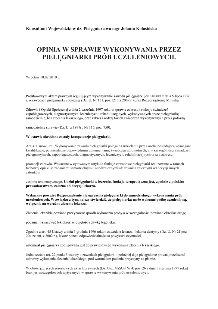 Konsultant Wojewódzki w dz. Pielęgniarstwa mgr Jolanta Kolasińska OPINIA W SPRAWIE WYKONYWANIA PRZEZ PIELĘGNIARKI PRÓB UCZULENIOWYCH. Wrocław 10.02.2010 r. Podstawowym aktem prawnym regulującym wykonywanie zawodu pielęgniarki jest Ustawa z dnia 5 lipca 1996 r. o zawodach pielęgniarki i połoŜnej (Dz. U. Nr 151, poz.1217 z 2009 r.) oraz Rozporządzenie Ministra Zdrowia i Opieki Społecznej z dnia 2 września 1997 roku w sprawie zakresu i rodzaju świadczeń zapobiegawczych, diagnostycznych, leczniczych i rehabilitacyjnych, wykonywanych przez pielęgniarkę samodzielnie, bez zlecenia lekarskiego, oraz zakres i rodzaj takich świadczeń wykonywanych przez połoŜną samodzielnie sprawie (Dz. U. z 1997r., Nr 116, poz. 750). W ustawie określone zostały kompetencje pielęgniarki. Art. 4.1. mówi, Ŝe „Wykonywanie zawodu pielęgniarki polega na udzielaniu przez osobę posiadającą wymagane kwalifikacje, potwierdzone odpowiednimi dokumentami, świadczeń zdrowotnych, a w szczególności świadczeń pielęgnacyjnych, zapobiegawczych, diagnostycznych, leczniczych, rehabilitacyjnych oraz z zakresu promocji zdrowia. Wskazane w cytowanym artykule funkcje zawodowe pielęgniarki realizowane w ramach fachowej opieki są zadaniami samodzielnymi, współzaleŜnymi ale równieŜ zaleŜnymi od decyzji innych członków zespołu terapeutycznego. Udział pielęgniarki w leczeniu, funkcja terapeutyczna jest, zgodnie z polskim prawodawstwem, zaleŜna od decyzji lekarza. Wskazane powyŜej Rozporządzenie nie uprawnia pielęgniarki do samodzielnego wykonywania prób uczuleniowych. W związku z tym, naleŜy stwierdzić, Ŝe pielęgniarka moŜe wykonać próbę uczuleniową, wyłącznie na wyraźne zlecenie lekarza. Zlecenie lekarskie powinno precyzować sposób wykonania próby a w szczególności powinno określać drogę podania, wskazywać lek określać objętość i dawkę tego leku. Zgodnie z art. 45 Ustawy z dnia 5 grudnia 1996 roku o zawodzie lekarza i lekarza dentysty (Dz. U. Nr 21 poz. 204 ze zm. z 2002 r.), lekarz ponosi odpowiedzialność za powyŜsze czynności, natomiast pielęgniarka zobligowana jest do prawidłowego wykonania zlecenia lekarskiego. Jednocześnie art. 22 punkt 5 ustawy o zawodach pielęgniarki i połoŜnej daje pielęgniarce prawną moŜliwość odmowy wykonania zlecenia lekarskiego, pod warunkiem podania przyczyny na piśmie. W obowiązujących resortowych aktach prawnych (Dz. Urz. MZiOS Nr 4, poz. 26 z dnia 5 sierpnia 1997 roku) brak jest szczegółowych wytycznych w sprawie wykonywania prób uczuleniowych. Zawarte zostały jedynie, jako obowiązujące wytyczne Ministra Zdrowia i Opieki Społecznej z dnia 23 marca 1977 roku w sprawie stosowania penicyliny i wykonywania skórnych prób uczuleniowych, mogą one stanowić pomoc w przypadku stosowania penicyliny, jej pochodnych oraz wykonywania próby przed ich podaniem. Reasumując: pielęgniarka moŜe wykonać, na wyraźne zlecenie lekarskie, próbę uczuleniową zgodnie ze wskazówkami zawartymi w zleceniu.