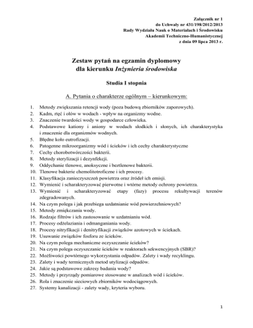 Załącznik nr 1 do Uchwały nr 431/198/2012/2013 Rady Wydziału Nauk o Materiałach i Środowisku Akademii Techniczno-Humanistycznej z dnia 09 lipca 2013 r. Zestaw pytań na egzamin dyplomowy dla kierunku Inżynieria środowiska Studia I stopnia A. Pytania o charakterze ogólnym – kierunkowym: 1. 2. 3. 4. 5. 6. 7. 8. 9. 10. 11. 12. 13. 14. 15. 16. 17. 18. 19. 20. 21. 22. 23. 24. 25. 26. 27. Metody zwiększania retencji wody (poza budową zbiorników zaporowych). Kadm, rtęć i ołów w wodach - wpływ na organizmy wodne. Znaczenie twardości wody w gospodarce człowieka. Podstawowe kationy i aniony w wodach słodkich i słonych, ich charakterystyka i znaczenie dla organizmów wodnych. Błędne koło eutrofizacji. Patogenne mikroorganizmy wód i ścieków i ich cechy charakterystyczne Cechy chorobotwórczości bakterii. Metody sterylizacji i dezynfekcji. Oddychanie tlenowe, anoksyczne i beztlenowe bakterii. Tlenowe bakterie chemolitotroficzne i ich procesy. Klasyfikacja zanieczyszczeń powietrza oraz źródeł ich emisji. Wymienić i scharakteryzować pierwotne i wtórne metody ochrony powietrza. Wymienić i scharakteryzować etapy (fazy) procesu rekultywacji terenów zdegradowanych. Na czym polega i jak przebiega uzdatnianie wód powierzchniowych? Metody zmiękczania wody. Rodzaje filtrów i ich zastosowanie w uzdatnianiu wód. Procesy odżelaziania i odmanganiania wody. Procesy nitryfikacji i denitryfikacji związków azotowych w ściekach. Usuwanie związków fosforu ze ścieków. Na czym polega mechaniczne oczyszczanie ścieków? Na czym polega oczyszczanie ścieków w reaktorach sekwencyjnych (SBR)? Możliwości powtórnego wykorzystania odpadów. Zalety i wady recyklingu. Zalety i wady termicznych metod utylizacji odpadów. Jakie są podstawowe zakresy badania wody? Metody i przyrządy pomiarowe stosowane w analizach wód i ścieków. Rola i znaczenie sieciowych zbiorników wodociągowych. Systemy kanalizacji - zalety wady, kryteria wyboru. 1 28. 29. 30. 31. 32. 33. 34. 35. 36. 37. 38. 39. 40. 41. 42. 43. 44. 45. 46. 47. 48. 49. 50. 51. 52. 53. 54. 55. Wymień podstawowe elementy instalacji centralnego ogrzewania. Wyjaśnij pojęcia: wentylacja grawitacyjna, mechaniczna i klimatyzacja. Podaj definicję mapy oraz klasyfikację ze względu na skalę. Na czym polega tworzenie mapy cyfrowej. Różnice w budowie i przydatności gospodarczej rędziny, bielicy i mady. Metody ochrony gleb przed erozją wodną. Zakwaszenie gleb i jego neutralizacja. Zmęczenie gleby – przyczyny, zapobieganie, rekultywacja. Podaj definicję układu ekologicznego. Wymień i omów rodzaje układów ekologicznych. Podaj definicję biocenozy oraz omów właściwości biocenozy, w tym hierarchiczną strukturę biocenozy. Omów typy interakcji międzygatunkowych w biocenozie ze względu na ich mechanizm i skutki. Omów przepływ energii przez łańcuch troficzny spasania i omów wydajności ekologiczne ekosystemu naturalnego. Wymień i scharakteryzuj główne typy biocenoz leśnych Polski. Przedstawić metodykę wyznaczania przepływów dyspozycyjnych. Wymienić obiekty hydrotechniczne i ich podstawowe zadania w systemowej gospodarce wodnej. Wymienić charakterystyczne poziomy piętrzenia i związane z nimi pojemności w zbiornikach retencyjnych. Przedstawić rodzaje ochrony przeciwpowodziowej wraz z obiektami i środkami ochrony. Omówić główne masy powietrza kształtujące pogodę w Polsce. Narysować schematycznie przekrój pionowy i wyjaśnić procesy zachodzące na linii frontu ciepłego i chłodnego. Wyjaśnić i narysować schematycznie mechanizm powstawania wiatru fenowego (halnego). Wyjaśnić pojecie klimatu (omówić skale klimatu) oraz podać czynniki klimatotwórcze. Wymień rodzaje taksacji nieruchomości. Źródła pozyskiwania danych taksacyjnych. Podać definicję: natężenia fali oraz poziomu natężenia i ciśnienia fali dźwiękowej i omówić szkodliwość hałasu w zależności od poziomu jego natężenia. Zdefiniować pojęcie analizy widmowej dźwięków (hałasu)i przedstawić charakterystykę podstawowych pasm częstotliwości wykorzystywanych w analizie widmowej oraz zależność określającą całkowity poziom natężenia dźwięku złożonego. Omówić system obiegu strumieni materiałowych w gospodarce, w aspekcie dbałości o stan środowiska naturalnego; pojęcia odzysku i recyklingu; rodzaje (formy) recyklingu – krótka charakterystyka i przykłady. Ogólnie scharakteryzować stosowane we współczesnej inżynierii materiałowej (omówione w kursie przedmiotu) badania mikroskopowe, dyfrakcyjne, i termiczne; wskazać proekologiczną rolę tych badań w procesie projektowania nowych materiałów oraz technologii materiałowych. Przedstawić wybrane przykłady zastosowań nanotechnologii – nanokompozyty o wysokiej wytrzymałości na bazie 2 nanorurek węglowych, modyfikatory powierzchni materiałów, bio- i grzybobójcze modyfikatory materiałów polimerowych; zagrożenia środowiskowe aplikacji nanomateriałów. B. Pytania o charakterze specjalnościowym: Technologie Materiałowe w Inżynierii Środowiska 1. 2. 3. 4. 5. 6. 7. 8. 9. 10. 11. 12. 13. 14. 15. Przedstawić co należy rozumieć pod pojęciem audytingu energetycznego, omówić ekologiczne, ekonomiczne i polityczne uwarunkowania działań w zakresie racjonalizacji gospodarowania energią. Przedstawić podstawę prawną (tzw. Dyrektywa EPBD) oraz podstawowe założenia wprowadzonego w Polsce systemu certyfikacji energetycznej budynków – jakich budynków system dotyczy, formalne wymogi w odniesieniu do osób sporządzających świadectwa, wyznaczane w świadectwie charakterystyki energetycznej budynku wskaźniki EP oraz EK. Omówić wpływ wykorzystania odnawialnych źródeł energii na wartość parametru EP – podstawowego wskaźnika jakości energetycznej budynku, wskazać, gdzie (w jaki konkretnie sposób), w metodyce obliczeniowej wyznaczania charakterystyki energetycznej, uwzględnia się wykorzystanie O