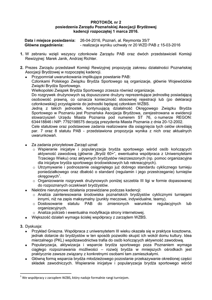 PROTOKÓŁ nr 2 posiedzenia Zarządu Poznańskiej Asocjacji Brydżowej kadencji rozpoczętej 1 marca 2016. Data i miejsce posiedzenia: Główne zagadnienia: 26-04-2016, Poznań, al. Reymonta 35/7 - realizacja wyniku uchwały nr 20 WZD PAB z 15-03-2016 1. W zebraniu wzięli wszyscy członkowie Zarządu PAB oraz dwóch przedstawicieli Komisji Rewizyjnej: Marek Janik, Andrzej Richter. 2. Prezes Zarządu przedstawił Komisji Rewizyjnej propozycję zakresu działalności Poznańskiej Asocjacji Brydżowej w rozpoczętej kadencji. Przypomniał uwarunkowania implikujące powstanie PAB: Członkami Polskiego Związku Brydża Sportowego są organizacje, głównie Wojewódzkie Związki Brydża Sportowego. Wielkopolski Związek Brydża Sportowego zrzesza również organizacje. Do rozgrywek drużynowych są dopuszczane drużyny reprezentujące jednostkę posiadającą osobowość prawną, co oznacza konieczność stosownej rejestracji lub (po deklaracji członkowskiej) przystąpienie do jednostki będącej członkiem WZBS. Jedną z takich jednostek, kontynuującą działalność Okręgowego Związku Brydża Sportowego w Poznaniu jest Poznańska Asocjacja Brydżowa, zarejestrowana w ewidencji stowarzyszeń Urzędu Miasta Poznania pod numerem ST 76, o numerze REGON: 634418846 i NIP: 7792198575 decyzją prezydenta Miasta Poznania z dnia 20-12-2002. Cele statutowe oraz podstawowe zadania realizowane dla osiągnięcia tych celów określają par. 7 oraz 8 statutu PAB - przedstawiona propozycja wynika z nich oraz aktualnych uwarunkowań. Za zadania priorytetowe Zarząd uznał: o Wspieranie inicjatyw i popularyzacja brydża sportowego wśród osób kończących aktywność zawodową (głównie „Brydż 60+”, ewentualna współpraca z Uniwersytetami Trzeciego Wieku) oraz aktywnych brydżystów niezrzeszonych (np. pomoc organizacyjna dla inicjatyw brydża sportowego środowiskowych lub rekreacyjnych). o Utrzymywanie i podnoszenie osiągniętego już dobrego standardu cyklicznego turnieju poniedziałkowego oraz dbałość o standard (regulamin i jego przestrzeganie) turniejów okręgowych1. o Organizowanie rozgrywek drużynowych poniżej szczebla III ligi w formie dopasowanej do rozpoznanych oczekiwań brydżystów. Niektóre nierutynowe działania przewidziane podczas kadencji: o Analiza zainteresowania środowiska poznańskich brydżystów cyklicznymi turniejami innymi, niż na zapis maksymalny (punkty meczowe, indywidualne, teamy). o Dostosowanie statutu PAB do zmienionych warunków regulacyjnych lub organizacyjnych. o Analiza potrzeb i ewentualna modyfikacja strony internetowej. Większość działań wymaga ścisłej współpracy z zarządem WZBS. 3. Dyskusja: Przykład Gniezna. Współpraca z uniwersytetem III wieku okazała się w praktyce kosztowna, jednak dotarcie do brydżystów w ten sposób pozwoliło skupić ich wokół domu kultury. Idea mierzalnego (PKL) współzawodnictwa trafia do osób kończących aktywność zawodową. Popularyzacja, aktywizacja i wsparcie brydża sportowego poza Poznaniem wymaga ciągłego rozpoznawania możliwości – rozwój brydża w mniejszych ośrodkach jest praktycznie zawsze związany z konkretnymi osobami tam zamieszkałymi. Główną formą wsparcia brydża młodzieżowego pozostanie przekazywanie określonej części składek zawodniczych. Wspieranie inicjatyw i popularyzacja brydża sportowego wśród 1 We współpracy z zarządem WZBS, który nadaje formalnie rangi turniejom. młodzieży – ze szczególnym uwzględnieniem szkół średnich (jak większość innych zadań odbywać się będzie we współpracy z klubem „Dąbrówka”. Pomysł sprawdzenia możliwości publikowania wyników turniejów w bezpłatnej, rozdawanej przechodniom gazecie „Nasze miasto”. Propozycja brązowej odznaki zasłużonego dla PZBS osobom, które bezinteresownie dowiodły życzliwości dla brydżystów PAB (Gniezno2, Poznań). Przedstawiciele Komisji Rewizyjnej poinformowali o jej ukonstytuowaniu się; przewodniczącym został Marcin Pędziński. Komisja dostrzegła możliwość sformułowania regulaminu swego działania – istnienie takiego dokumentu nie jest obowiązkiem wynikającym ze statutu PAB. 4. Termin kolejnego zebrania Zarządu PAB został przewidziany na przełom sezonów rozgrywek. Sekretarz: (–) Krzysztof Krause 2 Prezes: (–) Marian Wierszycki Osoba, o której była mowa, ma już brązową odznakę (wyjaśnienie późniejsze).