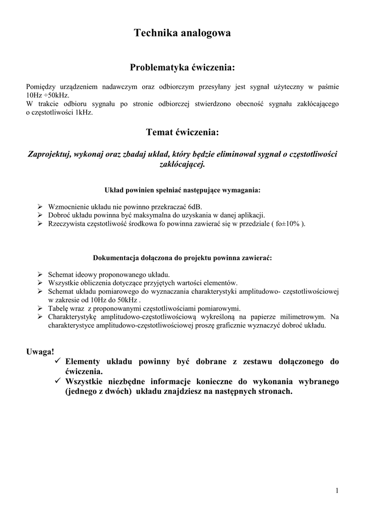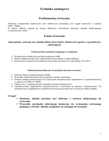 Technika analogowa Problematyka ćwiczenia: Pomiędzy urządzeniem nadawczym oraz odbiorczym przesyłany jest sygnał użyteczny w paśmie 10Hz ÷50kHz. W trakcie odbioru sygnału po stronie odbiorczej stwierdzono obecność sygnału zakłócającego o częstotliwości 1kHz. Temat ćwiczenia: Zaprojektuj, wykonaj oraz zbadaj układ, który będzie eliminował sygnał o częstotliwości zakłócającej. Układ powinien spełniać następujące wymagania: Wzmocnienie układu nie powinno przekraczać 6dB. Dobroć układu powinna być maksymalna do uzyskania w danej aplikacji. Rzeczywista częstotliwość środkowa fo powinna zawierać się w przedziale ( fo±10% ). Dokumentacja dołączona do projektu powinna zawierać: Schemat ideowy proponowanego układu. Wszystkie obliczenia dotyczące przyjętych wartości elementów. Schemat układu pomiarowego do wyznaczania charakterystyki amplitudowo- częstotliwościowej w zakresie od 10Hz do 50kHz . Tabelę wraz z proponowanymi częstotliwościami pomiarowymi. Charakterystykę amplitudowo-częstotliwościową wykreśloną na papierze milimetrowym. Na charakterystyce amplitudowo-częstotliwościowej proszę graficznie wyznaczyć dobroć układu. Uwaga! Elementy układu powinny być dobrane z zestawu dołączonego do ćwiczenia. Wszystkie niezbędne informacje konieczne do wykonania wybranego (jednego z dwóch) układu znajdziesz na następnych stronach. 1 Zastosowanie układu TL 071 w aplikacjach filtrów pasmowo – zaporowych. 1. Obudowa i wyprowadzenia – widok z góry oraz schemat aplikacyjny. Układ TL 071 jest wzmacniaczem operacyjnym wykonanym w technologii JFET. Charakteryzuje się niskim poziomem zniekształceń nieliniowych, niskimi szumami własnymi, a także posiada wewnętrzny układ kompensacji częstotliwości. Zalety te pozwalają na szerokie zastosowania układu w technice akustycznej. 2. Struktura wewnętrzna układu TL 071. 2 3. Zastosowanie TL 071 do budowy filtrów pasmowo – zaporowych w strukturze Sallen – Key. Układ filtra pasmowo – zaporowego z jednym wzmacniaczem operacyjnym (Twin – T notch filter). • Schemat ideowy układu filtra. • Charakterystyka amplitudowo – częstotliwościowa filtra. 3 • Opis układu filtra. Struktury Sallen–Key są używane do realizacji filtrów pasmowo–zaporowych o bardzo wysokiej dobroci Q. Realizacja możliwa jest z zastosowaniem pojedynczego wzmacniacza operacyjnego serii TL 071. Dla poprawnej pracy układu wymagana jest duża dokładność w doborze obliczonych wartości elementów, z zachowaniem tolerancji rzędu 1 %. Najbardziej stromą charakterystykę filtra uzyskujemy przy większej wartości dobroci, kiedy zastosowane elementy spełniają następujące warunki: R1 = R2 = R R3 = R/2 C1 = C2 = C C3 = 2 * C Istnieje możliwość dokładniejszego dostrojenia środkowej częstotliwości filtra poprzez zastosowanie dodatkowego potencjometru nastawnego, szeregowo z rezystorem R3. Rezystory R4 i R5 służą do kontroli wzmocnienia i dobroci. Rezystor R4 nie powinien być równy R5, w przeciwnym razie układ nie będzie pracował stabilnie. W praktyce R5 powinien posiadać większą ( maksymalnie 2 razy ) wartość od R4, co pozwoli na ograniczenie wzmocnienia układu do poziomu poniżej 6 dB. Układ filtra pasmowo – zaporowego z dwoma wzmacniaczami operacyjnymi (Fliege notch filter). • Schemat ideowy układu filtra oraz podstawowe zależności stosowane w obliczeniach. 4 • Charakterystyka amplitudowo – częstotliwościowa filtra. • Opis układu filtra. Ten rodzaj filtra z rodziny Sallen – Key posiada kilka zalet w porównaniu z układem poprzednim: Częstotliwość środkowa filtra jest uzyskiwana poprzez odpowiedni dobór elementów R0, C0, dla zadanej częstotliwości, przy wykorzystaniu przedstawionych powyżej zależności. Dla przyjętej wartości dobroci Q, obliczamy wartość rezystora RQ. Aby układ działał poprawnie należy zastosować elementy o wartościach zbliżonych do uzyskanych na drodze obliczeń wartości. Zaleca się zachowanie tolerancji 1%. Niedokładność zastosowanych elementów spowoduje zmianę częstotliwości środkowej f0 filtra, nie zaś jego dobroci. Dobroć filtra może być regulowana w pewnym zakresie niezależnie od wartości częstotliwości środkowej f0, poprzez zastosowanie dwóch rezystorów 1 kΩ oraz liniowego potencjometru nastawnego 1 kΩ. W tym przypadku nie jest wymagany dobór wartości elementów z zachowaniem tolerancji 1 %. Wadą powyższego układu jest zastosowanie dwóch wzmacniaczy operacyjnych oraz większa złożoność. 5