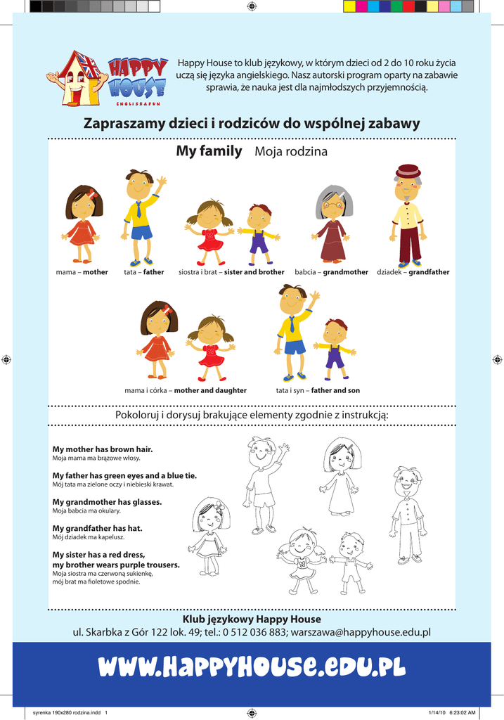 Happy House to klub językowy, w którym dzieci od 2 do 10 roku życia uczą się języka angielskiego. Nasz autorski program oparty na zabawie sprawia, że nauka jest dla najmłodszych przyjemnością. Zapraszamy dzieci i rodziców do wspólnej zabawy My family Moja rodzina mama – mother tata – father siostra i brat – sister and brother mama i córka – mother and daughter babcia – grandmother dziadek – grandfather tata i syn – father and son Pokoloruj i dorysuj brakujące elementy zgodnie z instrukcją: My mother has brown hair. Moja mama ma brązowe włosy. My father has green eyes and a blue tie. Mój tata ma zielone oczy i niebieski krawat. My grandmother has glasses. Moja babcia ma okulary. My grandfather has hat. Mój dziadek ma kapelusz. My sister has a red dress, my brother wears purple trousers. Moja siostra ma czerwoną sukienkę, mój brat ma fioletowe spodnie. Klub językowy Happy House ul. Skarbka z Gór 122 lok. 49; tel.: 0 512 036 883; [email protected] syrenka 190x280 rodzina.indd 1 1/14/10 6:23:02 AM