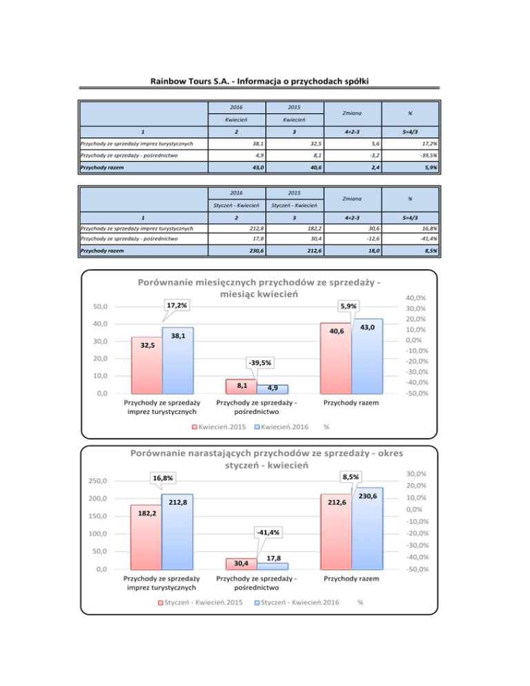 Rainbow Tours S.A. - Informacja o przychodach spółki 2016 2015 Kwiecień Kwiecień Zmiana 1 2 Przychody ze sprzedaży imprez turystycznych 3 4=2-3 38,1 Przychody ze sprzedaży - pośrednictwo Przychody razem % 5=4/3 32,5 5,6 17,2% 4,9 8,1 -3,2 -39,5% 43,0 40,6 2,4 5,9% 2016 2015 Styczeń - Kwiecień Styczeń - Kwiecień 2 3 Zmiana 1 Przychody ze sprzedaży imprez turystycznych Przychody ze sprzedaży - pośrednictwo Przychody razem % 4=2-3 5=4/3 212,8 182,2 30,6 16,8% 17,8 30,4 -12,6 -41,4% 230,6 212,6 18,0 8,5% Porównanie miesięcznych przychodów ze sprzedaży miesiąc kwiecień 17,2% 50,0 5,9% 40,0 30,0 43,0 40,6 38,1 32,5 20,0 -39,5% 10,0 8,1 0,0 Przychody ze sprzedaży imprez turystycznych 4,9 Przychody ze sprzedaży pośrednictwo Kwiecień.2015 Kwiecień.2016 40,0% 30,0% 20,0% 10,0% 0,0% -10,0% -20,0% -30,0% -40,0% -50,0% Przychody razem % Porównanie narastających przychodów ze sprzedaży - okres styczeń - kwiecień 250,0 30,0% 20,0% 230,6 200,0 150,0 8,5% 16,8% 212,8 212,6 10,0% 0,0% 182,2 -10,0% -41,4% 100,0 -20,0% -30,0% 50,0 30,4 0,0 Przychody ze sprzedaży imprez turystycznych -50,0% Przychody ze sprzedaży pośrednictwo Styczeń - Kwiecień.2015 -40,0% 17,8 Przychody razem Styczeń - Kwiecień.2016 %