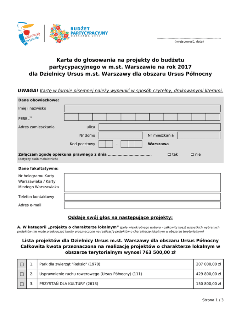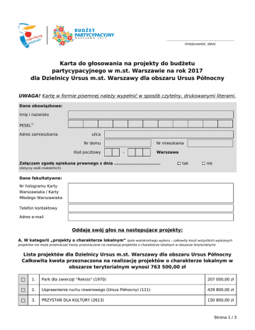 ..................................................................... (miejscowość, data) Karta do głosowania na projekty do budżetu partycypacyjnego w m.st. Warszawie na rok 2017 dla Dzielnicy Ursus m.st. Warszawy dla obszaru Ursus Północny UWAGA! Kartę w formie pisemnej należy wypełnić w sposób czytelny, drukowanymi literami. Dane obowiązkowe: Imię i nazwisko PESEL1) Adres zamieszkania ulica Nr domu Kod pocztowy Nr mieszkania - Warszawa Załączam zgodę opiekuna prawnego z dnia ……………………………… tak nie (dotyczy osób małoletnich) Dane fakultatywne: Nr hologramu Karty Warszawiaka / Karty Młodego Warszawiaka Telefon kontaktowy Adres e-mail Oddaję swój głos na następujące projekty: A. W kategorii „projekty o charakterze lokalnym” (pole wielokrotnego wyboru - całkowity koszt wszystkich wybranych projektów nie może przekraczać kwoty przeznaczone na realizację projektów o charakterze lokalnym w obszarze terytorialnym) Lista projektów dla Dzielnicy Ursus m.st. Warszawy dla obszaru Ursus Północny Całkowita kwota przeznaczona na realizację projektów o charakterze lokalnym w obszarze terytorialnym wynosi 763 500,00 zł □ 1. Park dla zwierząt "Reksio" (1970) 207 000,00 zł □ 2. Usprawnienie ruchu rowerowego (Ursus Północny) (111) 429 800,00 zł □ 3. PRZYSTAŃ DLA KULTURY (2613) 150 800,00 zł Strona 1 / 3 □ 4. Wydanie albumu "Dzieje Chóru Cantate Deo 1942-2012" (297) □ 5. Wyznaczenie naziemnych przejść dla pieszych na skrzyżowaniu ulic Orłów Piastowskich, Bony, Rakuszanki, Listopadowej (1838) □ 6. Narysowana Warszawa - Ursus Północny (686) □ 7. Budowa Wielofunkcyjnej Hali Sportowej na terenie Gimnazjum nr 133 (2504) □ 8. WARSZTATY ŚPIEWU DLA KAŻDEGO - BEZPŁATNE (2241) □ 9. "Żłobek" dla malucha (152) □ 10. Renowacja fortepianu w Ośrodku Kultury Arsus w Ursusie (1238) □ 11. Tor rowerowy dla każdego - Pumptrack i skatepark Warszawa URSUS Północny (1157) □ 12. Warsztaty dla młodzieży i dorosłych z zakresu finansów osobistych/Ursus Północny (1716) 13 164,80 zł □ 13. Yes, We Can - szkolne spotkania o demokracji (1170) 22 750,00 zł Wybrałam(/-łem) 39 000,00 zł 162 500,00 zł 33 413,00 zł 514 000,00 zł 33 600,00 zł 156 120,00 zł 40 000,00 zł 150 060,00 zł projekt(y/-ów) o charakterze lokalnym, (liczba słownie) których łączny koszt realizacji wynosi zł (kwota liczbowa) Strona 2 / 3 Na podstawie art. 23 ust. 1 pkt 1 ustawy z dnia 29 sierpnia 1997 r. o ochronie danych osobowych (Dz.U. z 2014 r. poz. 1182, z późn. zm.), wyrażam zgodę na przetwarzanie moich danych osobowych przez Prezydenta m.st. Warszawy w celu realizacji budżetu partycypacyjnego w m.st. Warszawie na rok 20172). Oświadczam, iż wszystkie informacje podane w formularzu, w tym o zamieszkiwaniu na terenie m.st. Warszawy, są zgodne z aktualnym stanem faktycznym. Oświadczam także, iż zapoznałem się z treścią zarządzenia nr 1400/2015 Prezydenta m.st. Warszawy z dnia 08.10.2015 r. w sprawie konsultacji społecznych z mieszkańcami m.st. Warszawy w zakresie budżetu partycypacyjnego na rok 2017. Jestem świadomy(-ma) możliwości weryfikacji zamieszczonych przeze mnie danych na podstawie dostępnych m.st. Warszawie rejestrów, ewidencji lub innych danych. Jestem również świadomy(-ma) odpowiedzialności wynikającej z podawania nieprawdziwych informacji i składania nieprawdziwych oświadczeń. ..................................................................... Podpis głosującego / w przypadku gdy głosującym jest osoba małoletnia podpis opiekuna prawnego Fakultatywnie: Wyrażam zgodę na otrzymywanie na powyżej podany adres e-mail informacji o przebiegu budżetu partycypacyjnego w m.st. Warszawie na rok 2017, informacji o kolejnych edycjach budżetu partycypacyjnego w m.st. Warszawie oraz informacji o konsultacjach społecznych dotyczących realizacji projektów wyłonionych w ramach budżetu partycypacyjnego w m.st. Warszawie. ..................................................................... Podpis głosującego / w przypadku gdy głosującym jest osoba małoletnia podpis opiekuna prawnego Adnotacje urzędowe: Okazano dokument pozwalający na stwierdzenie tożsamości: TAK NIE Inne uwagi ..................................................................... (podpis oraz pieczęć albo oznaczenie przyjmującego kartę) 1) Pole należy pozostawić puste, jeżeli głosującym jest mieszkaniec m.st. Warszawy będący cudzoziemcem nieposiadającym numeru PESEL. Jego udział w głosowaniu jest możliwy po uprzednim okazaniu pracownikowi Wydziału Obsługi Mieszkańców wybranego urzędu dzielnicy dokumentu podróży, wydanego przez państwo, którego jest obywatelem i jednoczesnym złożeniu oświadczenia o zgodzie na przetwarzanie danych osobowych. 2) Administratorem danych jest Prezydent m.st. Warszawy pl. Bankowy 3/5, 00-950 Warszawa. Dane osobowe przetwarzane są wyłącznie w celu realizacji budżetu partycypacyjnego w m.st. Warszawie na rok 2017 i nie będą przekazywane innym odbiorcom. Osobie, której dane dotyczą, przysługuje prawo dostępu do treści jej danych oraz możliwość ich poprawiania. Podanie danych jest dobrowolne jednak bez ich podania nie jest możliwe uczestnictwo w procesie. Strona 3 / 3