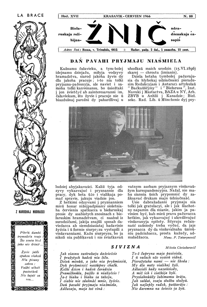 Hod. XVII Bicłaruskaja relihijna- KRASAVIK-GERVIEN 1966 N . 88 ZNIČ Adres Red: Roma, v. Trionfale, 6415 adraV v dzenskaja ea/ sopis Hadav. padp. 2 dal., 1 paatobn. 15 cent. DAN PAVAHI PRYJMAJU NIASMIEŁA K a ž n a m u čałavieku, a tym-bolej idejnamu dziejaču, miłyja vodzyvy hramadztva, siarod jakoha žyvie dy dla jakoha pracuje ; i-to nia tolki pryjazna-pačesnyja, ale naviet i samoha tolki kanvenansu, bo üsiožtaki j jon śvietčyć ab zainteresavanni im, čałaviekam, što žyvie i pracuje nie ü biazdušnaj parožni dy pahardlivaj u u h o d k a ü maich urodzin (15.VI.1896) skarej — chrostu (imianin). Dziela h e t a h a tymbolej pačuvajusia da hłybokaj udziačnaści pieradusim Redakcyjam i Autararli artykułaü " B a ć k a ü š č y n y " i " Biełarusa ", Inst. Navuki j Mastactva, BAZA u NY, Arh. ZBVB u Anhlii j Kanadzie; Bieł. sekc. Rad. Lib. ü Münchenie dyj pry- ludziej abyjakavaści. Kaliž tyja odzyvy vykazvajuć i pryznannie dla pracy, dyk heta üžo i vialikaja pom a č spravie, jakuju viadzie jon. Z hetkimi odzyvami j pryznanniem mieü honar nižejpadpisany sioletniaha červienia spatkacca u biełaruskaj presie dy asabistych znosinach z biełaruskim hramadztvam, ci naahuł iz surodzičami, jakija znajšli sposab daviedacca ab siemdziasiataj hadavinie žyćcia i ü formie siurpryzu vystupili z vinšavanniami. Kažu siurpryzu, bo ja nikoli nia publikavaü i nie śviatkavaü v a t n y m asobam pryjaznym vinšavaüšym karespandencyjna. Nažal, nie mahu siannia üsich prypomnić dy zafiksavać drukam maju üdziačnaść. Usie dabražadanni pryjmaju nia tolki jak gratulacyi, ale i jak šlachotny napamin dla mianie, jakim ja pavinien być, k a b mieü prava pačuvacca hetkim, jak vykazvajuc i akreślivajuć vinšavanyja epitety. Ščyruju rečaisn a ś ć zaüsiody treba vyčuć, da jaje pryznacca dy da vinšavalnaha üzroüniu padciahacca, prosta k a ž u č y , admaładžacca. STVIZNA Jak viasmi sustrakajii daśviećcie I firažytych hadoü nia liču. Dzien minŭü, a jaho nia prykmieciü, Dyk prykmiecić nastŭpny chaČŭ. Kolki dzion i hadoü čaradoju Pramilhnŭła, pajslo ü niabyčcio ! ja-ž biahu i biahu za taboju, I ciabie nie zdahnać mnie, zyćcio. Dan pavahi pryjmaju niaśmiela, Adčuvaju, maja tut vind : Mons. P. Tatarynovič Mikola. Chviedarovic To-ž cupryna maja pasiviela, I ü vačach užo vosien vidnd. Pieražytaha nami — nie škoda My dla mety vialikaj šyli. Adlacieli hady nazaüsiody, A miž ich i ciažkija byli. Prysiahnŭüšy lubimamu kraju, Jak saldat, svaju sluzbu słužyü. Jak najlepšy.radok, paütardju : Nie daremna na śviecie ja žyü. Ž N IC 2 AD M C L T 0 8 N. 88 A N N O S ! Našaj redacyjaj atrymana, razam z padanaj t u t zdy mka j , paciaša j u ča j a viestka, što prabyvajučy ü belhijskim Louvenie na emihracyi Jaho Ekscelencyja Monsinjor BALESŁAÜ SŁOSKANS, Apostalski Administratar Mienski j Mahiloüski, hłyboka šanavany j cenieny ščyra addanymi biełarusami kat. na baćkauščynie j n a e m i hracyi, jak ichni dyjecezalny herojski Pastyr i r u p n a čuły, pamima słaboh a n a d t a vysnažanaha mučanictvam zdaroüja, Apia- kun, — apošnimi časami prajšoü pamysnuju kuracyju pry pomačy ščaśliva nadaranaha zdolnaha lekara, svajho kališniaha vučnia, i ciapier čujecca vielmi dobra, jak admaładzieły. H e t a śćviardžaje j dałučanaja t u t zdymka, tak miła prezentujučaja Dasto j naha Rekan valescenta ü abojmach z emihranckimi dzietkami. Vitajučy J a h o Ekscelencyju z adrodžanym zdaroüjem, paručajemsia dalejšaj łaskavaj idejna-duchovaj apiecy. — Redakcaja BALZAM ZYVOJ Z tvaich krynic piü ja balzam žyvoj vady I padbiraü tady dla piesien novyja łady Ü darozie ich padsłuchaü sercam i dušoj, I radaść vobrazaü zachopnych tam znajsoü. Radzima, holas tvoj mianie śpiavać vučyü, I ty mnie addala ad rodnych słoü klucy. VADY Prysddami šyćcia ich ja ü śviet panios, Nia viedaju, jaki moj budzie los. Ü majoj dušy pieraklikajucca jany Čaroünaj kazkapt i sonca, i viasny. Vierš napisany niezabaŭna pierad aryštam i vyvazam. Jazep PuŠca r " ;&s|Kfp#|§#^# wmši§ jy#ilfi%*»ž^, ^. y^:m^~ ••-• • »iffš&kišif'iM'••.&•• " '' WiWW^ Siabrv z-nad Naračv DVA Pobač z kubkam sčaścia na stale Boh pastaviü kubak, poüny hora. Pienaju adśviečvah ü imhle Pa susiedztvu — mora kala mora. Pałažyüšy na plačo rukŭ, Usiavyšni raiü Čałavieku : — Pi stodzienna pa adnym Chopić ščaścia da skančennia hłytkŭ vieku. I da niazvyčajnaha pitva Paśpiašaüsia syn ziamli prypdści. Ledź pakaštavaü — i hałavd Kruta zakružyłasia ad ščdścia. I zusim zabyüsy pra nakdz Dy niby zryvajučysia z krŭčy, Kl BKM Vypiü jon sałodki vir Asusyü da dna bakał Patruś Makal urdz, sypŭčy. Ałe pić niaütołnaja dusa Nieadołna znoü i znoü prasiła. Smdha, ledźvie čutnaja śpiarsa. Zabradziła, jak ślapaja siła. Spjana nie razhlcdziaüsy biady, Syn ziamli pryhubiü kubak hora. . . Tak pieramianilisia tady Šcascie z horam, niby z moram mora. Popłec z całaviekam z tej pary, Dzie jaho ni kinie padarožža, Chodziać dva varožyja viry — Chto, skažecie, ich raźvieści moža ? N. 88 Ź N IC t ^ Dr. STANISLAVU IIK1\KIEVI(1 PASIIIERTKI Horkaja dola biełarusaü — jak vidzicie darahija čytačy — nekroloh za nekroloham, amal u k a ž n y m n u m a r y našaj presy ! A jość miž imi j takija, jak i hety voś, što t u t pačynajem, katoryja tre byłob samymi ślaźmi pisać, płačam = pryčytanniem ahłašać, jak niekali harotnicy matki našyja aüdaviełyja ; asabliva tady, kali biaźlitasnaja śmierć im najdaražejšych vyryvała ü roskvicie žyćcia j pracy, nahła, niepryhatavana da adsut- . naści ichnich ruk sercaü i hałovaü, da razłuki ź imi rodnymi naviek. T a m u stajać jany jašče j siannia moü dziejnyja j nadziejnyja, poünyja | inicyjatyvy, rady, brat- j niaha pryznannia, ci da- ! koru, pieraściarohi dy da- | p a m o h i ; s