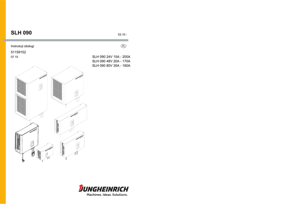 SLH 090 03.10 - p Instrukcji obsługi 51159152 SLH 090 24V 15A - 200A SLH 090 48V 20A - 170A SLH 090 80V 35A - 160A 07.15 100% >80% <80% AIR 100% >80% <80% AIR 100% >80% <80% AIR 100% >80% <80% AIR 100% >80% <80% AIR 100% >80% <80% Wskazówki dotyczące instrukcji eksploatacji Wskazówki dotyczące instrukcji eksploatacji Bezpieczna eksploatacja prostownika wymaga dokładnego zapoznania się z informacjami podanymi w niniejszej ORYGINALNEJ INSTRUKCJI EKSPLOATACJI. Informacje podane są w krótkiej, przejrzystej formie. Poszczególne rozdziały oznaczone są literami, a strony są ponumerowane. Bezpieczna eksploatacja prostownika wymaga dokładnego zapoznania się z informacjami podanymi w niniejszej ORYGINALNEJ INSTRUKCJI EKSPLOATACJI. Informacje podane są w krótkiej, przejrzystej formie. Poszczególne rozdziały oznaczone są literami, a strony są ponumerowane. W instrukcji eksploatacji opisane są różne prostowniki. Odpowiednie dane znajdują się w danych technicznych w załączniku (patrz rozdział „Dane techniczne”). Przy wykonywaniu prac konserwacyjnych oraz w trakcie eksploatacji należy stosować się do instrukcji odnoszących się do odpowiedniego prostownika. W instrukcji eksploatacji opisane są różne prostowniki. Odpowiednie dane znajdują się w danych technicznych w załączniku (patrz rozdział „Dane techniczne”). Przy wykonywaniu prac konserwacyjnych oraz w trakcie eksploatacji należy stosować się do instrukcji odnoszących się do odpowiedniego prostownika. Nasze prostowniki podlegają ciągłemu rozwojowi. Dlatego zastrzegamy sobie prawo do zmian w formie, wyposażeniu i technice. Z tego względu treść niniejszej instrukcji eksploatacji nie może stanowić podstawy do jakichkolwiek roszczeń dotyczących określonych właściwości prostownika. Nasze prostowniki podlegają ciągłemu rozwojowi. Dlatego zastrzegamy sobie prawo do zmian w formie, wyposażeniu i technice. Z tego względu treść niniejszej instrukcji eksploatacji nie może stanowić podstawy do jakichkolwiek roszczeń dotyczących określonych właściwości prostownika. Prawa autorskie Prawa autorskie Prawa autorskie do niniejszej instrukcji eksploatacji należą do firmy JUNGHEINRICH AG. Prawa autorskie do niniejszej instrukcji eksploatacji należą do firmy JUNGHEINRICH AG. Jungheinrich Aktiengesellschaft Jungheinrich Aktiengesellschaft Am Stadtrand 35 22047 Hamburg - Deutschland Am Stadtrand 35 22047 Hamburg - Deutschland Telefon: +49 (0) 40 6948-0 Telefon: +49 (0) 40 6948-0 www.jungheinrich.com www.jungheinrich.com 07.15 PL Wstęp 07.15 PL Wstęp 3 3 4 4 07.15 PL 07.15 PL Spis treści A Informacje ogólne.................................................................... 7 A Informacje ogólne.................................................................... 7 1 Cel instrukcji eksploatacji ........................................................................ 7 1 Cel instrukcji eksploatacji ........................................................................ 7 B Bezpieczeństwo ...................................................................... 9 B Bezpieczeństwo ...................................................................... 9 1 2 3 3.1 4 5 Informacje ogólne .................................................................................... Wskazówki dotyczące tabliczek i symboli ............................................... Kwalifikacje personelu ............................................................................. Zastosowanie przemysłowe .................................................................... Eksploatacja zgodna z przeznaczeniem ................................................. Wskazówki bezpieczeństwa dotyczące usuwania usterek i konserwacji 9 10 11 11 12 14 1 2 3 3.1 4 5 Informacje ogólne .................................................................................... Wskazówki dotyczące tabliczek i symboli ............................................... Kwalifikacje personelu ............................................................................. Zastosowanie przemysłowe .................................................................... Eksploatacja zgodna z przeznaczeniem ................................................. Wskazówki bezpieczeństwa dotyczące usuwania usterek i konserwacji 9 10 11 11 12 14 C Dane produktu......................................................................... 15 C Dane produktu......................................................................... 15 1 2 3 3.1 4 5 6 6.1 6.2 6.3 6.4 Opis produktu i jego funkcji ..................................................................... Oznaczenie typu...................................................................................... Opis wyposażenia i jego funkcji............................................................... Wtyk ładowania ....................................................................................... Ryzyko resztkowe.................................................................................... Opis zabezpieczeń .................................................................................. Oznaczenia i tabliczki umieszczone na prostowniku ............................... Tabliczka znamionowa (przykład) ........................................................... Naklejka z ustawionym fabrycznie programem ładowania ...................... Tabliczka z mocą typową ........................................................................ Oznaczenie prostownika z charakterystyką do chłodni ........................... 15 16 17 17 18 20 21 21 21 21 22 1 2 3 3.1 4 5 6 6.1 6.2 6.3 6.4 Opis produktu i jego funkcji ..................................................................... Oznaczenie typu...................................................................................... Opis wyposażenia i jego funkcji............................................................... Wtyk ładowania ..