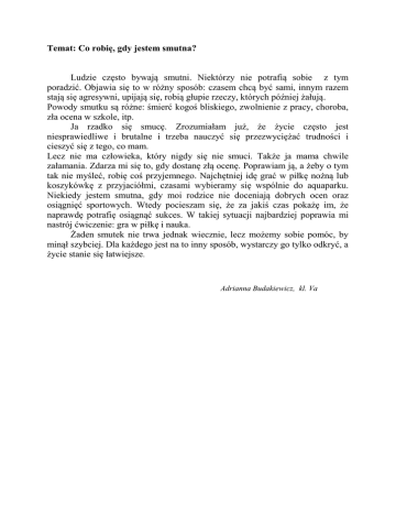 Temat: Co robię, gdy jestem smutna? Ludzie często bywają smutni. Niektórzy nie potrafią sobie z tym poradzić. Objawia się to w różny sposób: czasem chcą być sami, innym razem stają się agresywni, upijają się, robią głupie rzeczy, których później żałują. Powody smutku są różne: śmierć kogoś bliskiego, zwolnienie z pracy, choroba, zła ocena w szkole, itp. Ja rzadko się smucę. Zrozumiałam już, że życie często jest niesprawiedliwe i brutalne i trzeba nauczyć się przezwyciężać trudności i cieszyć się z tego, co mam. Lecz nie ma człowieka, który nigdy się nie smuci. Także ja mama chwile załamania. Zdarza mi się to, gdy dostanę złą ocenę. Poprawiam ją, a żeby o tym tak nie myśleć, robię coś przyjemnego. Najchętniej idę grać w piłkę nożną lub koszykówkę z przyjaciółmi, czasami wybieramy się wspólnie do aquaparku. Niekiedy jestem smutna, gdy moi rodzice nie doceniają dobrych ocen oraz osiągnięć sportowych. Wtedy pocieszam się, że za jakiś czas pokażę im, że naprawdę potrafię osiągnąć sukces. W takiej sytuacji najbardziej poprawia mi nastrój ćwiczenie: gra w piłkę i nauka. Żaden smutek nie trwa jednak wiecznie, lecz możemy sobie pomóc, by minął szybciej. Dla każdego jest na to inny sposób, wystarczy go tylko odkryć, a życie stanie się łatwiejsze. Adrianna Budakiewicz, kl. Va