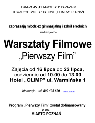 FUNDACJA „FILMOWIEC” z POZNANIA TOWARZYSTWO SPORTOWE „OLIMPIA” POZNAŃ zapraszają młodzież gimnazjalną i szkół średnich na bezpłatne Warsztaty Filmowe „Pierwszy Film” Zajęcia od 16 lipca do 22 lipca, codziennie od 10.00 do 13.00 Hotel „OLIMP” ul. Warmińska 1 Informacje: tel. 502 198 629, [email protected] Program „Pierwszy Film” został dofinansowany przez MIASTO POZNAŃ