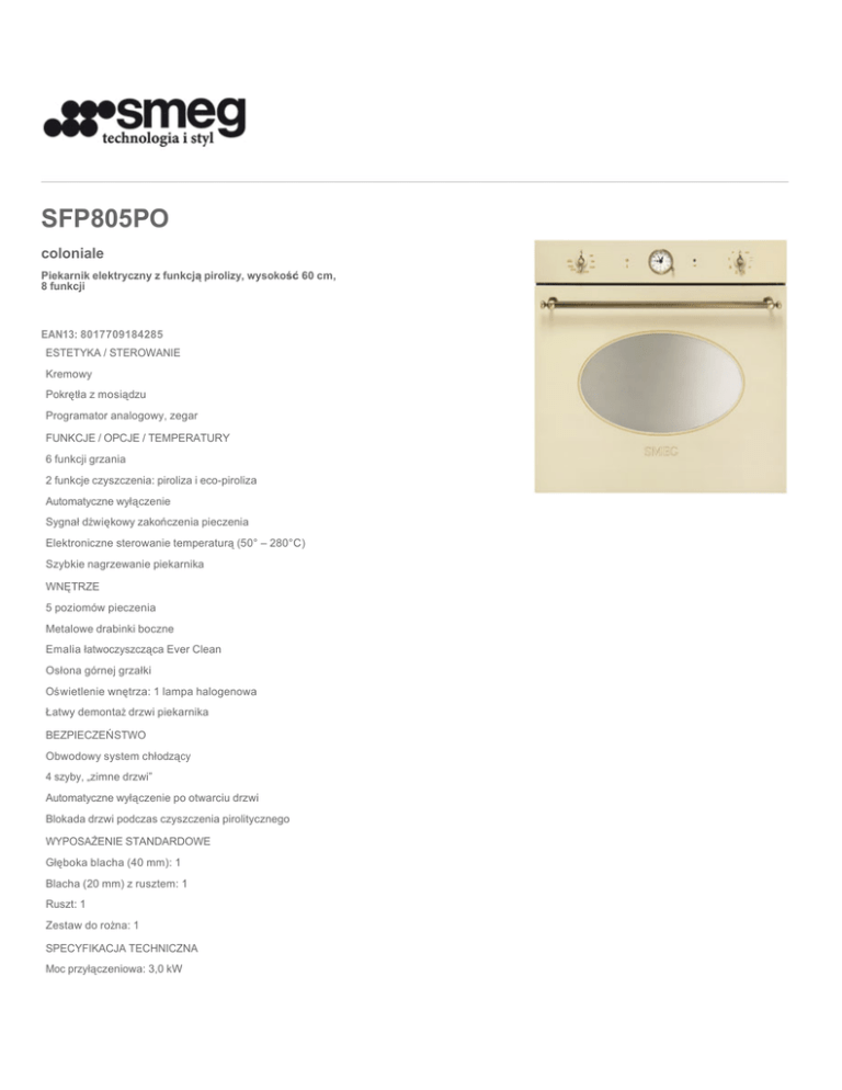 SFP805PO coloniale Piekarnik elektryczny z funkcją pirolizy, wysokość 60 cm, 8 funkcji EAN13: 8017709184285 ESTETYKA / STEROWANIE Kremowy Pokrętła z mosiądzu Programator analogowy, zegar FUNKCJE / OPCJE / TEMPERATURY 6 funkcji grzania 2 funkcje czyszczenia: piroliza i eco-piroliza Automatyczne wyłączenie Sygnał dźwiękowy zakończenia pieczenia Elektroniczne sterowanie temperaturą (50° – 280°C) Szybkie nagrzewanie piekarnika WNĘTRZE 5 poziomów pieczenia Metalowe drabinki boczne Emalia łatwoczyszcząca Ever Clean Osłona górnej grzałki Oświetlenie wnętrza: 1 lampa halogenowa Łatwy demontaż drzwi piekarnika BEZPIECZEŃSTWO Obwodowy system chłodzący 4 szyby, „zimne drzwi” Automatyczne wyłączenie po otwarciu drzwi Blokada drzwi podczas czyszczenia pirolitycznego WYPOSAŻENIE STANDARDOWE Głęboka blacha (40 mm): 1 Blacha (20 mm) z rusztem: 1 Ruszt: 1 Zestaw do rożna: 1 SPECYFIKACJA TECHNICZNA Moc przyłączeniowa: 3,0 kW Moc dużego grilla: 2,7 kW Napięcie: 220-240 V Zabezpieczenie: 13 A Częstotliwość: 50/60 Hz Functions Wersje SFP805P - kremowy, złote pokrętła SFP805AO - antracyt, pokrętła z mosiądzu SFP805A - antracyt, złote pokrętła Smeg Polska Sp. z o.o. ul. Cybernetyki 9 02-677 Warszawa Tel. +48 22 276 14 00 SFP805PO coloniale pirolityczne 60 cm kremowy klasa energochłonności A elektryczne Klasa A: Klasa A piekarnika zapewnia niskie zużycie energii. DRZWI Z POCZWÓRNYM SZKŁEM: Modele piekarników z funkcją pirolitycznego czyszczenia są wyposażone w poczwórnie przeszklone drzwi. Podczas pirolizy zewnętrza powierzchnia pozostaje zimna zapewniając maksymalne bezpieczeństwo użytkowania. Dwie wewnętrzne szyby odbijają ciepło, co ma znaczenie dla efektywności używanej energii. POZIOMY PIEKARNIKA: Piekarniki firmy SMEG z maksymalna pojemnością 72 litrów posiadają 5 poziomów, co zapewnia maksymalną elastyczność w użytkowaniu. Pozwala to na oszczędność czasu potrzebnego do przyrządzenia kilku potraw w tym samym czasie albo konieczności przygotowania dużych ilości. DEMONTOWALNE SZKŁO WEWNĘTRZNE: W większości piekarników firmy SMEG szkło wewnątrz drzwi jest łatwe w demontażu, co również znacznie ułatwia utrzymanie w czystości urządzenia. JEDNOLITE SZKŁO WEWNĘTRZNE: W większości piekarników firmy SMEG zainstalowane w drzwiach szkło wewnętrzne posiada wyjątkowo gładką powierzchnię, bez żadnych wkrętów, co znacznie ułatwia utrzymanie w czystości urządzenia. STATYCZNY SYSTEM CHŁODZENIA: Innowacyjny STATYCZNY system chłodzenia pomaga chronić meble od nadmiernej temperatury podczas pracy urządzenia. MAXI OBJĘTOŚĆ: Komora kuchni wolnostojącej 70 l (brutto is 90 l) SZYBKIE NAGRZEWANIE: Ta opcja pozwala na szybkie nagrzanie piekarnika do wskazanej temperatury (w zależności od modelu trwa to od 6 do 9 minut) dla zwiększenia szybkości przygotowania potrawy. CHŁODNE DRZWI: Większość piekarników firmy SMEG posiada “chłodne drzwi”. Dzięki połączeniu systemu obwodowego chłodzenia i wewnętrznym szybom odbijającym ciepło, temperatura zewnętrznej powierzchni drzwi jest utrzymywana poniżej 50 ° C. Dodatkowo system ten chroni meble będące w kontakcie z piekarnikiem przed przegrzewaniem. OSŁONA GÓRNEJ GRZAŁKI: Rozwiązanie to chroni górną część piekarnika przed zanieczyszczeniem. Element chroniący jest łatwy w demontażu i może być myty w zmywarce. EMALIA ŁATWOCZYSZCZĄCA EVER CLEAN: Emalia, którą jest pokryte wnętrze piekarników. Jest niezwykle łatwa w czyszczeniu, ze względu na znikomą interakcję z tłuszczami i odporność na różne kwasy. WENTYLATOR, GRZAŁKA GÓRNA I DOLNA: Grzałki w połączeniu z wentylatorem zapewniają równomierną temperaturę w całej komorze. Jest to metoda dająca podobne efekty do pieczenia tradycyjnego. Mniej wydajna od użycia wentylatora i 3 grzalek. Najlepsza do wypieku ciast. GRZAŁKA GÓRNA I DOLNA: Włączenie tych 2 grzałek stosuje się w pieczeniu tradycyjnym, odpowiednim do przygotowanie potraw wymagających delikatnego podgrzewania, jak np. pieczenie ciasta. Piekarnik powinien zostać wstępnie nagrzany do wymaganej temperatury, a naczynie ustawione po środku. Jest to metoda , która najlepiej sprawdza się w przypadku większych, pojedynczych wypieków. WENTYLATOR, GRZAŁKA PIERŚCIENIOWA, GÓRNA I DOLNA: Grzałki w połączeniu z wentylatorem zapewniają równomierną temperaturę w całej komorze, na wszystkich półkach. Jest to metoda dająca podobne efekty do pieczenia na rożnie, poruszając powietrze wokół potrawy zamiast poruszać potrawą. ECO: Ustawienie ECO pozwala na szybkie wstępne podgrzanie piekarnika. Włączenie dolnej grzałki, grzałki grilla i wentylatora zapewnienia optymalną wydajność. Funkcja jest użyteczna w połączeniu z wybranym zasadniczym programem pieczenia. WENTYLATOR I GRZAŁKA GRILLA: Pieczenie przy uzyciu tej funkcji musi przebiegać przy zamkniętych drzwiczkach. Wentylator łagodzi silne grzanie grilla, jednocześnie zapewniając doskonałe grillowanie bez potrzeby odwracania pieczonej potrawy. Otrzymujemy potrawę doskonale przypieczoną, a zarazem soczystą. Najlepsze efekty zapewnia pieczenie na dwóch górnych półkach. Dolna część piekarnika może być w tym czasie wykorzystana do podgrzania innych potraw. ROŻEN I 1 SEKCJA GRZAŁKI GRILLA: Ten symbol pozwala na wybranie funkcji rożna z połową grzałki grilla. PIROLIZA: Czyszczenie pirolityczne w temperaturze 500ºC usuwa wszelkie zanieczyszczenia wewnątrz piekarnika. Proces zajmuje od 1,5 do 3 godzin w zależności od stopnia zanieczyszczenia piekarnika. ECO PIROLIZA: Czyszczenie pirolityczne ECO jest wykorzystywane w przypadku delikatnych zanieczyszczeń. Proces ten trwa 1,5 godziny. Smeg Polska Sp. z o.o. ul. Cybernetyki 9 02-677 Warszawa Tel. +48 22 276 14 00 SFP805PO coloniale pirolityczne 60 cm kremowy klasa energochłonności A elektryczne Smeg Polska Sp. z o.o. ul. Cybernetyki 9 02-677 Warszawa T