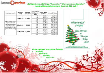 Reklamówka HDPE typ "koszulka" "Przyjazna środowisku" z nadrukiem świątecznym [pakiet 200 szt.] Nazwa artykułu Rozmiar [cm] 17x5x35 Reklamówka HDPE typ "koszulka" "Przyjazna środo23x5x40 wisku" z nadrukiem świątecznym [pakiet 200 szt.] 24x5,5x45 zamawiana grubość ilość pakiefolii [mm] tów 0,0085 0,009 0,0095 10 20 30 100 10 20 30 100 10 20 30 100 Cena netto [pakiet] 6,50 5,92 5,72 6,25 7,15 6,56 6,35 6,88 7,93 7,33 7,11 7,63 zł zł zł zł zł zł zł zł zł zł zł zł Wartość netto 65,00 118,40 171,45 625,00 71,50 131,20 190,50 687,50 79,30 146,56 213,36 762,50 zł zł zł zł zł zł zł zł zł zł zł zł Cena zawiera wszystkie koszty: • projekt, • matryca, • nadruk, • dostawa Torba papierowa biała lub brązowa z uchem płaskim , papier Kraft 70-80 g/m2 z nadrukiem świątecznym Nazwa artykułu Rozmiar [cm] 17x9x23 Torba papierowa z nadrukiem świątecznym 22x11x24,5 22x10x30 Pojemność torby 3500 ml 6000 ml 6000 ml zamawiana ilość Cena netto [szt.] Wartość netto 1 000 0,62 zł 620,00 zł 2 000 0,52 zł 1 040,00 zł 5 000 0,47 zł 2 350,00 zł 1 000 0,70 zł 700,00 zł 2 000 0,60 zł 1 200,00 zł 5 000 0,54 zł 2 700,00 zł 1 000 0,91 zł 910,00 zł 2 000 0,87 zł 1 740,00 zł 5 000 0,61 zł 3 050,00 zł Cena zawiera wszystkie koszty: • projekt, • matryca, • nadruk, • dostawa.