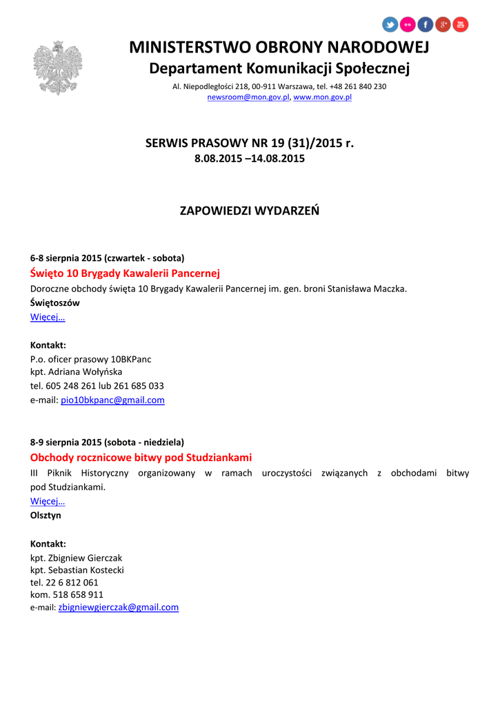 MINISTERSTWO OBRONY NARODOWEJ Departament Komunikacji Społecznej Al. Niepodległości 218, 00-911 Warszawa, tel. +48 261 840 230 [email protected], www.mon.gov.pl SERWIS PRASOWY NR 19 (31)/2015 r. 8.08.2015 –14.08.2015 ZAPOWIEDZI WYDARZEŃ 6-8 sierpnia 2015 (czwartek - sobota) Święto 10 Brygady Kawalerii Pancernej Doroczne obchody święta 10 Brygady Kawalerii Pancernej im. gen. broni Stanisława Maczka. Świętoszów Więcej… Kontakt: P.o. oficer prasowy 10BKPanc kpt. Adriana Wołyńska tel. 605 248 261 lub 261 685 033 e-mail: [email protected] 8-9 sierpnia 2015 (sobota - niedziela) Obchody rocznicowe bitwy pod Studziankami III Piknik Historyczny organizowany w ramach uroczystości związanych z obchodami bitwy pod Studziankami. Więcej… Olsztyn Kontakt: kpt. Zbigniew Gierczak kpt. Sebastian Kostecki tel. 22 6 812 061 kom. 518 658 911 e-mail: [email protected] 10-22 sierpnia 2015 (poniedziałek - sobota) Szkolenie doskonalące Szkolenie doskonalące nurków 1 Pułku Saperów i 5 Kresowego Batalionu Saperów 17 Wielkopolskiej Brygady Zmechanizowanej. Wędrzyn – Jezioro Rakowe, Ośrodek Szkolenia Poligonowego Kontakt: 17WBZ ppor. Dorota Kusiak tel. 261 674 241 tel. kom. 695 885 032 e-mail:[email protected] 11 sierpnia 2015 (wtorek) Wizyta wiceministra Jankowskiego w Bielsku-Białej i Cieszynie Podsekretarz stanu w MON Maciej Jankowski uda się z jednodniową wizytą do Bielska - Białej i Cieszyna. W programie: godz. 10.00 – uroczystość poświęcenia odrestaurowanego grobu śp. płk. Józefa Kossarka na cmentarzu rzymsko – katolickim w Bielsku – Białej; godz. 11.00 – uroczystość złożenia wieńców i zapalenie znicza na mogile śp. plut. Edwarda Biesoka ps. „Edek” w Mazańcowicach; godz. 12.00 – pokaz musztry paradnej na rynku Cieszyna, w wykonaniu Orkiestry Wojskowej w Krakowie; godz. 13.00 – zwiedzanie prywatnego Muzeum 4 Pułku Strzelców Podhalańskich w Cieszynie; godz. 13.50 – Wizyta w Ośrodku Edukacji Obronnej – Cieszyńska Kompania Obrony Narodowej. Bielsko - Biała, Cieszyn Kontakt: Departament Komunikacji Społecznej MON tel.+48 261 840 230 e-mail: [email protected] 11 sierpnia 2015 (wtorek) Podniesienie bandery 33. rocznica podniesienia biało-czerwonej bandery na okręcie szkolnym ORP Iskra. Gdynia Kontakt: Rzecznik prasowy 3 Flotylli Okrętów kmdr ppor. Radosław Pioch tel. 261 266 971 kom. 601 412 722 12 sierpnia 2015 (środa) Akcja Honorowych Dawców Krwi Żołnierze i pracownicy Centrum Szkolenia Łączności i Informatyki oddadzą honorowo krew. Zegrze Kontakt: kpt. Krzysztof Baran tel. 261 883 610 kom. 722 380 053 e-mail: [email protected] 13 sierpnia 2015 (czwartek) Zmiana Dowódcy w szczecińskim Korpusie Uroczysta ceremonia zmiany Dowódcy Wielonarodowego Korpusu Północno-Wschodniego. Więcej… Szczecin Kontakt: Szef Biura Prasowego ppłk Eric Gusenburger tel. +48 603 989 134 lub mjr Zbigniew Garbacz tel. +48 603 989 137 14 sierpnia 2015 (piątek), godz. 14.00 Wręczenie medali i wyróżnień resortowych Z udziałem kierowniczej kadry MON oraz kadry dowódczej SZ, odbędzie się uroczystość wręczania medali i wyróżnień resortowych. Szczegóły w oddzielnym komunikacie. Warszawa, Centrum Konferencyjne WP (ul. Żwirki i Wigury 9/13) Kontakt: Departament Komunikacji Społecznej MON tel.+48 261 840 230 e-mail: [email protected] 14 sierpnia 2015 (piątek), godz. 20.00 Apel Pamięci Przed pomnikiem Poległych w 1920 r., odczytany zostanie Apel Pamięci połączony z zapaleniem zniczy na mogiłach żołnierzy poległych w latach 1919-1920 oraz złożeniem wieńców i wiązanek kwiatów. Warszawa (Powązki - cmentarz wojskowy) Kontakt: Departament Komunikacji Społecznej MON tel.+48 261 840 230 e-mail: [email protected] 14 sierpnia 2015 (piątek), godz. 21.00 Uroczystość patriotyczno – religijna Przy krzyżu upamiętniającym śmierć ks. mjr. Ignacego Skorupki w Ossowie, odbędzie się uroczystość patriotyczno – religijna. Ossowo Kontakt: Departament Komunikacji Społecznej MON tel.+48 261 840 230 e-mail: [email protected] 15 sierpnia 2015 (sobota) Obchody święta Wojska Polskiego W garnizonach na terenie całego kraju odbędą się obchody święta Wojska Polskiego i 95. rocznicy Bitwy Warszawskiej. Centralne uroczystości zaplanowano w Warszawie. Szczegóły w oddzielnym komunikacie. Terytorium RP, Warszawa Kontakt: Departament Komunikacji Społecznej MON tel.+48 261 840 230 e-mail: [email protected] KRONIKA 31 lipca 2015 (piątek) 71. rocznica wybuchu Powstania Warszawskiego W dniach 30 lipca - 1 sierpnia w Warszawie odbyły się centralne uroczystości upamiętniające wybuch Powstania Warszawskiego. Więcej… 1 sierpnia 2015 (sobota) Szef MON na uroczystości nominacji generalskich W sobotę 1 sierpnia wicepremier, minister obrony narodowej Tomasz Siemoniak wziął udział w uroczystości nadania przez Prezydenta RP Bronisława Komorowskiego nominacji generalskich i odznaczeń państwowych oraz pożegnania generałów kończących zawodową służbę wojskową. Więcej… 4 sierpnia 2015 (wtorek) SKON na temat inwestycji dla armii Wielomilionowe inwestycje w infrastrukturę poligonową i szkoleniową, wyposażenie w najnowocześniejsze i najbardziej zaawansowane bezzałogowe systemy latające to najbliższe plany dla Centrum Szkolenia Wojsk Lądowych (CSWL) w Drawsku Pomorskim oraz 12 Komendy Lotniska w Mirosławcu. Więcej… 4 sierpnia 2015 (wtorek) W 2016 r. podwyżki dla żołnierzy i funkcjonariuszy Wicepremier, minister obrony narodowej Tomasz Siemoniak i minister spraw wewnętrznych Teresa Piotrowska uzgodnili dziś z ministrem finansów kwoty na podwyżki wynagrodzeń i uposażeń w resortach: obrony narodowej i spraw wewnętrznych. Więcej… 5 sierpnia 2015 (środa) Stan przygotowań do szczytu NATO Przygotowania do szczytu NATO, który odbędzie się w dniach 8 – 9 lipca 2016 roku były tematem posiedzenia sejmowej komisji obrony. - Celem Polski na szczyt NATO w Warszawie jest wzmocnienie całości s