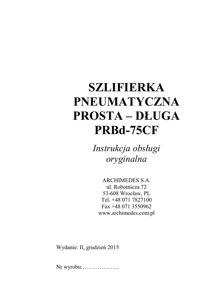 SZLIFIERKA PNEUMATYCZNA PROSTA – DŁUGA PRBd-75CF Instrukcja obsługi oryginalna ARCHIMEDES S.A. ul. Robotnicza 72 53-608 Wrocław, PL Tel. +48 071 7827100 Fax +48 071 3550962 www.archimedes.com.pl Wydanie: II, grudzień 2015 Nr wyrobu:……………….. 1. WSTĘP Niniejsza instrukcja powinna być starannie przechowywana i zawsze dostępna dla operatora, zakładowej służby BHP i innych osób związanych z obsługą narzędzi pneumatycznych. Informacje tu zawarte są istotne z punktu widzenia bezpieczeństwa pracy, właściwej eksploatacji, konserwacji i utylizacji wyrobu, a ponadto ułatwiają zamawianie części zamiennych. Operator – przed przystąpieniem do pracy – powinien dokładnie zapoznać się z treścią niniejszego dokumentu i upewnić się, że informacje tu zawarte są dla niego zrozumiałe. W przypadku jakichkolwiek wątpliwości dotyczących użytkowania naszych wyrobów, prosimy o kontakt ze sprzedawcą lub bezpośrednio z firmą Archimedes we Wrocławiu. Identyfikacja czasu produkcji wyrobu Narzędzia pneumatyczne posiadają trwały, indywidualny numer fabryczny składający się z co najmniej pięciu cyfr. Dwie pierwsze cyfry odnoszą się do roku budowy wyrobu, a następne oznaczają kolejny egzemplarz wyrobu wyprodukowanego w danym roku. 2. CHARAKTERYSTYKA I PRZEZNACZENIE WYROBU Szlifierka pneumatyczna – prosta PRBd-75CF zaprojektowana jest do pracy narzędziami trzpieniowymi (Ø6 i Ø8), z wykorzystaniem ściernic spojonych sztywnych i elastycznych listkowych oraz szczotek (zwykłychdrucianych lub z nasypem ściernym). Ma zastosowanie do czyszczenia elementów metalowych, usuwania rdzy, starych powłok lakierniczych i do innych podobnych prac. Ze względu na wydłużony korpus wrzeciona może być wykorzystana do obróbki głębokich wnęk i otworów. Szlifierka posiada wbudowany regulator prędkości obrotowej, który zapewnia stałe obroty w szerokim zakresie obciążeń. Przeznaczona jest do obróbki zgrubnej i dokładnej odlewów, odkuwek, złączy spawanych, szlifowania spoin itd. Szlifierki te znajdują szerokie zastosowanie w przemyśle odlewniczym, kuzienniczym, elektromaszynowym, konstrukcji stalowych itp. -1- 3. PARAMETRY TECHNICZNO – EKSPLOATACYJNE Średnica trzpienia narzędzia roboczego Prędkość obrotowa biegu luzem ( max ) Moc Zużycie powietrza pod obciążeniem Długość Masa (bez ściernicy) Gniazdo końcówki powietrznej Wewnętrzna średnica przewodu powietrznego Ciśnienie zasilania /max/ Poziom ciśnienia akustycz. na stanowisku pracy Poziom mocy akustycznej Całkowita wartość drgań 1) 2) - 6 i 8 mm 9 600 obr./min 1,1 kW 85 m3/h 680 mm 2,6 kg G 3/8 12,5 mm 0,63 MPa 84,8 1) ± 1,1 dB(A) 95,4 1) ± 0,8 dB(A) 1,26 2) ± 0,01 m/s2 mierzonych zgodnie z PN-EN ISO 15744 mierzonych zgodnie z PN-EN ISO 28662-4 4. BEZPIECZEŃSTWO Operator przed przystąpieniem do pracy szlifierką powinien być dokładnie zapoznany z przepisami obowiązującymi na swoim stanowisku pracy oraz z treścią niniejszej instrukcji obsługi. Ściśle przestrzegać ogólnych przepisów dotyczących pracy zmechanizowanymi narzędziami ręcznymi. Szlifierka nie posiada powłoki izolacyjnej. Zetknięcie się narzędzia ze źródłem energii elektrycznej grozi porażeniem operatora. Zawsze należy odłączyć narzędzie od sieci sprężonego powietrza przed wykonaniem jakichkolwiek czynności związanych z wymianą narzędzia roboczego (ściernicy, szczotki) lub przed przeprowadzeniem konserwacji czy naprawy narzędzia. Stosować wyroby szlifierskie o zalecanej wielkości, właściwego kształtu i wytrzymałości oraz bez uszkodzeń mechanicznych. Sprawdzać, czy narzędzie robocze jest przystosowane do pracy z prędkością obrotową, jaką uzyskuje szlifierka (patrz punkt 3). -2- Okresowo i po każdym demontażu sprawdzać obroty biegu luzem wrzeciona. Obroty zmierzone przy ciśnieniu 0,63 MPa nie mogą przekraczać obrotów nominalnych narzędzia. Nie wolno zwiększać ciśnienia powietrza powyżej 0,63 MPa. Nie wolno pracować szlifierką bez osłony tarczy ściernej na otwartej przestrzeni. Unikać sytuacji, gdy podczas szlifowania nie ma możliwości obserwowania strefy pracy. Bezzwłocznie przerwać pracę, gdy nastąpi poluzowanie się tarczy szlifierskiej na wrzecionie. Nie usuwać blokady z dźwigni uruchamiającej narzędzie w /poz. 17/, chroniącej przed przypadkowym uruchomieniem narzędzia. Nie blokować dźwigni uruchamiającej narzędzie w pozycji „praca”. Dźwignia ta po zwolnieniu nacisku ręki powinna wracać w położenie spoczynkowe, a narzędzie powinno się wyłączyć. Zadbać o to, by w miejscu pracy był łatwy dostęp do urządzeń odcinających dopływ powietrza. Nie stosować uszkodzonych węży powietrznych. Wąż taki może być przyczyną wypadku. Stosować węże obliczone na ciśnienie robocze wynoszące co najmniej 0,63 MPa. Unikać nadmiernego smarowania narzędzia, ponieważ olej wydostający się z narzędzia w postaci mgły jest szkodliwy dla środowiska naturalnego i dla operatora. Pomieszczenie pracy powinno być dobrze wentylowane. W przypadku przedostania się smaru lub oleju do oczu, należy bezwzględnie skorzystać z pomocy medycznej. Nie uruchamiać szlifierki bez ściernicy z luźno nałożonymi na wrzeciono elementami mocującymi (poz. 18 ÷ 20). Szlifierka przystosowana jest do pracy bez osłony narzędzia roboczego, stąd bezwzględnie należy stosować okulary ochronne oraz ochronniki słuchu; zaleca się używać rękawic ochronnych. Szlifierka podczas pracy powinna być trzymana w obu rękach; Mocowanie jej w imadle, stojaku itp. nie jest zalecane, a przy braku na stanowisku awaryjnego, szybko reagującego wyłącznika zasilania – wręcz zabronione. Po zakończeniu pracy zamknąć zawór sieciowy sprężonego powietrza. -3- Stanowisko pracy operatora powinno być oddzielone od innych stanowisk pracy; Powinno być dobrze oświetlone i uporządkowane. Nie używać szlifierki w środowisku materiałów łatw