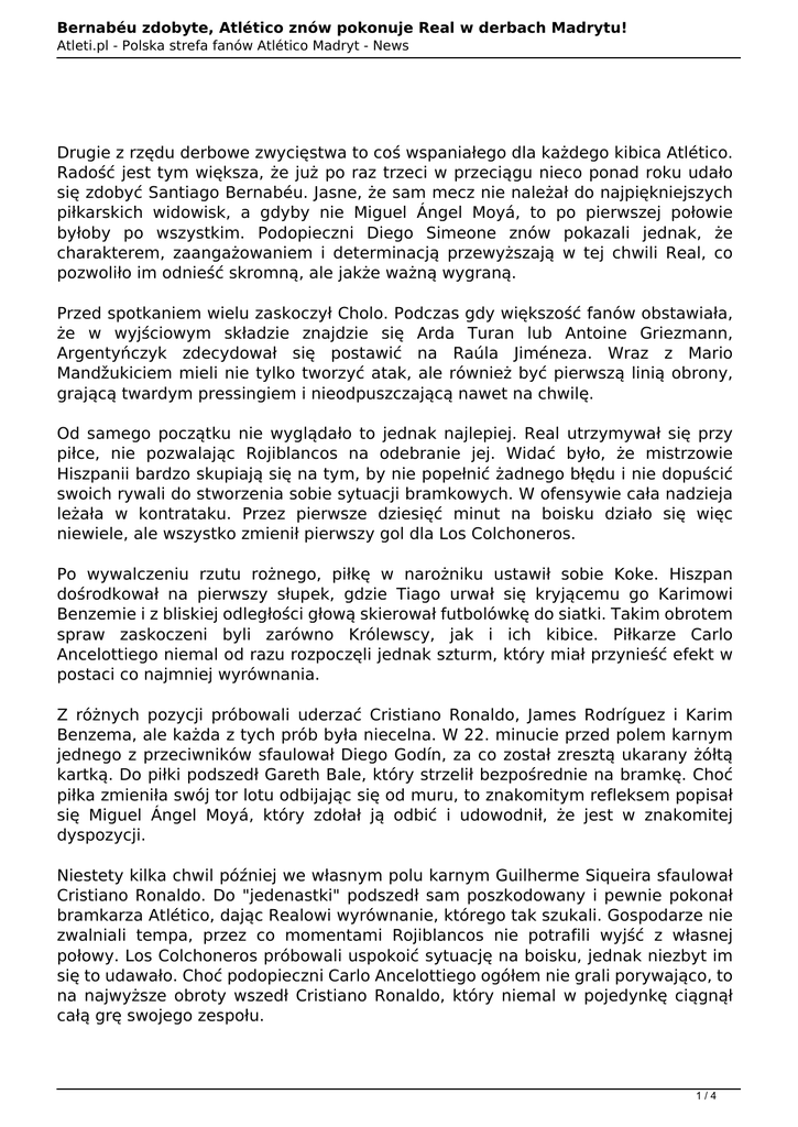 Bernabéu zdobyte, Atlético znów pokonuje Real w derbach Madrytu! Atleti.pl - Polska strefa fanów Atlético Madryt - News Drugie z rzędu derbowe zwycięstwa to coś wspaniałego dla każdego kibica Atlético. Radość jest tym większa, że już po raz trzeci w przeciągu nieco ponad roku udało się zdobyć Santiago Bernabéu. Jasne, że sam mecz nie należał do najpiękniejszych piłkarskich widowisk, a gdyby nie Miguel Ángel Moyá, to po pierwszej połowie byłoby po wszystkim. Podopieczni Diego Simeone znów pokazali jednak, że charakterem, zaangażowaniem i determinacją przewyższają w tej chwili Real, co pozwoliło im odnieść skromną, ale jakże ważną wygraną. Przed spotkaniem wielu zaskoczył Cholo. Podczas gdy większość fanów obstawiała, że w wyjściowym składzie znajdzie się Arda Turan lub Antoine Griezmann, Argentyńczyk zdecydował się postawić na Raúla Jiméneza. Wraz z Mario Mandžukiciem mieli nie tylko tworzyć atak, ale również być pierwszą linią obrony, grającą twardym pressingiem i nieodpuszczającą nawet na chwilę. Od samego początku nie wyglądało to jednak najlepiej. Real utrzymywał się przy piłce, nie pozwalając Rojiblancos na odebranie jej. Widać było, że mistrzowie Hiszpanii bardzo skupiają się na tym, by nie popełnić żadnego błędu i nie dopuścić swoich rywali do stworzenia sobie sytuacji bramkowych. W ofensywie cała nadzieja leżała w kontrataku. Przez pierwsze dziesięć minut na boisku działo się więc niewiele, ale wszystko zmienił pierwszy gol dla Los Colchoneros. Po wywalczeniu rzutu rożnego, piłkę w narożniku ustawił sobie Koke. Hiszpan dośrodkował na pierwszy słupek, gdzie Tiago urwał się kryjącemu go Karimowi Benzemie i z bliskiej odległości głową skierował futbolówkę do siatki. Takim obrotem spraw zaskoczeni byli zarówno Królewscy, jak i ich kibice. Piłkarze Carlo Ancelottiego niemal od razu rozpoczęli jednak szturm, który miał przynieść efekt w postaci co najmniej wyrównania. Z różnych pozycji próbowali uderzać Cristiano Ronaldo, James Rodríguez i Karim Benzema, ale każda z tych prób była niecelna. W 22. minucie przed polem karnym jednego z przeciwników sfaulował Diego Godín, za co został zresztą ukarany żółtą kartką. Do piłki podszedł Gareth Bale, który strzelił bezpośrednie na bramkę. Choć piłka zmieniła swój tor lotu odbijając się od muru, to znakomitym refleksem popisał się Miguel Ángel Moyá, który zdołał ją odbić i udowodnił, że jest w znakomitej dyspozycji. Niestety kilka chwil później we własnym polu karnym Guilherme Siqueira sfaulował Cristiano Ronaldo. Do "jedenastki" podszedł sam poszkodowany i pewnie pokonał bramkarza Atlético, dając Realowi wyrównanie, którego tak szukali. Gospodarze nie zwalniali tempa, przez co momentami Rojiblancos nie potrafili wyjść z własnej połowy. Los Colchoneros próbowali uspokoić sytuację na boisku, jednak niezbyt im się to udawało. Choć podopieczni Carlo Ancelottiego ogółem nie grali porywająco, to na najwyższe obroty wszedł Cristiano Ronaldo, który niemal w pojedynkę ciągnął całą grę swojego zespołu. 1/4 Bernabéu zdobyte, Atlético znów pokonuje Real w derbach Madrytu! Atleti.pl - Polska strefa fanów Atlético Madryt - News Jeszcze przed przerwą Karima Benzemę dwukrotnie zatrzymał Miguel Ángel Moyá. Najpierw zawodnik mistrzów Hiszpanii uprzedził Francuza, któremu po świetnym podaniu z lewej strony odskoczyła w "szesnastce" piłka. Kilka chwil później 30-latek znów popisał się fantastyczną interwencją, odbijając niezwykle groźne uderzenie głową z pięciu metrów. W końcowych fragmentach gra nieco się uspokoiła. Kibice Atlético czuli, że udało się przetrwać pierwszą falę ataku Królewskich, jednak naprawdę nie było wiadomo, czego spodziewać się po przerwie. Na drugą połowę oba zespoły wyszły bez zmian. Piłkarze Diego Simeone opanowali nieco wydarzenia na murawie i mecz znów wyglądał tak, jak na początku pierwszych 45 minut. Real starał się przejąc inicjatywę, miał nawet optyczną przewagę w posiadaniu piłki, jednak nic z tego się nie rodziło. Goście natomiast rozbijali przede wszystkim akcje swoich rywali, szukając cały czas okazji do szybkiego i skutecznego kontrataku. Królewskim nie dawał już tyle Cristiano Ronaldo, co przy słabej postawie jego kolegów zredukowało sytuacje bramkowe niemalże do zera. Po godzinie gry przeprowadzone zostały pierwsze zmiany. W miejsce Gabiego na boisku pojawił się Arda Turan, co wyraźnie poprawiło grę Atlético w ofensywie. Kilka minut później na murawie zameldował się Antoine Griezmann, dzięki czemu mistrzowie Hiszpanii coraz śmielej i coraz lepiej atakowali. Real natomiast oddawał jedynie pojedyncze strzały z dystansu, które nie miały nic wspólnego z celnością. W 73. minucie bliski strzelenia gola był Arda Turan, jednak jego strzał z pola karnego był minimalnie niecelne. Jednak co się odwlecze, to nie uciecze. Kilkadziesiąt sekund później Turek wyprowadził Los Colchoneros na prowadzenie. Z prawej strony Antoine Griezmann ściągnął na siebie trzech rywali, po czym podał do stojącego Juanfrana. Prawy obrońca podał płasko w "szesnastkę" do Raúl Garcíi, który jednak przepuścił piłkę, dzięki czemu skutecznym uderzeniem mógł się popisać Turek. Gospodarze znów próbowali zerwać się do ataków, ale tym razem nie wyszło im to tak, jak w pierwszej połowie. Królewscy naciskali i raz za razem zbliżali się do pola karnego ekipy z Vicente Calderón, ale na tym się skończyło. W 90. minucie szansę na dobicie Realu miał jeszcze Antoine Griezmann, ale po urwaniu się obrońcy strzelił on w boczną siatkę. Dzięki zwycięstwu na Santiago Bernabéu podopieczni Diego Simeone mają po trzech kolejkach siedem punktów, plasując się tym samym w czołówce tabeli. Za tydzień podejmą u siebie Celtę, jednak wcześniej 