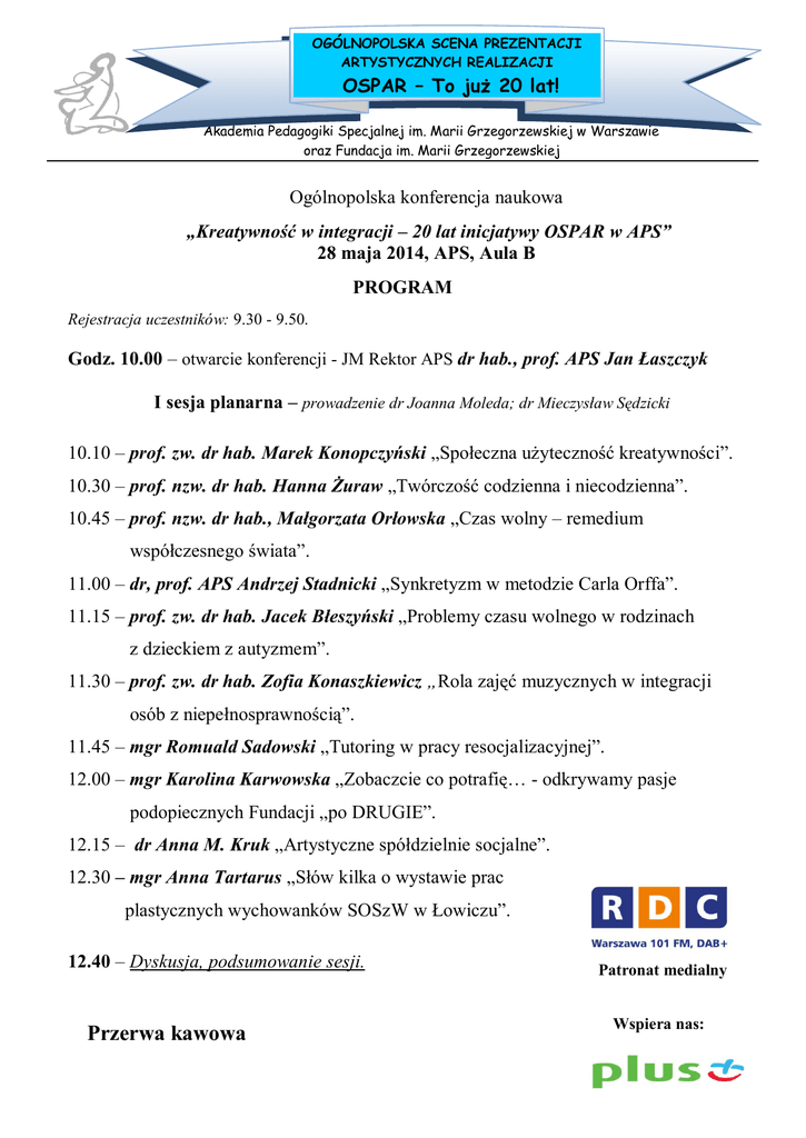 OGÓLNOPOLSKA SCENA PREZENTACJI ARTYSTYCZNYCH REALIZACJI OSPAR – To już 20 lat! ® Akademia Pedagogiki Specjalnej im. Marii Grzegorzewskiej w Warszawie oraz Fundacja im. Marii Grzegorzewskiej Ogólnopolska konferencja naukowa „Kreatywność w integracji – 20 lat inicjatywy OSPAR w APS” 28 maja 2014, APS, Aula B PROGRAM Rejestracja uczestników: 9.30 - 9.50. Godz. 10.00 – otwarcie konferencji - JM Rektor APS dr hab., prof. APS Jan Łaszczyk I sesja planarna – prowadzenie dr Joanna Moleda; dr Mieczysław Sędzicki 10.10 – prof. zw. dr hab. Marek Konopczyński „Społeczna użyteczność kreatywności”. 10.30 – prof. nzw. dr hab. Hanna Żuraw „Twórczość codzienna i niecodzienna”. 10.45 – prof. nzw. dr hab., Małgorzata Orłowska „Czas wolny – remedium współczesnego świata”. 11.00 – dr, prof. APS Andrzej Stadnicki „Synkretyzm w metodzie Carla Orffa”. 11.15 – prof. zw. dr hab. Jacek Błeszyński „Problemy czasu wolnego w rodzinach z dzieckiem z autyzmem”. 11.30 – prof. zw. dr hab. Zofia Konaszkiewicz „Rola zajęć muzycznych w integracji osób z niepełnosprawnością”. 11.45 – mgr Romuald Sadowski „Tutoring w pracy resocjalizacyjnej”. 12.00 – mgr Karolina Karwowska „Zobaczcie co potrafię… - odkrywamy pasje podopiecznych Fundacji „po DRUGIE”. 12.15 – dr Anna M. Kruk „Artystyczne spółdzielnie socjalne”. 12.30 – mgr Anna Tartarus „Słów kilka o wystawie prac plastycznych wychowanków SOSzW w Łowiczu”. 12.40 – Dyskusja, podsumowanie sesji. Przerwa kawowa Patronat medialny Wspiera nas: OGÓLNOPOLSKA SCENA PREZENTACJI ARTYSTYCZNYCH REALIZACJI OSPAR – To już 20 lat! ® Akademia Pedagogiki Specjalnej im. Marii Grzegorzewskiej w Warszawie oraz Fundacja im. Marii Grzegorzewskiej W atelier: – wystawa prac plastycznych studentów APS przygotowanych pod kierunkiem – dr Agnieszki Kwiatkowskiej-Zwolan oraz mgr sztuki Bożeny Foder „EDUKACJA, INTEGRACJA” oraz - prezentacja różnych form dorobku artystycznego i kiermasz prac wykonanych przez Wychowanków Specjalnego Ośrodka Szkolno-Wychowawczego w Łowiczu II sesja planarna – prowadzenie dr Anna M. Kruk; dr Mieczysław Sędzicki Prezentacja artystyczna 13.25 – mgr Katarzyna Kołaczyńska; mgr Marcin Szostakowski „Praca terapeuty zajęciowego na przykładzie Villi Sancta Margherita w Montefiascone oraz Domu Dziennego Pobytu samarytanin w Toruniu”. 13.40 – mgr Mariola Żeromska-Tomczyk „Talenty dzieci z niepełnoprawnością”. 13.55 – dr Agnieszka Kwiatkowska-Zwolan; mgr Bożena Foder „Integracyjny i społeczny charakter warsztatów plastycznych”. 14.10 – Diana Czyrka-Wietrzyk; Magdalena Baran „Placówki pomocowe a kreatywna integracja”. 14.25 – Dorota J. Kaczmarek „Kreatywna integracja grupy międzypokoleniowej w działaniu animacyjnym. „Pozytywnie zakręcone – tańce etniczne w kręgu”. 14.40 – mgr Marek Połynko „Z wieloletnich doświadczeń praktyka słów kilka”. 14.50 – mgr Wojciech Łaszczewski „My dla innych”. 15.00 – mgr Bartłomiej Nowacki „Artystyczna ekspresja czy społeczna aprobata? Kryteria oceny twórczości i ich kulturowe uwarunkowania”. 15.15 – mgr Lilianna Fabisińska „Było cudownie! Nigdy więcej! Refleksje jurora”. 15.25 – mgr Arkadiusz Korycki „OSPAR – to tu wszystko się zaczęło…”. 15.35 – dr Mieczysław Sędzicki „20 lat inicjatywy OSPAR w APS – refleksje pomysłodawcy” . Patronat medialny Wspiera nas: 15.45 – Dyskusja, podsumowanie sesji i zakończenie konferencji.