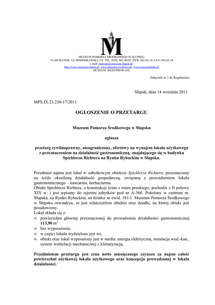 MUZEUM POMORZA ŚRODKOWEGO W SŁUPSKU 76-200 SŁUPSK UL.DOMINIKAŃSKA 5-9 TEL. (059): 842-40-81; DYR: 842-65-18; FAX: 842-65-18 e mail: [email protected]; http://www.muzeum.slupsk.pl; www.muzeum.swolowo.pl; www.muzeumkluki.pl MUZEUM REJESTROWANE Załącznik nr 1 do Regulaminu Słupsk, dnia 14 września 2011 MPŚ.IX.23.230-17/2011 OGŁOSZENIE O PRZETARGU Muzeum Pomorza Środkowego w Słupsku ogłasza przetarg cywilnoprawny, nieograniczony, ofertowy na wynajem lokalu użytkowego z przeznaczeniem na działalność gastronomiczną,, znajdującego się w budynku Spichlerzu Richtera na Rynku Rybackim w Słupsku. Przedmiot najmu jest lokal w zabytkowym obiekcie Spichlerza Richtera, przeznaczony na ściśle określoną działalność gospodarczą, związaną z prowadzeniem lokalu gastronomicznego – kawiarnia, herbaciarnia. Obiekt Spichlerza Richtera, o konstrukcji ścian z muru pruskiego, pochodzi z II połowy XIX w. i jest wpisany do rejestru zabytków pod nr A-360. Położony w centrum m. Słupska, na Rynku Rybackim, na działce nr ewid. 181/1. Muzeum Pomorza Środkowego w Słupsku oświadcza, że jest właścicielem obiektu oraz działki, na której obiekt jest posadowiony. Lokal składa się z: • powierzchni głównej przeznaczonej do prowadzenia działalności gastronomicznej 113,90 m2 • bez wyposażenia, • w części lokalu wydzielone jest wc, • obiekt oraz lokal wyposażony jest w media: energia elektryczna, instalacja wod.-kan., system wentylacji mechanicznej z klimatyzacją. Przedmiotem przetargu jest cena netto miesięcznego czynszu za najem całość powierzchni użytkowej lokalu użytkowego oraz koncepcja prowadzonej w lokalu działalności. Cena wywoławcza miesięcznego czynszu netto za najem powierzchni całkowitej wynosi 2.278,00 zł, tj. 20,00 zł za 1m2 powierzchni. Do ceny czynszu będzie doliczona stawka podatku VAT. Ustalony czynsz płatny do 10 dnia każdego miesiąca kalendarzowego za dany miesiąc z góry. Ustalony czynsz będzie waloryzowany o stopę inflacji każdego roku od dnia 1 lutego proporcjonalnie do wskaźnika wzrostu cen towarów i usług konsumpcyjnych ogłoszonego we właściwym Dzienniku Urzędowym. Oprócz czynszu wymienionego Najemca będzie pokrywał pełne koszty związane z eksploatacją przedmiotu najmu a to: energię elektryczną, wodę i ścieki, wywóz nieczystości, energię cieplną oraz należność z tytułu podatku od nieruchomości. Pisemny przetarg ofertowy odbędzie się w dniu 30 września 2011 r. o godzinie 10:45 w siedzibie Muzeum Pomorza Środkowego w Słupsku, pokój Nr 8 (Gabinet Dyrektora). Oferty w formie pisemnej, w zamkniętych kopertach nieidentyfikujących oferenta, należy składać w terminie do dnia 30 września 2011 r do godziny 10:30 w siedzibie Muzeum Pomorza Środkowego w Słupsku, w pokoju nr 7 (sekretariat). Oferty złożone po upływie terminu przewidzianego na składanie ofert nie będą przyjmowane. Niedopuszczalna jest zmiana w ofertach już złożonych. Wadium, z dopiskiem „przetarg na lokal gastronomiczny w Spichlerzu Richtera, nr sprawy: MPŚ.IX.23.230-17/2011” w wysokości 1.500,00 zł (słownie: jeden tysiąc pięćset złotych) należy wpłacić do dnia 29 września 2011 r. przelewem na konto Zamawiającego w Bank Spółdzielczy w Ustce nr 15 9315 0004 0050 2445 2000 0010 Oferta powinna zawierać pod rygorem odrzucenia: • pisemną koncepcję funkcjonowania lokalu gastronomicznego, • potwierdzenie wpłaty wadium, • oświadczenie, że wnioskodawca akceptuje warunki najmu, • oferowaną wysokość czynszu najmu, • oświadczenie, że lokal zostanie zagospodarowany od dnia 1 listopada 2011r. • ważne na dzień składania ofert zaświadczenie o prowadzonej działalności gospodarczej, wydane nie wcześniej niż 6 m-cy do dnia składania ofert, • zaświadczenie potwierdzające nadanie nr NIP i REGON, • ważne na dzień składania ofert zaświadczenie z Urzędu Skarbowego potwierdzające uiszczenie w terminie należności z tytułu podatku, • ważne na dzień składanie ofert zaświadczenie z ZUS o nie zaleganiu w opłacaniu składek na ubezpieczenie społeczne. W/w zaświadczenia muszą być wydane przez uprawnione organy j.w. nie wcześniej niż 3 m-ce do dnia składania ofert. Umowa zostanie zawarta na czas nieokreślony, od dnia 1 listopada 2011r. Najemca musi uzyskać zgodę Wynajmującego na proponowany sposób wystroju lokalu i wyposażenia. Najemca wyraża zgodę na organizowanie przez Wynajmującego w wynajmowanym lokalu działalności kulturalnej (spotkania autorskie, koncerty, wystawy). 2 Wygrywający przetarg zobowiązany jest do zawarcia umowy najmu w terminie do 14 dni od daty zakończenia przetargu, po uprzednim wpłaceniu kaucji zabezpieczającej należności Wynajmującego, w wysokości czynszu brutto za trzy pełne okresy płatności – wg stawki określonej w przetargu. W przypadku gdy wygrywający przetarg nie dokona wpłaty kaucji, lub nie zawrze umowy w wyznaczonym terminie, wpłacone przez oferenta wadium przepada i ogłasza się ponowny przetarg. Pozostałym uczestnikom przetargu wadium zwraca się w terminie niezwłocznym licząc od dnia przetargu. Wygrywa oferent, który zaoferuje najwyższą cenę miesięcznego czynszu najmu za całość powierzchni lokalu oraz przedstawi najciekawsza koncepcję prowadzonej działalności w wynajmowanym lokalu. Ogłaszający ma prawo uznania, bez podania przyczyny, że przetarg nie dał rezultatu. Przetarg może być odwołany bez podania przyczyny lub unieważniony w każdym momencie. Unieważnienie przetargu wymaga uzasadnienia. Lokal można oglądać po wcześniejszym uzgodnieniu telefonicznym. Szczegółowych informacji w sprawie przetargu udziela Kierownik Działu Administracyjnego Muzeum Pomorza Środkowego w Słupsku P. Ewa Pawlukiewicz, tel. 59 842 40 81/82 wew. 320. Ogłoszenie, regulamin przetargu oraz istotne postanowienia przyszłej umowy najmu można pobrać ze strony internetowej Muzeum Pomorza Środkowego w Słup