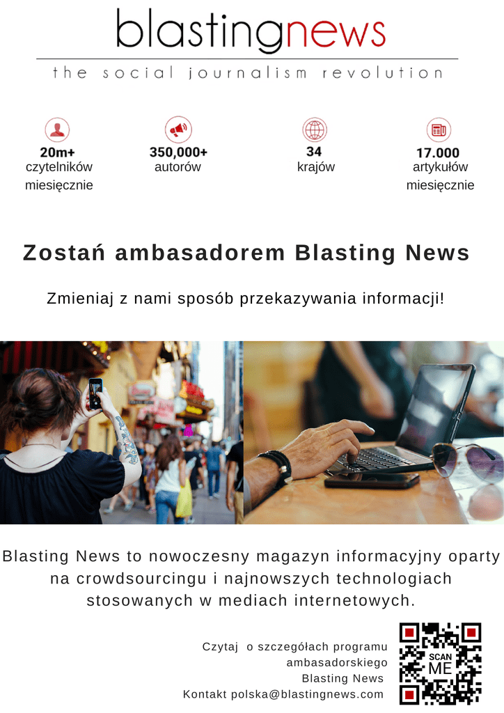 czytelników miesięcznie autorów krajów artykułów miesięcznie Zostań ambasadorem Blasting News Zmieniaj z nami sposób przekazywania informacji! Blasting News to nowoczesny magazyn informacyjny oparty na crowdsourcingu i najnowszych technologiach stosowanych w mediach internetowych. Czytaj o szczegółach programu ambasadorskiego Blasting News Kontakt [email protected]